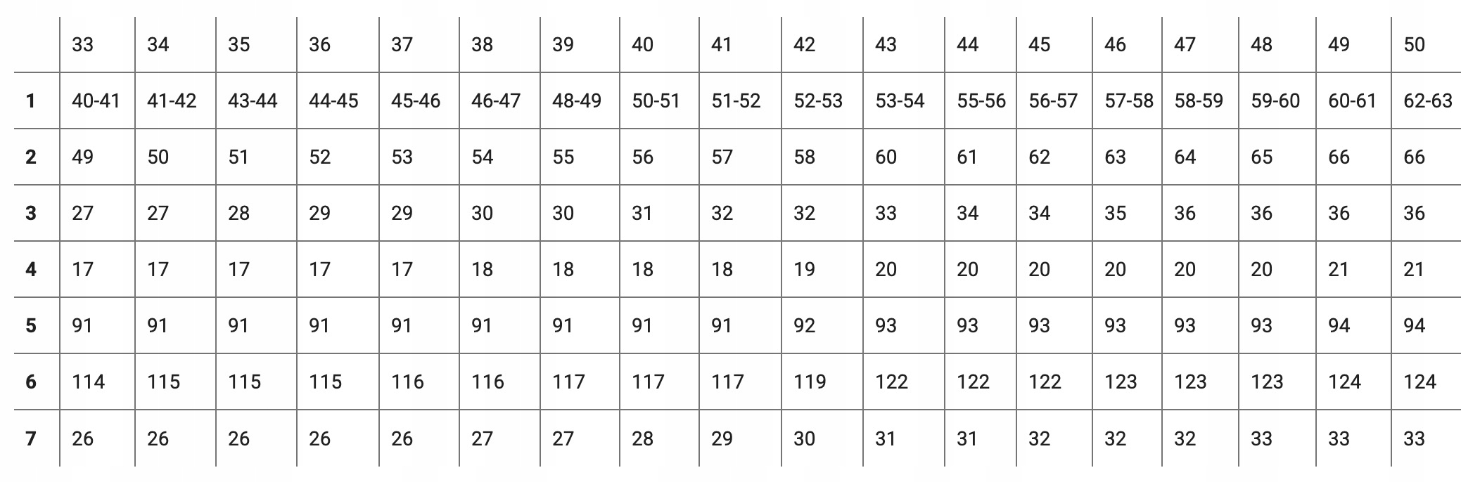 rozmiarszerokość w pasie (cm)szerokość w biodrach (cm)szerokość w udzie (cm)szerokość na dole nogawki (cm)długość nogawki od kroku (cm)długość nogawki zewnętrzna (cm)wysokość pasa (cm)