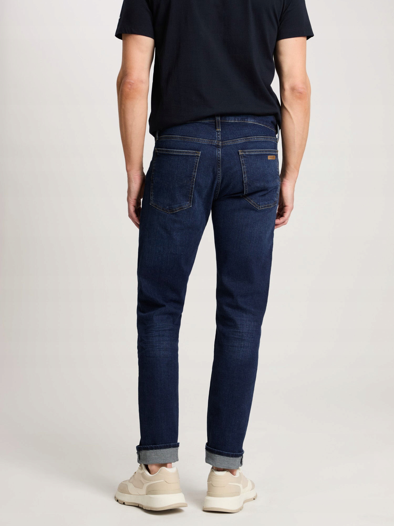 - Naszywka z logo firmy i typowe dla spodni jeansowych mocne, podwójne przeszycia