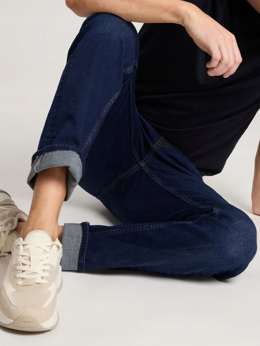 - Naszywka z logo firmy i typowe dla spodni jeansowych mocne, podwójne przeszycia