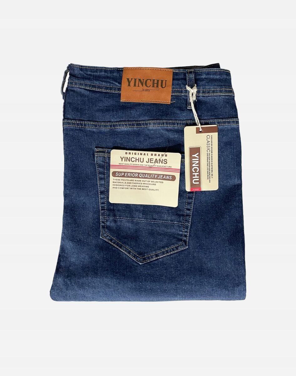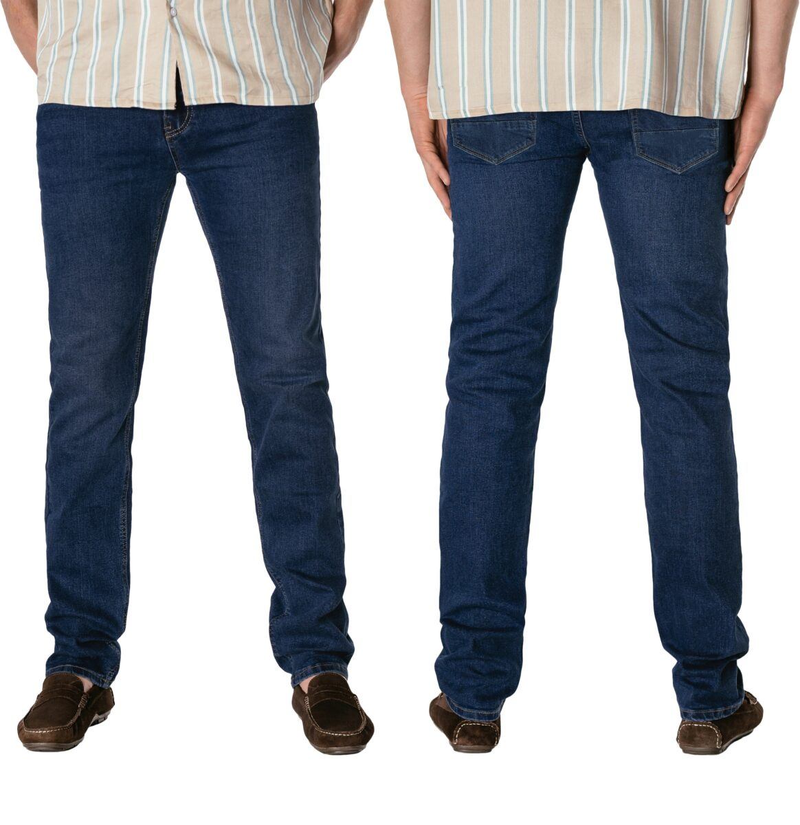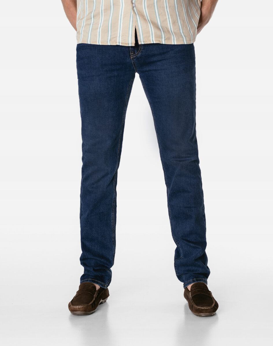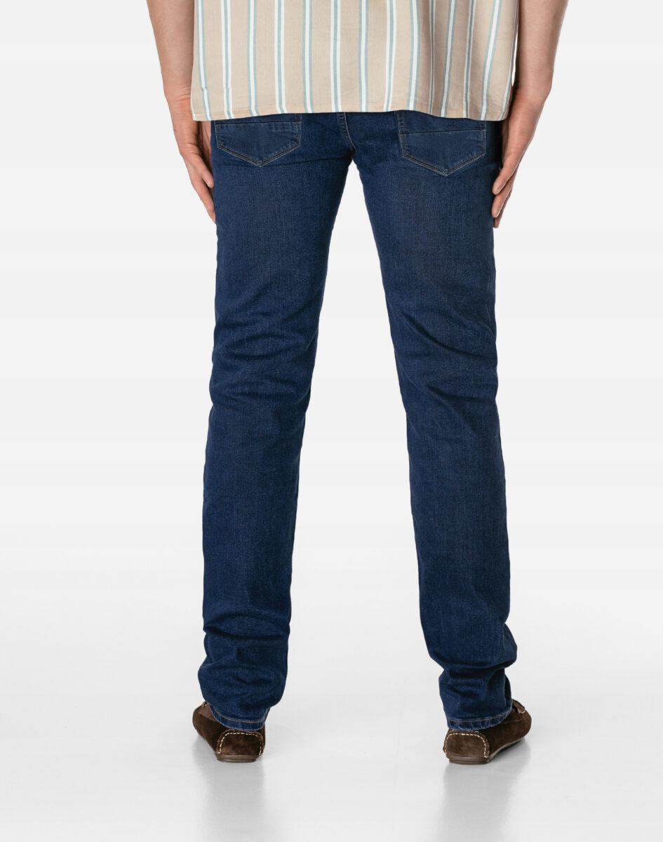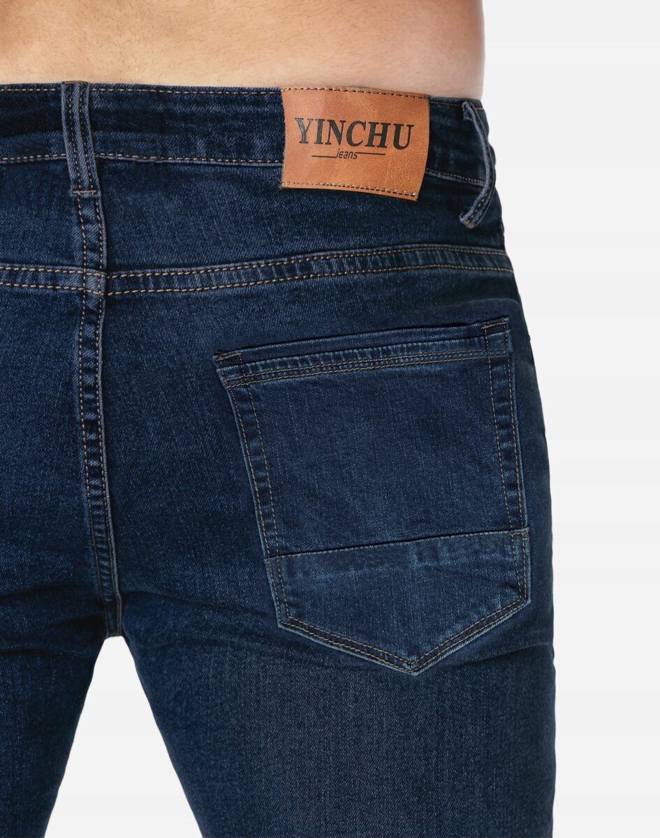 Klasyczne i ponadczasowe spodnie męskie jeansowe model 9639#, umiarkowanie swobodne w biodrach, o prostych, smukłych nogawkach to jeden z najczęściej wybieranych przez mężczyzn modeli spodni. Wykonane z wysokiej jakości sprężystej, trwałej i mocnej tkaniny jeansowej w kolorze granatowym „Dark Blue”, dzięki niewielkiemu dodatkowi spandexu (lycra) wyjątkowo wygodnej w użytkowaniu. Niewielki dodatek lycry sprawia że spodnie są bardziej elastyczne, dobrze dopasowują się do sylwetki, i są bardzo komfortowe w użytkowaniu. Łatwo się je zakłada i są znacznie wygodniejsze od jeansów, które lycry nie mają. Poza tym bawełna ma tendencję do kurczenia się w praniu, dlatego lycra sprawia, że spodnie są wyjątkowo praktyczne i można je bez problemu założyć po wysuszeniu. Pozwalają na pełną swobodę ruchów, co daje wygodę przy siadaniu i zapewnia ogromny komfort noszenia. Zapinane na kryty zamek błyskawiczny i metalowy guzik sygnowany logiem firmy. Z przodu mają dwie zaokrąglone kieszonki oraz jedną mniejszą tzw. bilonówkę, a na tyle klasyczne naszywane kieszenie jak w typowych spodniach jeansowych. Najbardziej podatne na uszkodzenia miejsca wzmocnione są podwójnymi przeszyciami oraz metalowymi nitami. W pasie szlufki umożliwiające stylizacje z paskiem.