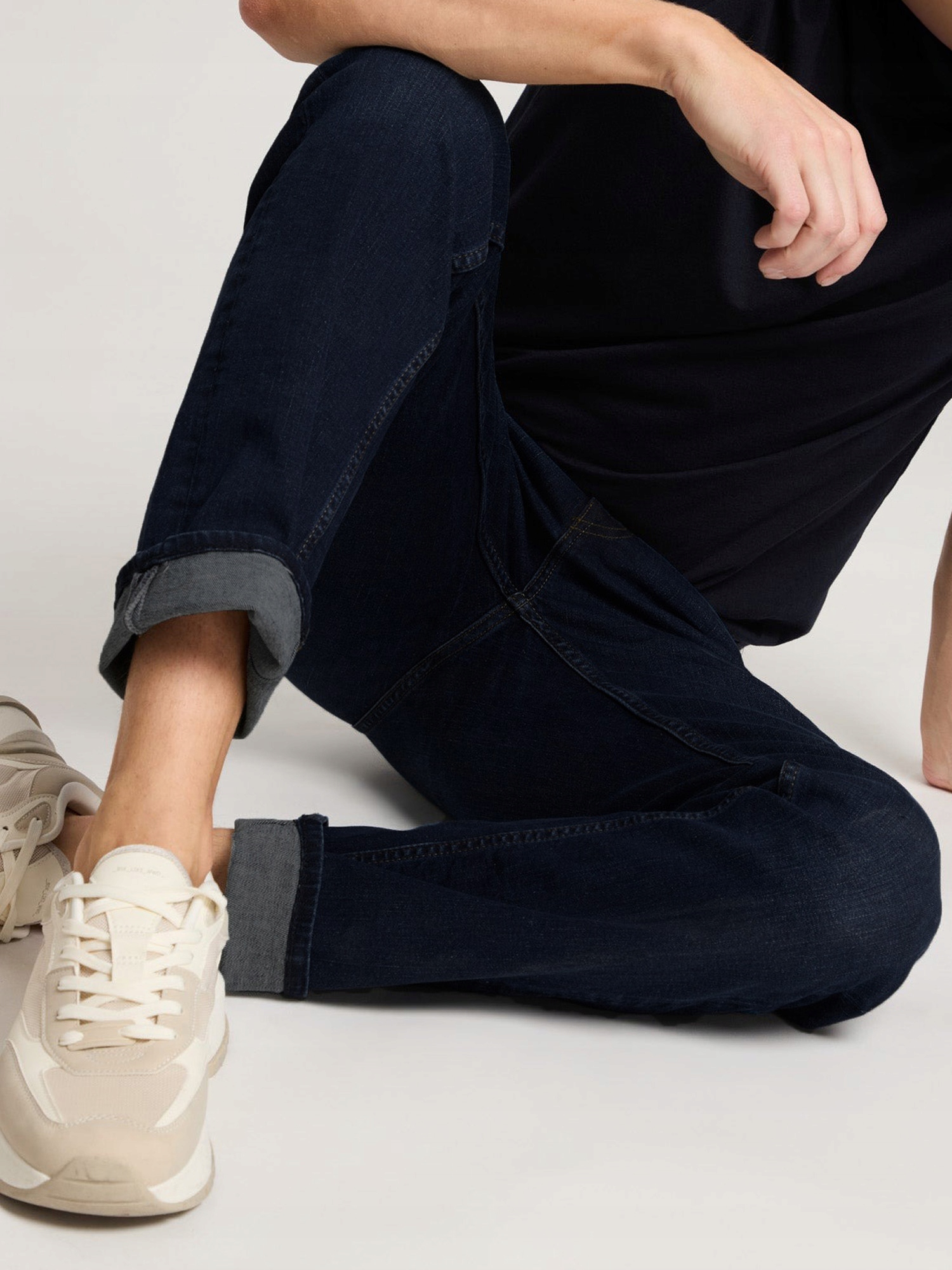 Klasyczne i ponadczasowe spodnie męskie jeansowe model 210/2#, umiarkowanie swobodne w biodrach, o prostych, smukłych nogawkach to jeden z najczęściej wybieranych przez mężczyzn modeli spodni. Wykonane z wysokiej jakości sprężystej, trwałej i mocnej tkaniny jeansowej w ciemnym kolorze grafitowym "Midnight Blue" dzięki niewielkiemu dodatkowi lycry (stretch) wyjątkowo wygodnej w użytkowaniu. Niewielki dodatek lycry sprawia że spodnie są bardziej elastyczne, dobrze dopasowują się do sylwetki, i są bardzo komfortowe w użytkowaniu. Łatwo się je zakłada i są znacznie wygodniejsze od jeansów, które lycry nie mają. Poza tym bawełna ma tendencję do kurczenia się w praniu, dlatego lycra sprawia, że spodnie są wyjątkowo praktyczne i można je bez problemu założyć po wysuszeniu. Pozwalają na pełną swobodę ruchów, co daje wygodę przy siadaniu i zapewnia ogromny komfort noszenia. Zapinane na kryty zamek błyskawiczny i metalowy guzik sygnowany logiem firmy. Z przodu mają dwie zaokrąglone kieszonki oraz jedną mniejszą tzw. bilonówkę, a na tyle klasyczne naszywane kieszenie jak w typowych spodniach jeansowych. Najbardziej podatne na uszkodzenia miejsca wzmocnione są podwójnymi przeszyciami oraz metalowymi nitami. W pasie szlufki umożliwiające stylizacje z paskiem.