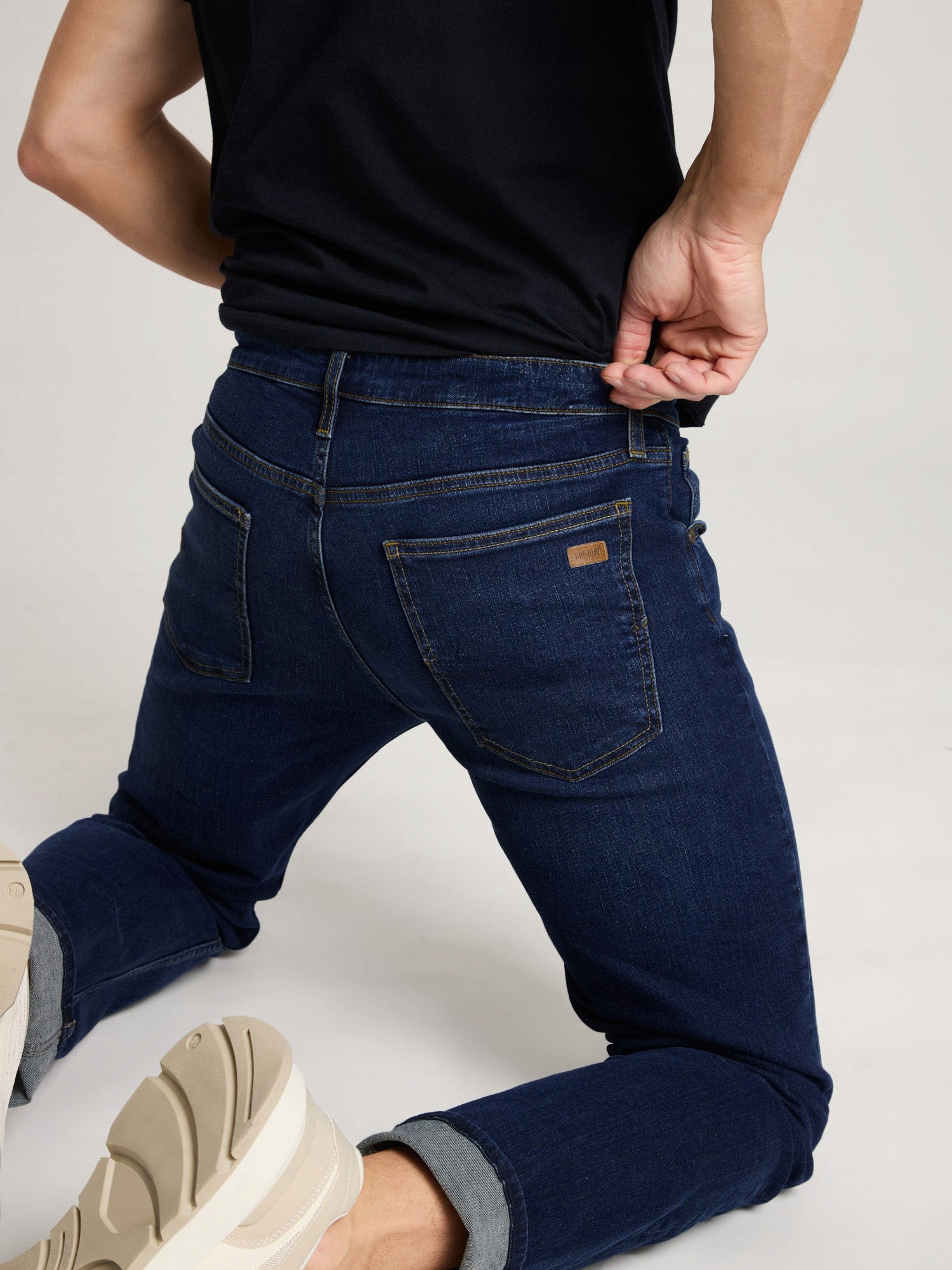 • Naszywka z logo firmy i typowe dla spodni jeansowych mocne, podwójne przeszycia