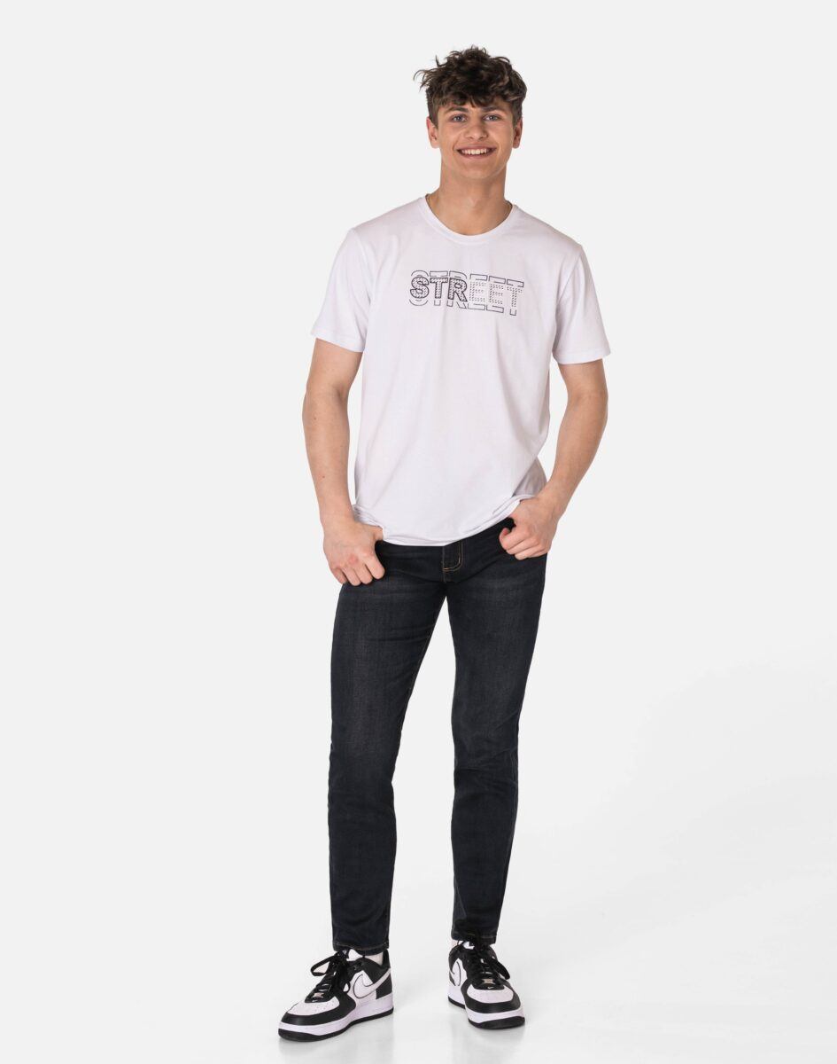 Grafitowe spodnie jeansowe ze standardowym stanem i wąską nogawką typu "rurka" to jeden z najczęściej wybieranych modeli spodni. Niesłychanie wygodne i praktyczne podczas użytkowania, wykonane z wysokiej jakości solidnej, trwałej i mocnej tkaniny bawełnianej z dodatkiem spandexu (stretch). Niewielki dodatek spandexu ( stretch) sprawia że spodnie są bardziej elastyczne, dobrze dopasowują się do sylwetki, i są bardzo komfortowe w użytkowaniu. Łatwo się je zakłada i są znacznie wygodniejsze od jeansów, które lycry nie mają. Poza tym bawełna ma tendencję do kurczenia się w praniu, dlatego stretch sprawia, że spodnie są wyjątkowo praktyczne i można je bez problemu założyć po wysuszeniu. Pozwalają na pełną swobodę ruchów, co daje wygodę przy siadaniu i zapewnia ogromny komfort noszenia. Zapinane na kryty zamek błyskawiczny i metalowy guzik sygnowany logiem firmy. Z przodu mają dwie zaokrąglone kieszonki oraz jedną mniejszą tzw. bilonówkę, a na tyle klasyczne naszywane kieszenie jak w typowych spodniach jeansowych. Najbardziej podatne na uszkodzenia miejsca wzmocnione są dodatkowymi przeszyciami oraz metalowymi nitami. W pasie szlufki umożliwiające stylizacje z paskiem.
