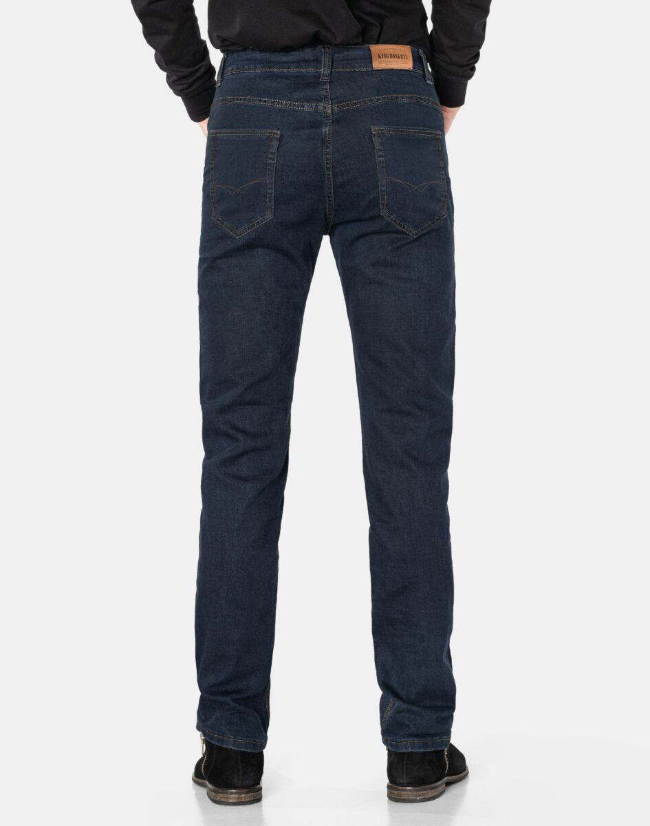 Klasyczne i ponadczasowe spodnie męskie jeansowe model TM2#, umiarkowanie swobodne w biodrach, o prostych, smukłych nogawkach to jeden z najczęściej wybieranych przez mężczyzn modeli spodni. Wykonane z wysokiej jakości sprężystej, trwałej i mocnej tkaniny jeansowej w kolorze granatowym „Dark Blue” dzięki niewielkiemu dodatkowi elastanu (lycra) wyjątkowo wygodnej w użytkowaniu. Niewielki dodatek lycry sprawia że spodnie są bardziej elastyczne, dobrze dopasowują się do sylwetki, i są bardzo komfortowe w użytkowaniu. Łatwo się je zakłada i są znacznie wygodniejsze od jeansów, które lycry nie mają. Poza tym bawełna ma tendencję do kurczenia się w praniu, dlatego lycra sprawia, że spodnie są wyjątkowo praktyczne i można je bez problemu założyć po wysuszeniu. Pozwalają na pełną swobodę ruchów, co daje wygodę przy siadaniu i zapewnia ogromny komfort noszenia. Zapinane na kryty zamek błyskawiczny i metalowy guzik sygnowany logiem firmy. Z przodu mają dwie zaokrąglone kieszonki oraz jedną mniejszą tzw. bilonówkę, a na tyle klasyczne naszywane kieszenie jak w typowych spodniach jeansowych. Najbardziej podatne na uszkodzenia miejsca wzmocnione są podwójnymi przeszyciami oraz metalowymi nitami. W pasie szlufki umożliwiające stylizacje z paskiem.