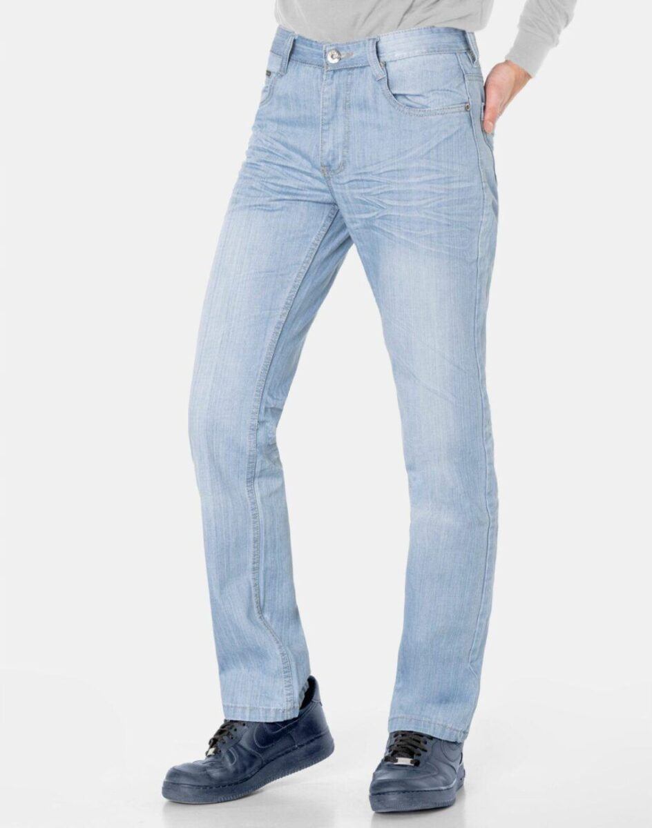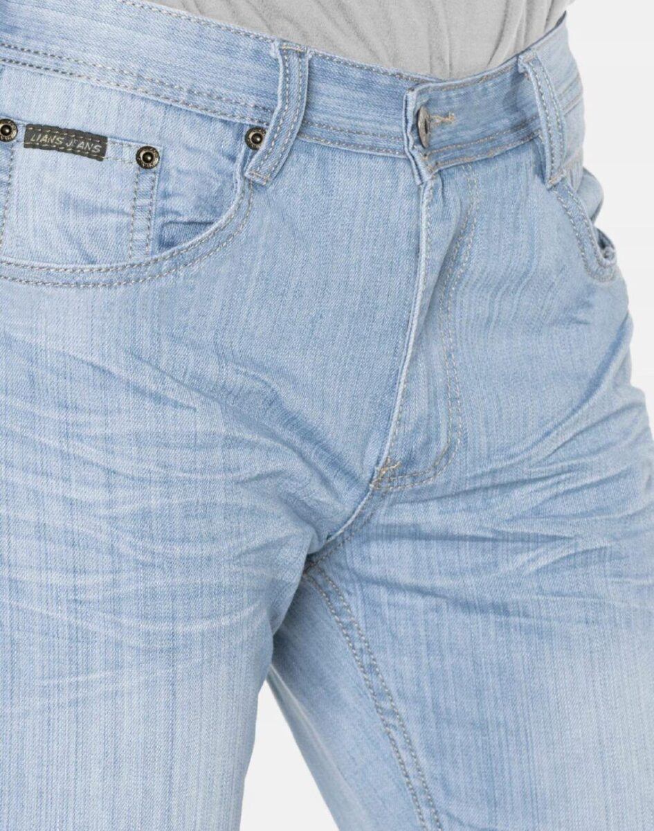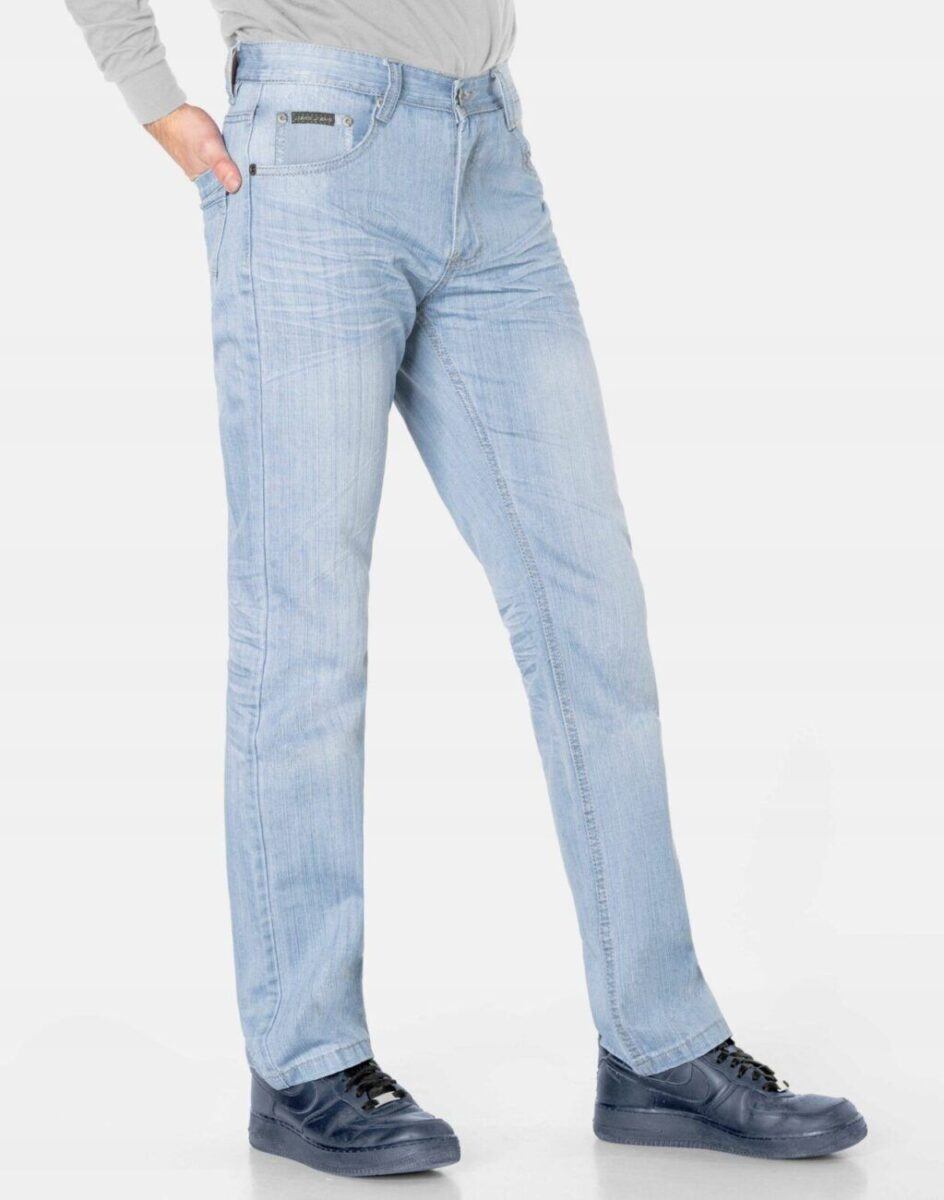 Jeansy męskie model 121 z fabrycznym efektem znoszonego, zniszczonego jeansu „used-look”, w procesie produkcji poddane zostały specjalnym zabiegom postarzającym materiał polegającym to na wycieraniu, wielokrotnym wypieraniu barwnika i tworzeniu efektownych pomięć i przetarć. Wykonane z wysokiej jakości gęstej, trwałej i mocnej tkaniny jeansowej „Denim Light Blue” z modnym efektem sprania i przetarciami w nieśmiertelnym stylu „Vintage”. Efektowne rozjaśnienia i wytarcia mają na celu wywołanie tak modnego efektu starych, długo noszonych, zużytych jeansów. Zapinane na kryty zamek błyskawiczny i metalowy guzik sygnowany logiem firmy. Z przodu mają dwie kieszonki zaokrąglone + bilonówka, a na tyle klasyczne kieszenie naszywane jak w typowych spodniach jeansowych. W pasie szlufki umożliwiające stylizacje z paskiem. Najbardziej podatne na uszkodzenia miejsca wzmocnione są dodatkowymi przeszyciami oraz firmowymi nitami.