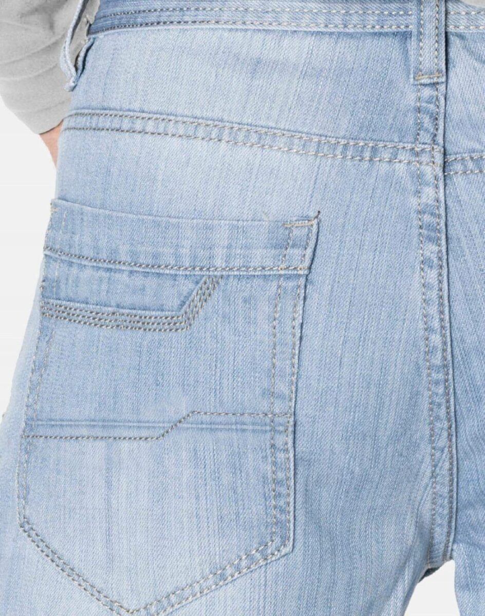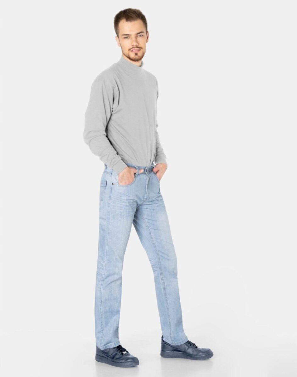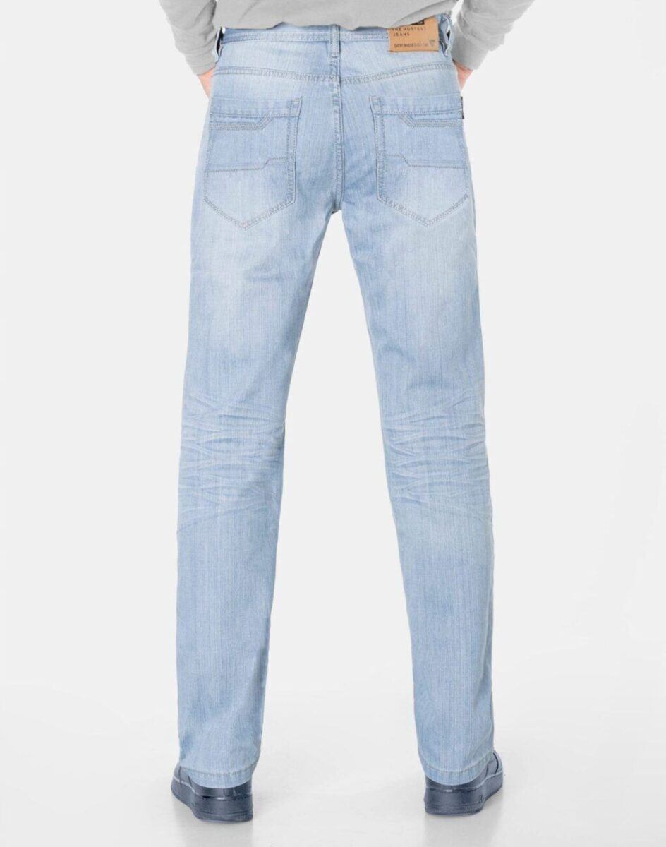Jeansy męskie model 121 z fabrycznym efektem znoszonego, zniszczonego jeansu „used-look”, w procesie produkcji poddane zostały specjalnym zabiegom postarzającym materiał polegającym to na wycieraniu, wielokrotnym wypieraniu barwnika i tworzeniu efektownych pomięć i przetarć. Wykonane z wysokiej jakości gęstej, trwałej i mocnej tkaniny jeansowej „Denim Light Blue” z modnym efektem sprania i przetarciami w nieśmiertelnym stylu „Vintage”. Efektowne rozjaśnienia i wytarcia mają na celu wywołanie tak modnego efektu starych, długo noszonych, zużytych jeansów. Zapinane na kryty zamek błyskawiczny i metalowy guzik sygnowany logiem firmy. Z przodu mają dwie kieszonki zaokrąglone + bilonówka, a na tyle klasyczne kieszenie naszywane jak w typowych spodniach jeansowych. W pasie szlufki umożliwiające stylizacje z paskiem. Najbardziej podatne na uszkodzenia miejsca wzmocnione są dodatkowymi przeszyciami oraz firmowymi nitami.