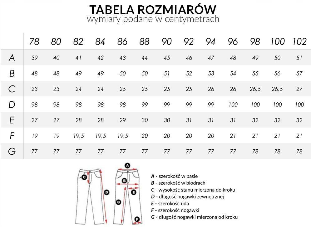 rozmiarszerokość w pasie (cm)szerokość w biodrach (cm)szerokość w udzie (cm)szerokość na dole nogawki (cm)długość nogawki od kroku (cm)długość nogawki zewnętrzna (cm)wysokość pasa (cm)