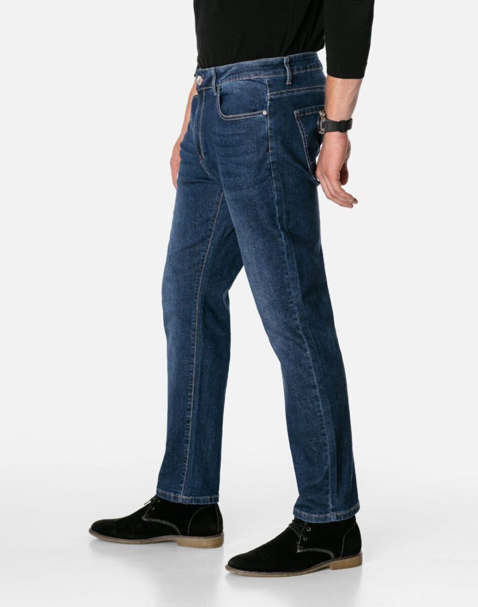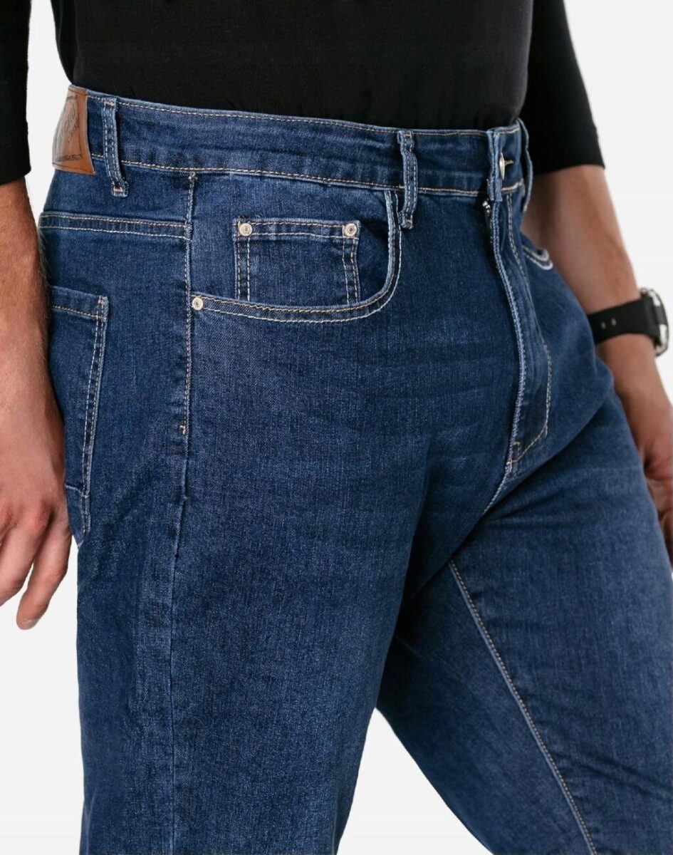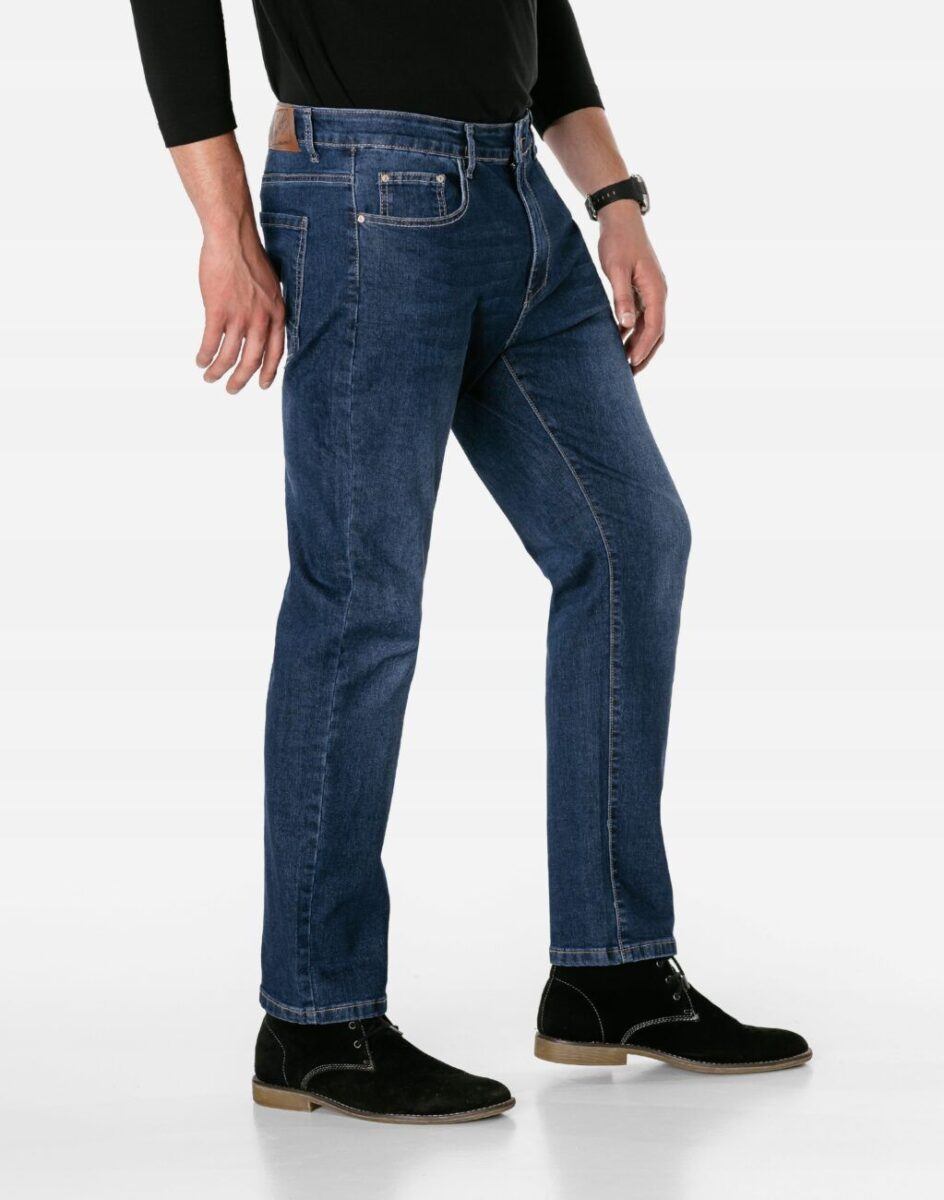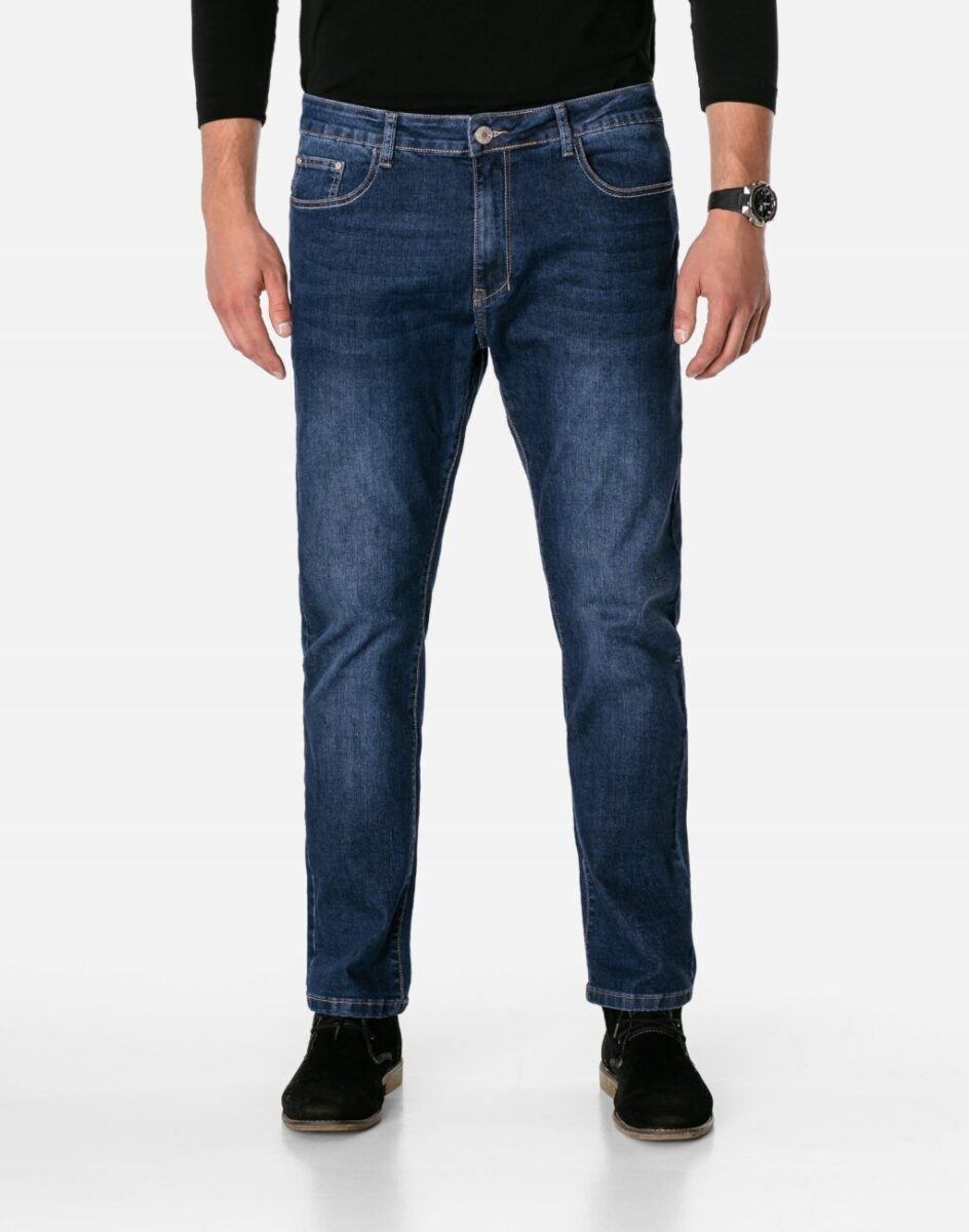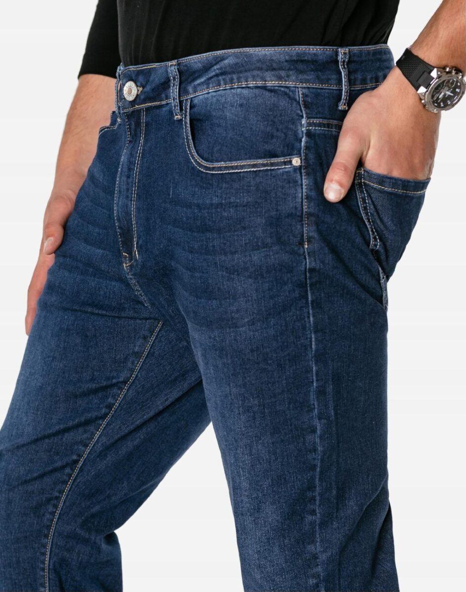 Klasyczne męskie spodnie jeansowe ze standardowym stanem i lekko zwężaną nogawką to jeden z najczęściej wybieranych przez mężczyzn modeli spodni. Wykonane z wysokiej jakości, gęstej, trwałej i mocnej tkaniny jeansowej o jednolitym granatowym wybarwieniu „Dark Blue” z delikatnymi przetarciami. Niewielki dodatek spandexu (lycra) sprawia, że spodnie są bardziej elastyczne, dobrze dopasowują się do sylwetki, i są bardzo komfortowe w użytkowaniu. Łatwo się je zakłada i są znacznie wygodniejsze od jeansów, które lycry nie mają. Poza tym bawełna ma tendencję do kurczenia się w praniu, dlatego lycra sprawia, że spodnie są wyjątkowo praktyczne i można je bez problemu założyć po wysuszeniu. Pozwalają na pełną swobodę ruchów, co daje wygodę przy siadaniu i zapewnia ogromny komfort noszenia. Zapinane na kryty zamek błyskawiczny i metalowy guzik sygnowany logiem firmy. Z przodu mają dwie zaokrąglone kieszonki oraz jedną mniejszą tzw. bilonówkę, a na tyle klasyczne naszywane kieszenie jak w typowych spodniach jeansowych. Najbardziej podatne na uszkodzenia miejsca wzmocnione są dodatkowymi przeszyciami oraz metalowymi nitami. W pasie szlufki umożliwiające stylizacje z paskiem.