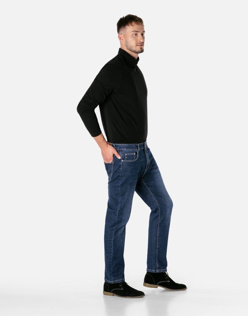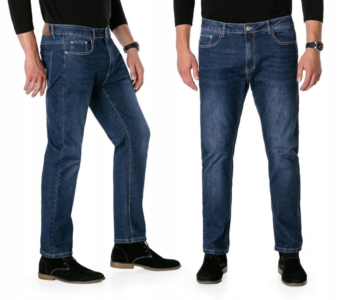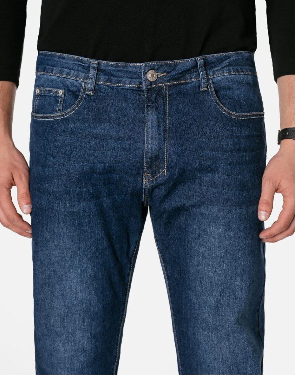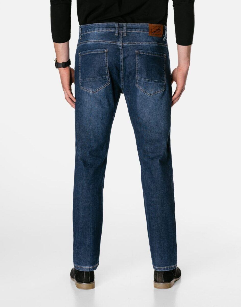 Klasyczne męskie spodnie jeansowe ze standardowym stanem i lekko zwężaną nogawką to jeden z najczęściej wybieranych przez mężczyzn modeli spodni. Wykonane z wysokiej jakości, gęstej, trwałej i mocnej tkaniny jeansowej o jednolitym granatowym wybarwieniu „Dark Blue” z delikatnymi przetarciami. Niewielki dodatek spandexu (lycra) sprawia, że spodnie są bardziej elastyczne, dobrze dopasowują się do sylwetki, i są bardzo komfortowe w użytkowaniu. Łatwo się je zakłada i są znacznie wygodniejsze od jeansów, które lycry nie mają. Poza tym bawełna ma tendencję do kurczenia się w praniu, dlatego lycra sprawia, że spodnie są wyjątkowo praktyczne i można je bez problemu założyć po wysuszeniu. Pozwalają na pełną swobodę ruchów, co daje wygodę przy siadaniu i zapewnia ogromny komfort noszenia. Zapinane na kryty zamek błyskawiczny i metalowy guzik sygnowany logiem firmy. Z przodu mają dwie zaokrąglone kieszonki oraz jedną mniejszą tzw. bilonówkę, a na tyle klasyczne naszywane kieszenie jak w typowych spodniach jeansowych. Najbardziej podatne na uszkodzenia miejsca wzmocnione są dodatkowymi przeszyciami oraz metalowymi nitami. W pasie szlufki umożliwiające stylizacje z paskiem.