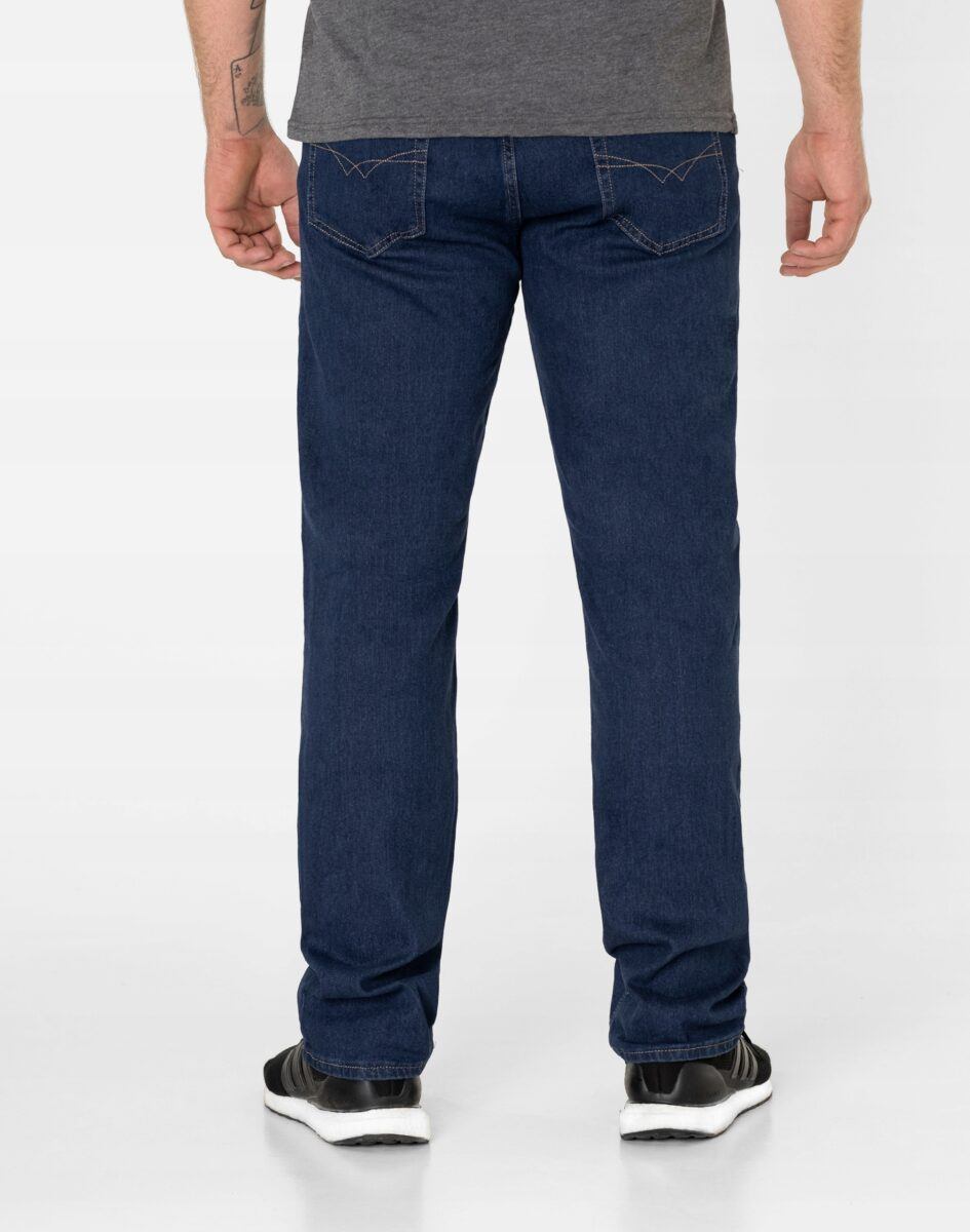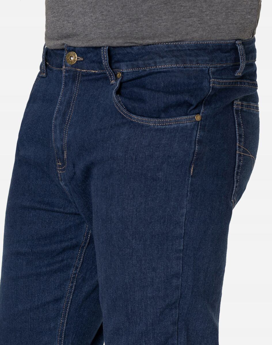 Klasyczne i ponadczasowe spodnie męskie jeansowe model 23161#, umiarkowanie swobodne w biodrach, o prostych, smukłych nogawkach to jeden z najczęściej wybieranych przez mężczyzn modeli spodni. Wykonane z wysokiej jakości sprężystej, trwałej i mocnej tkaniny jeansowej w kolorze granatowym „Dark Blue” dzięki niewielkiemu dodatkowi elastanu (lycra) wyjątkowo wygodnej w użytkowaniu. Niewielki dodatek lycry sprawia że spodnie są bardziej elastyczne, dobrze dopasowują się do sylwetki, i są bardzo komfortowe w użytkowaniu. Łatwo się je zakłada i są znacznie wygodniejsze od jeansów, które lycry nie mają. Poza tym bawełna ma tendencję do kurczenia się w praniu, dlatego lycra sprawia, że spodnie są wyjątkowo praktyczne i można je bez problemu założyć po wysuszeniu. Pozwalają na pełną swobodę ruchów, co daje wygodę przy siadaniu i zapewnia ogromny komfort noszenia. Zapinane na kryty zamek błyskawiczny i metalowy guzik sygnowany logiem firmy. Z przodu mają dwie zaokrąglone kieszonki oraz jedną mniejszą tzw. bilonówkę, a na tyle klasyczne naszywane kieszenie jak w typowych spodniach jeansowych. Najbardziej podatne na uszkodzenia miejsca wzmocnione są podwójnymi przeszyciami oraz metalowymi nitami. W pasie szlufki umożliwiające stylizacje z paskiem.