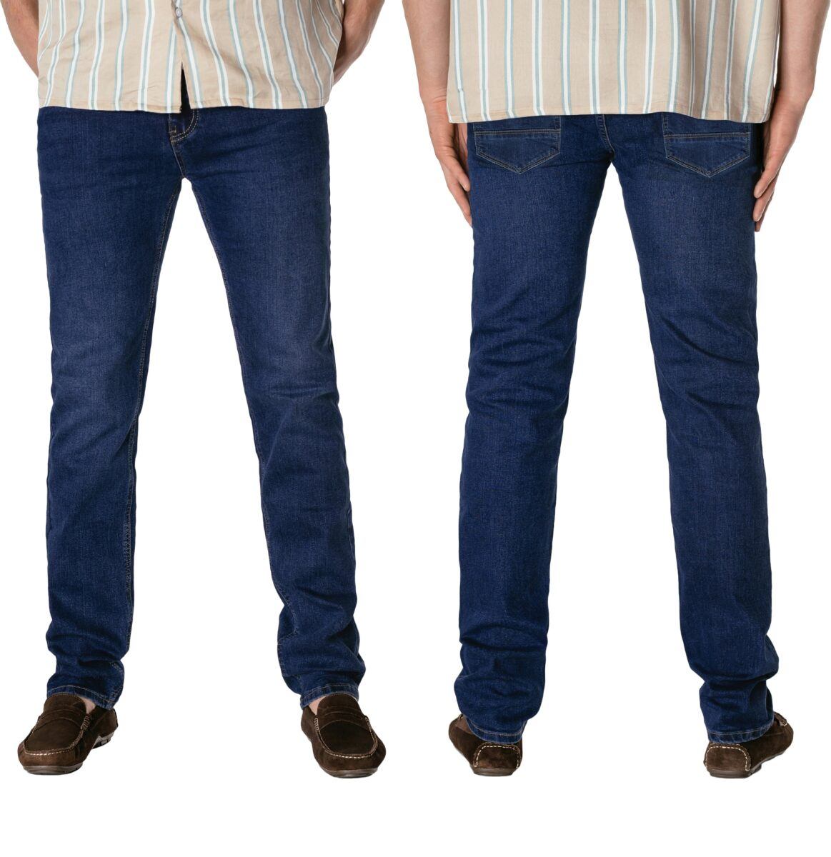 Klasyczne i ponadczasowe spodnie męskie jeansowe model N82#, umiarkowanie swobodne w biodrach, o prostych, smukłych nogawkach to jeden z najczęściej wybieranych przez mężczyzn modeli spodni. Wykonane z wysokiej jakości sprężystej, trwałej i mocnej tkaniny jeansowej w kolorze granatowym „Dark Blue”, dzięki niewielkiemu dodatkowi poliestru (lycra) wyjątkowo wygodnej w użytkowaniu. Niewielki dodatek lycry sprawia że spodnie są bardziej elastyczne, dobrze dopasowują się do sylwetki, i są bardzo komfortowe w użytkowaniu. Łatwo się je zakłada i są znacznie wygodniejsze od jeansów, które lycry nie mają. Poza tym bawełna ma tendencję do kurczenia się w praniu, dlatego lycra sprawia, że spodnie są wyjątkowo praktyczne i można je bez problemu założyć po wysuszeniu. Pozwalają na pełną swobodę ruchów, co daje wygodę przy siadaniu i zapewnia ogromny komfort noszenia. Zapinane na kryty zamek błyskawiczny i metalowy guzik sygnowany logiem firmy. Z przodu mają dwie zaokrąglone kieszonki oraz jedną mniejszą tzw. bilonówkę, a na tyle klasyczne naszywane kieszenie jak w typowych spodniach jeansowych. Najbardziej podatne na uszkodzenia miejsca wzmocnione są podwójnymi przeszyciami oraz metalowymi nitami. W pasie szlufki umożliwiające stylizacje z paskiem.