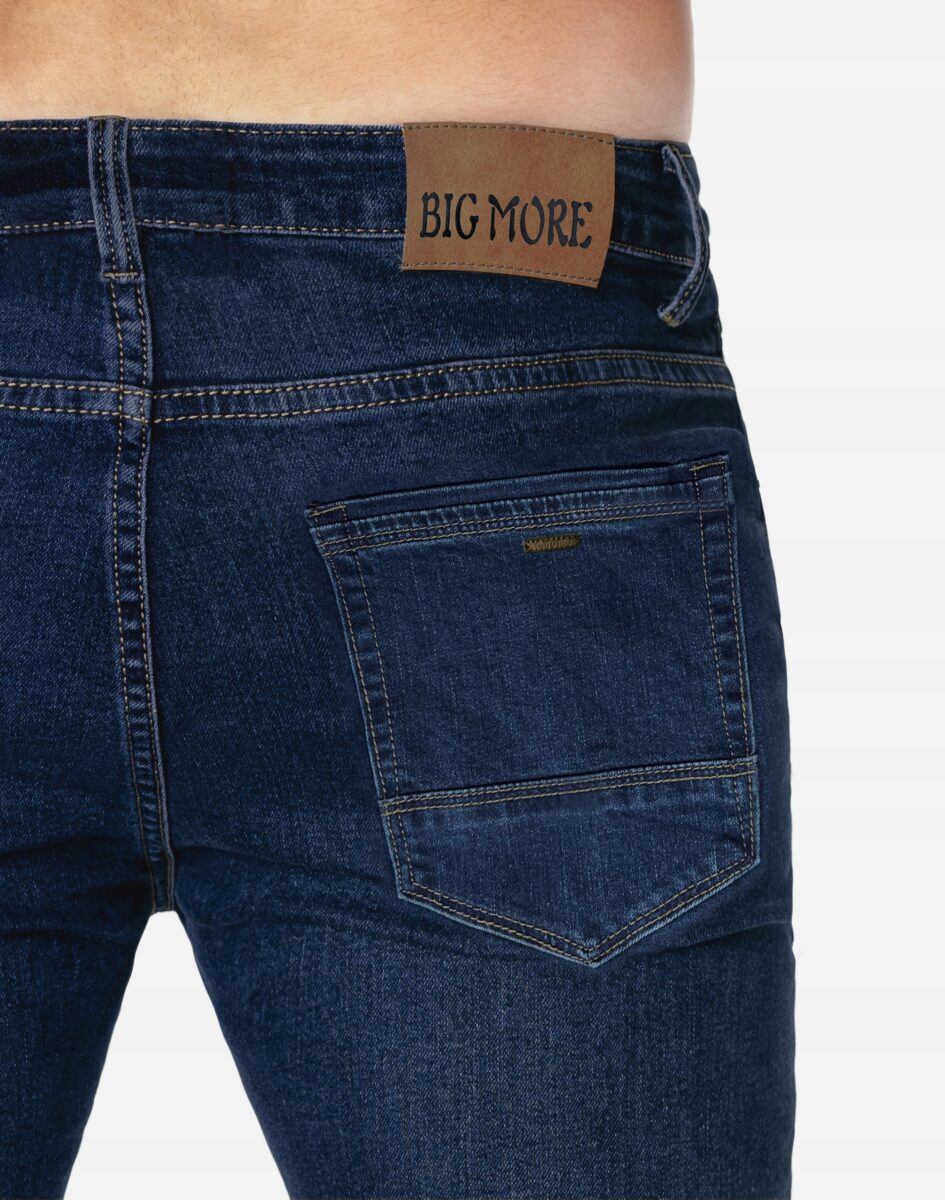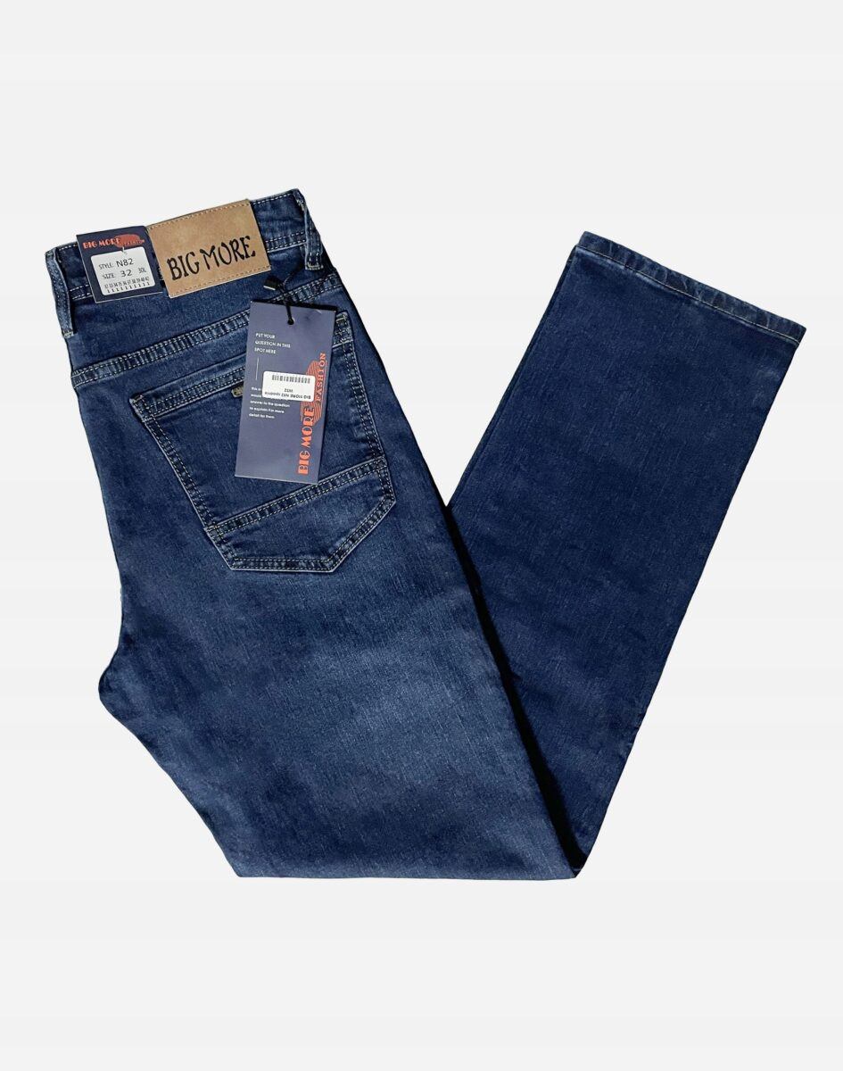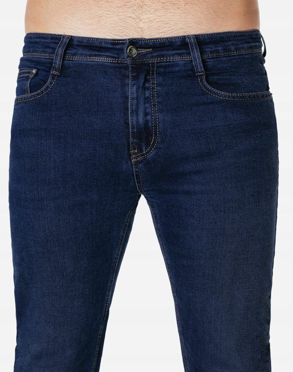 Klasyczne i ponadczasowe spodnie męskie jeansowe model N82#, umiarkowanie swobodne w biodrach, o prostych, smukłych nogawkach to jeden z najczęściej wybieranych przez mężczyzn modeli spodni. Wykonane z wysokiej jakości sprężystej, trwałej i mocnej tkaniny jeansowej w kolorze granatowym „Dark Blue”, dzięki niewielkiemu dodatkowi poliestru (lycra) wyjątkowo wygodnej w użytkowaniu. Niewielki dodatek lycry sprawia że spodnie są bardziej elastyczne, dobrze dopasowują się do sylwetki, i są bardzo komfortowe w użytkowaniu. Łatwo się je zakłada i są znacznie wygodniejsze od jeansów, które lycry nie mają. Poza tym bawełna ma tendencję do kurczenia się w praniu, dlatego lycra sprawia, że spodnie są wyjątkowo praktyczne i można je bez problemu założyć po wysuszeniu. Pozwalają na pełną swobodę ruchów, co daje wygodę przy siadaniu i zapewnia ogromny komfort noszenia. Zapinane na kryty zamek błyskawiczny i metalowy guzik sygnowany logiem firmy. Z przodu mają dwie zaokrąglone kieszonki oraz jedną mniejszą tzw. bilonówkę, a na tyle klasyczne naszywane kieszenie jak w typowych spodniach jeansowych. Najbardziej podatne na uszkodzenia miejsca wzmocnione są podwójnymi przeszyciami oraz metalowymi nitami. W pasie szlufki umożliwiające stylizacje z paskiem.