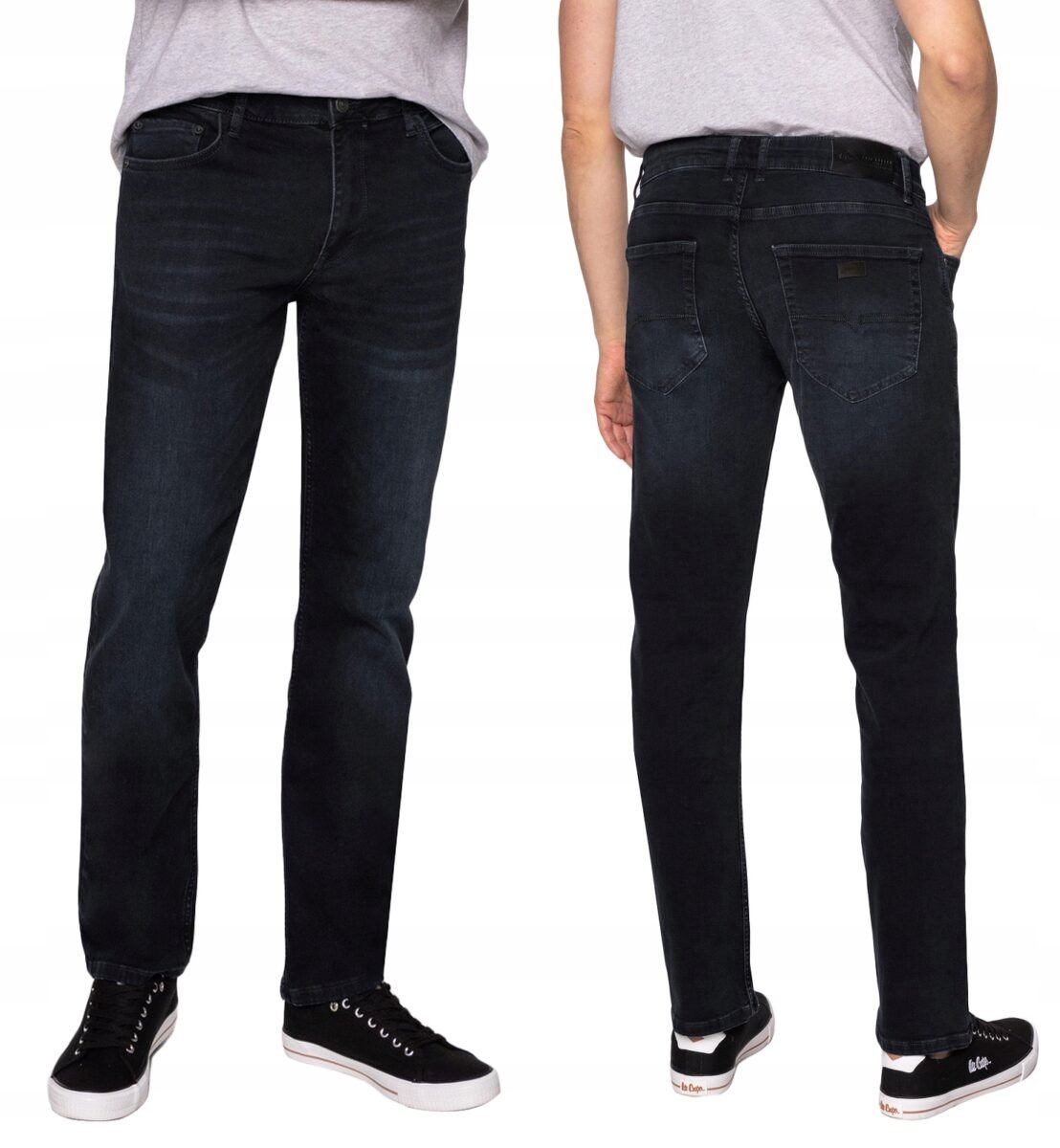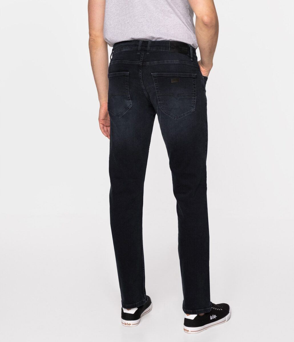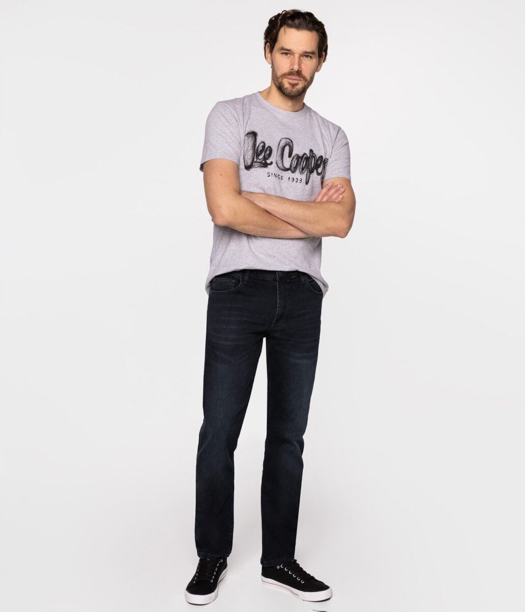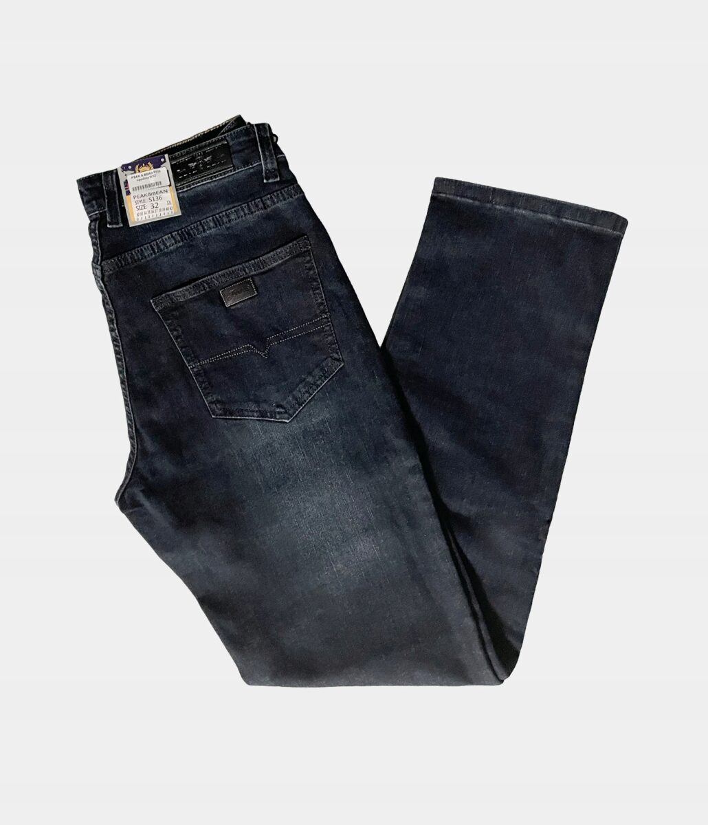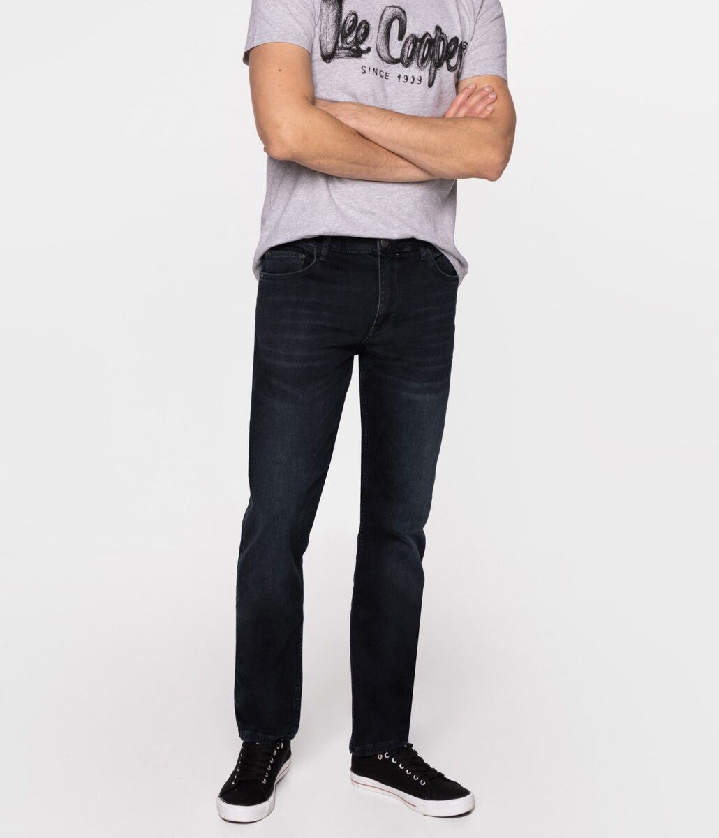 Klasyczne i ponadczasowe spodnie męskie jeansowe, umiarkowanie swobodne w biodrach, o prostych, smukłych nogawkach to jeden z najczęściej wybieranych przez mężczyzn modeli spodni. Wykonane z wysokiej jakości sprężystej, trwałej i mocnej tkaniny jeansowej w kolorze grafitowym „Midnight Blue” dzięki niewielkiemu dodatkowi poliestru (lycra) wyjątkowo wygodnej w użytkowaniu. Niewielki dodatek lycry sprawia że spodnie są bardziej elastyczne, dobrze dopasowują się do sylwetki, i są bardzo komfortowe w użytkowaniu. Łatwo się je zakłada i są znacznie wygodniejsze od jeansów, które lycry nie mają. Poza tym bawełna ma tendencję do kurczenia się w praniu, dlatego lycra sprawia, że spodnie są wyjątkowo praktyczne i można je bez problemu założyć po wysuszeniu. Pozwalają na pełną swobodę ruchów, co daje wygodę przy siadaniu i zapewnia ogromny komfort noszenia. Zapinane na kryty zamek błyskawiczny i metalowy guzik sygnowany logiem firmy. Z przodu mają dwie zaokrąglone kieszonki oraz jedną mniejszą tzw. bilonówkę, a na tyle klasyczne naszywane kieszenie jak w typowych spodniach jeansowych. Najbardziej podatne na uszkodzenia miejsca wzmocnione są podwójnymi przeszyciami oraz metalowymi nitami. W pasie szlufki umożliwiające stylizacje z paskiem.