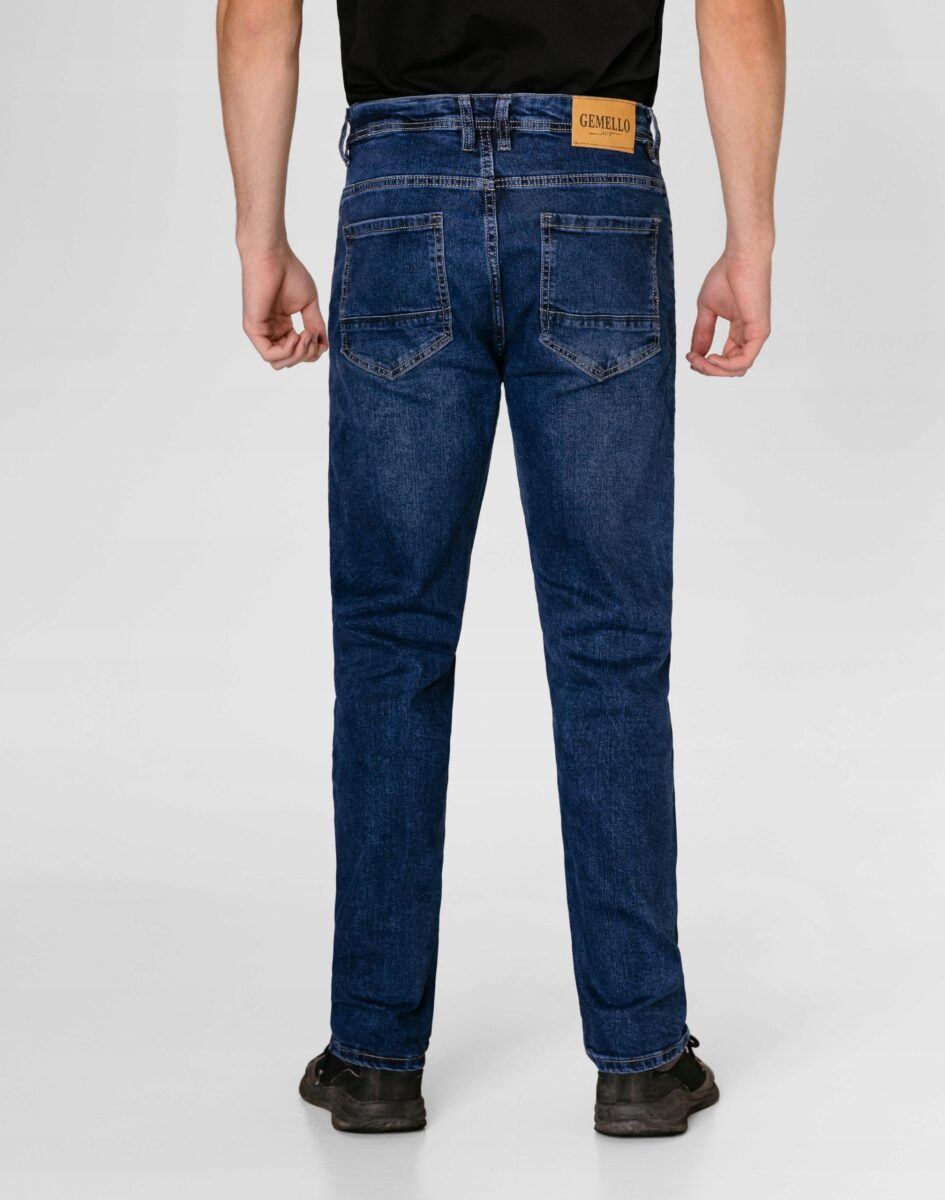 Klasyczne i ponadczasowe spodnie męskie jeansowe, umiarkowanie swobodne w biodrach, o lekko zwężanych nogawkach to jeden z najczęściej wybieranych przez mężczyzn modeli spodni. Wykonane z wysokiej jakości sprężystej, trwałej i mocnej tkaniny jeansowej w kolorze granatowym „Dark Blue” dzięki niewielkiemu dodatkowi poliestru (lycra) wyjątkowo wygodnej w użytkowaniu. Niewielki dodatek lycry sprawia że spodnie są bardziej elastyczne, dobrze dopasowują się do sylwetki, i są bardzo komfortowe w użytkowaniu. Łatwo się je zakłada i są znacznie wygodniejsze od jeansów, które lycry nie mają. Poza tym bawełna ma tendencję do kurczenia się w praniu, dlatego lycra sprawia, że spodnie są wyjątkowo praktyczne i można je bez problemu założyć po wysuszeniu. Pozwalają na pełną swobodę ruchów, co daje wygodę przy siadaniu i zapewnia ogromny komfort noszenia. Zapinane na kryty zamek błyskawiczny i metalowy guzik sygnowany logiem firmy. Z przodu mają dwie zaokrąglone kieszonki oraz jedną mniejszą tzw. bilonówkę, a na tyle klasyczne naszywane kieszenie jak w typowych spodniach jeansowych. Najbardziej podatne na uszkodzenia miejsca wzmocnione są podwójnymi przeszyciami oraz metalowymi nitami. W pasie szlufki umożliwiające stylizacje z paskiem.
