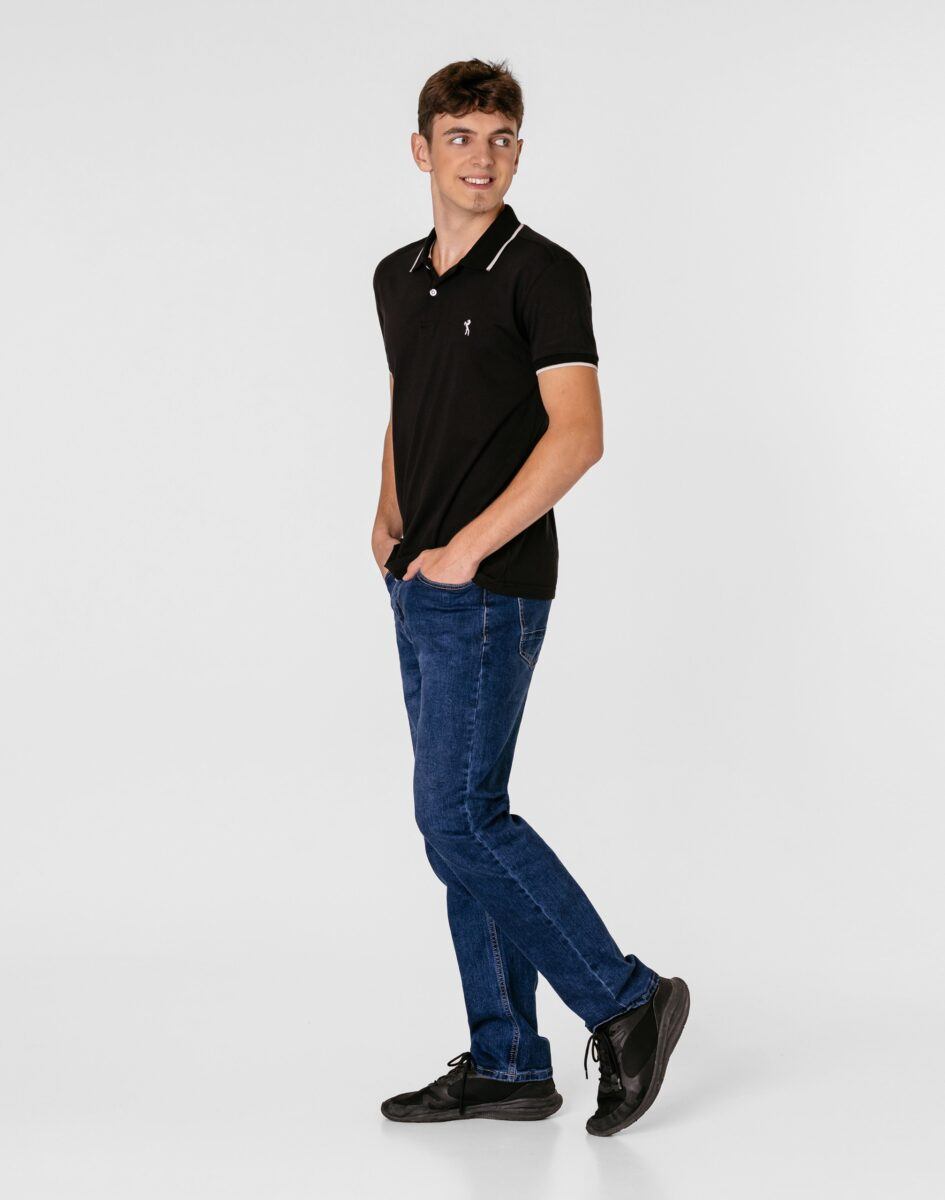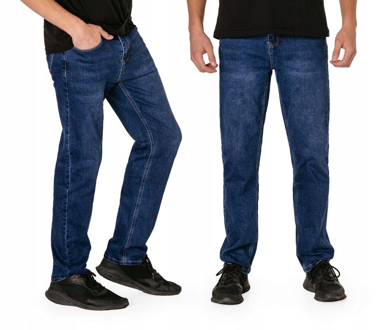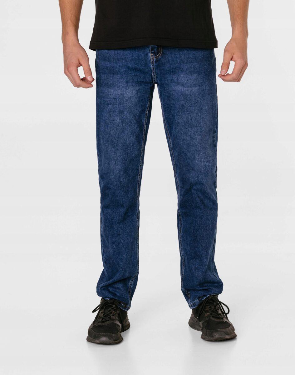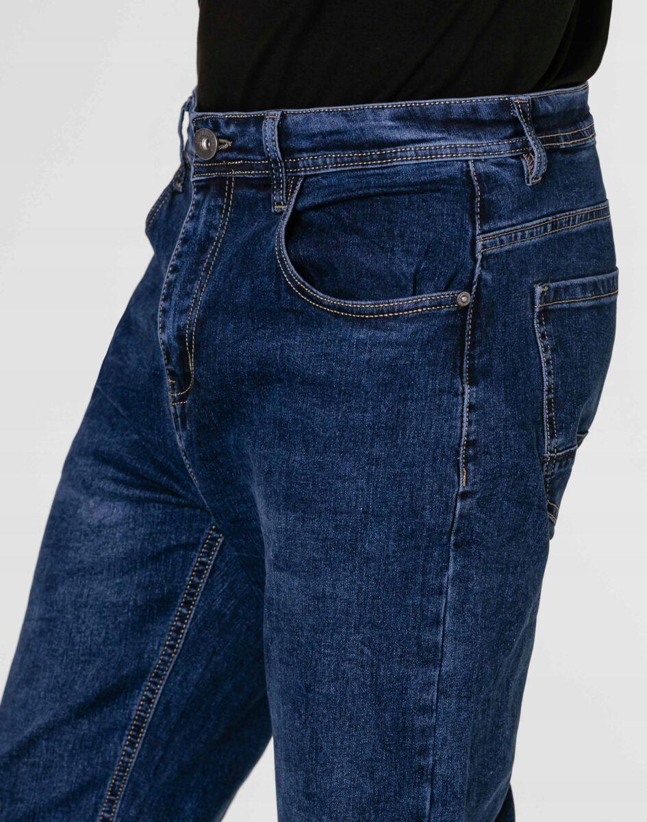 Klasyczne i ponadczasowe spodnie męskie jeansowe, umiarkowanie swobodne w biodrach, o lekko zwężanych nogawkach to jeden z najczęściej wybieranych przez mężczyzn modeli spodni. Wykonane z wysokiej jakości sprężystej, trwałej i mocnej tkaniny jeansowej w kolorze granatowym „Dark Blue” dzięki niewielkiemu dodatkowi poliestru (lycra) wyjątkowo wygodnej w użytkowaniu. Niewielki dodatek lycry sprawia że spodnie są bardziej elastyczne, dobrze dopasowują się do sylwetki, i są bardzo komfortowe w użytkowaniu. Łatwo się je zakłada i są znacznie wygodniejsze od jeansów, które lycry nie mają. Poza tym bawełna ma tendencję do kurczenia się w praniu, dlatego lycra sprawia, że spodnie są wyjątkowo praktyczne i można je bez problemu założyć po wysuszeniu. Pozwalają na pełną swobodę ruchów, co daje wygodę przy siadaniu i zapewnia ogromny komfort noszenia. Zapinane na kryty zamek błyskawiczny i metalowy guzik sygnowany logiem firmy. Z przodu mają dwie zaokrąglone kieszonki oraz jedną mniejszą tzw. bilonówkę, a na tyle klasyczne naszywane kieszenie jak w typowych spodniach jeansowych. Najbardziej podatne na uszkodzenia miejsca wzmocnione są podwójnymi przeszyciami oraz metalowymi nitami. W pasie szlufki umożliwiające stylizacje z paskiem.