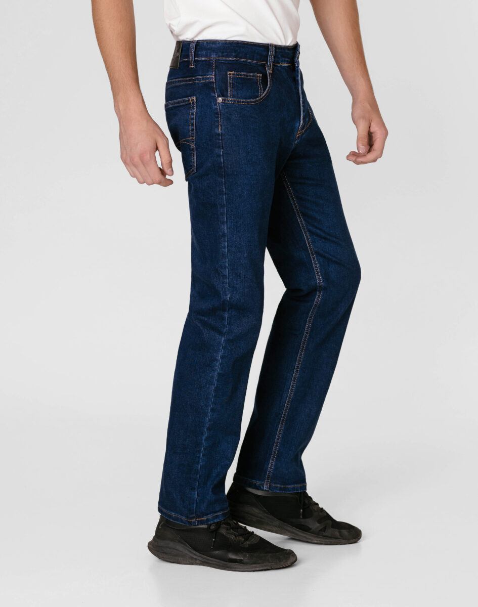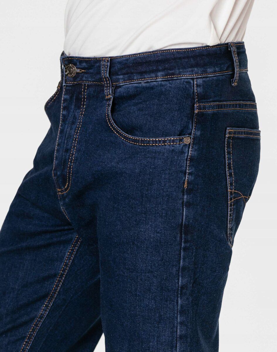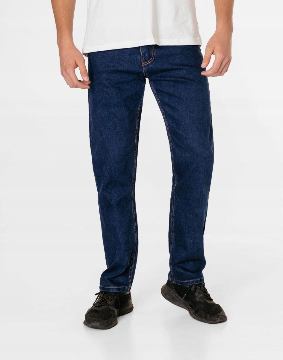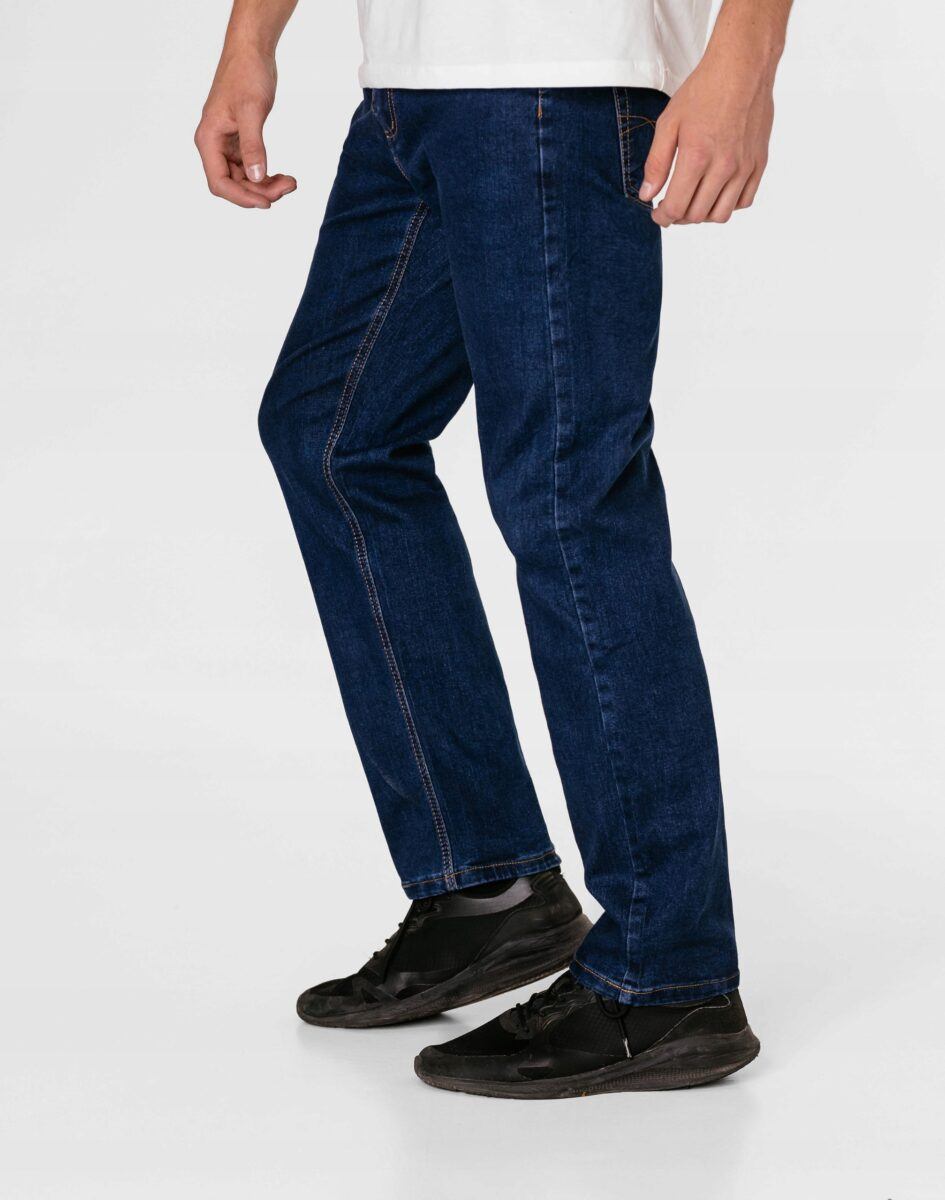 Klasyczne i ponadczasowe spodnie męskie jeansowe, umiarkowanie swobodne w biodrach, o prostych, smukłych nogawkach to jeden z najczęściej wybieranych przez mężczyzn modeli spodni. Wykonane z wysokiej jakości sprężystej, trwałej i mocnej tkaniny jeansowej w kolorze granatowym „Dark Blue” dzięki niewielkiemu dodatkowi poliestru (lycra) wyjątkowo wygodnej w użytkowaniu. Niewielki dodatek lycry sprawia że spodnie są bardziej elastyczne, dobrze dopasowują się do sylwetki, i są bardzo komfortowe w użytkowaniu. Łatwo się je zakłada i są znacznie wygodniejsze od jeansów, które lycry nie mają. Poza tym bawełna ma tendencję do kurczenia się w praniu, dlatego lycra sprawia, że spodnie są wyjątkowo praktyczne i można je bez problemu założyć po wysuszeniu. Pozwalają na pełną swobodę ruchów, co daje wygodę przy siadaniu i zapewnia ogromny komfort noszenia. Zapinane na kryty zamek błyskawiczny i metalowy guzik sygnowany logiem firmy. Z przodu mają dwie zaokrąglone kieszonki oraz jedną mniejszą tzw. bilonówkę, a na tyle klasyczne naszywane kieszenie jak w typowych spodniach jeansowych. Najbardziej podatne na uszkodzenia miejsca wzmocnione są podwójnymi przeszyciami oraz metalowymi nitami. W pasie szlufki umożliwiające stylizacje z paskiem.