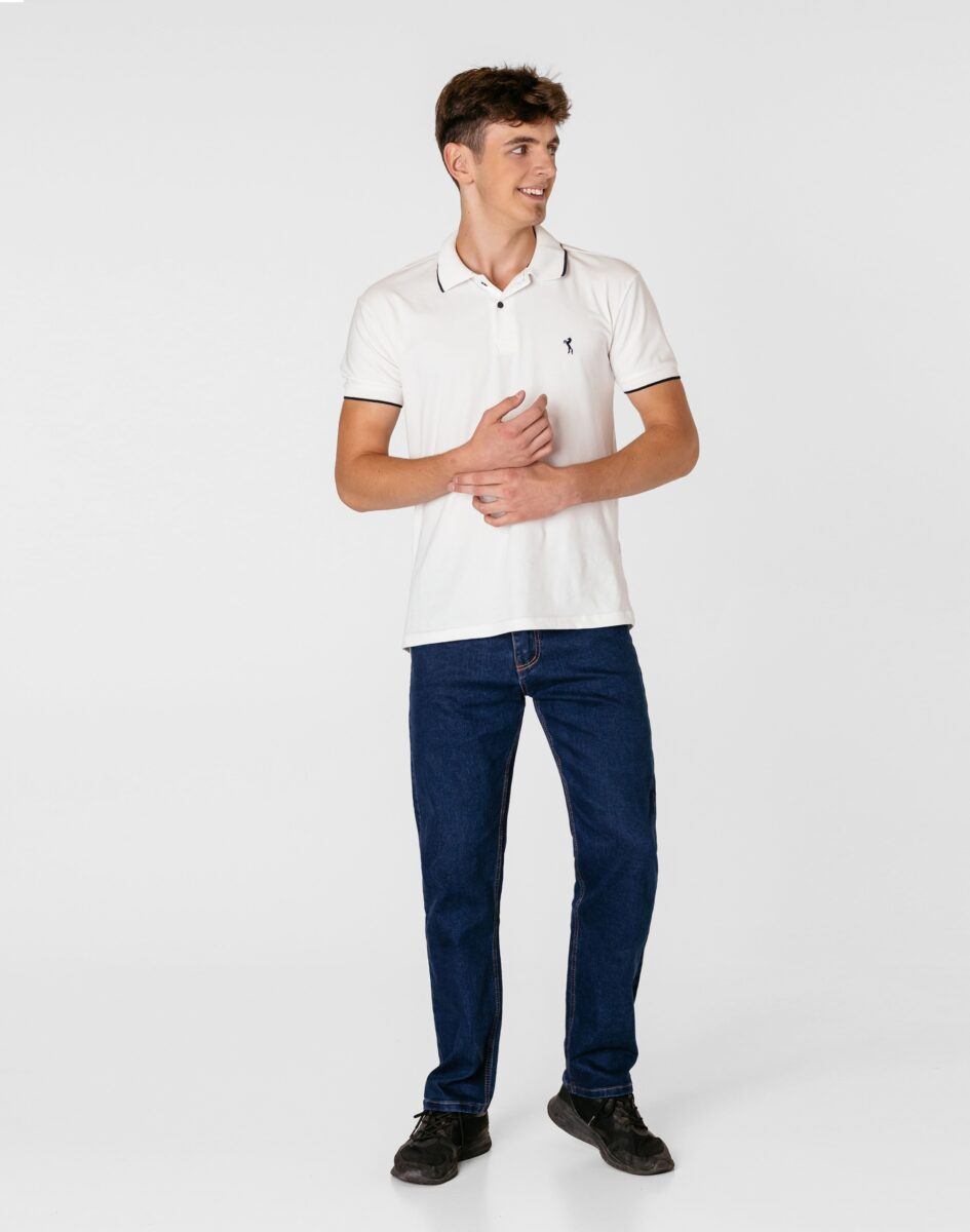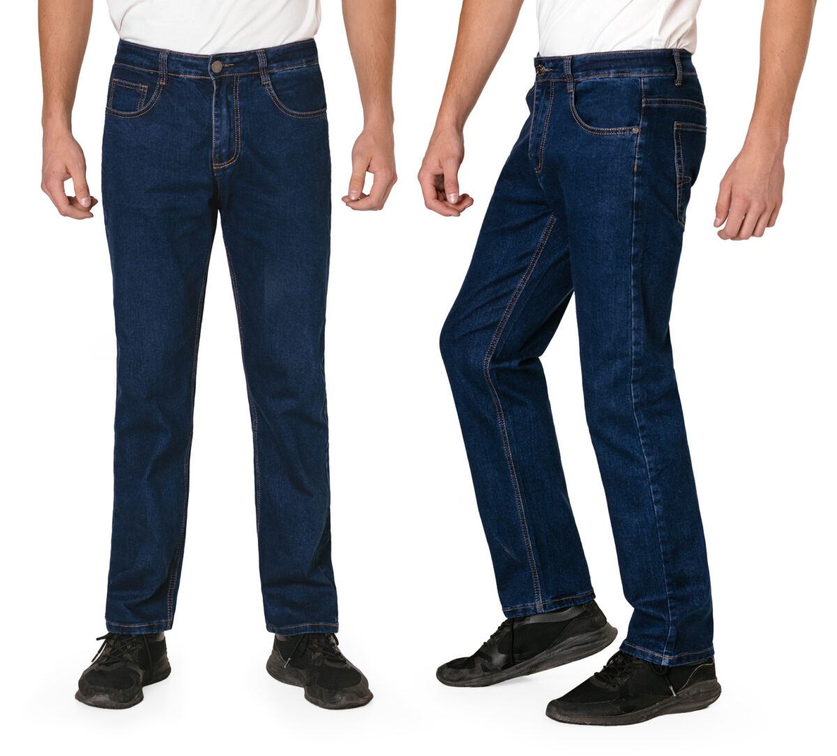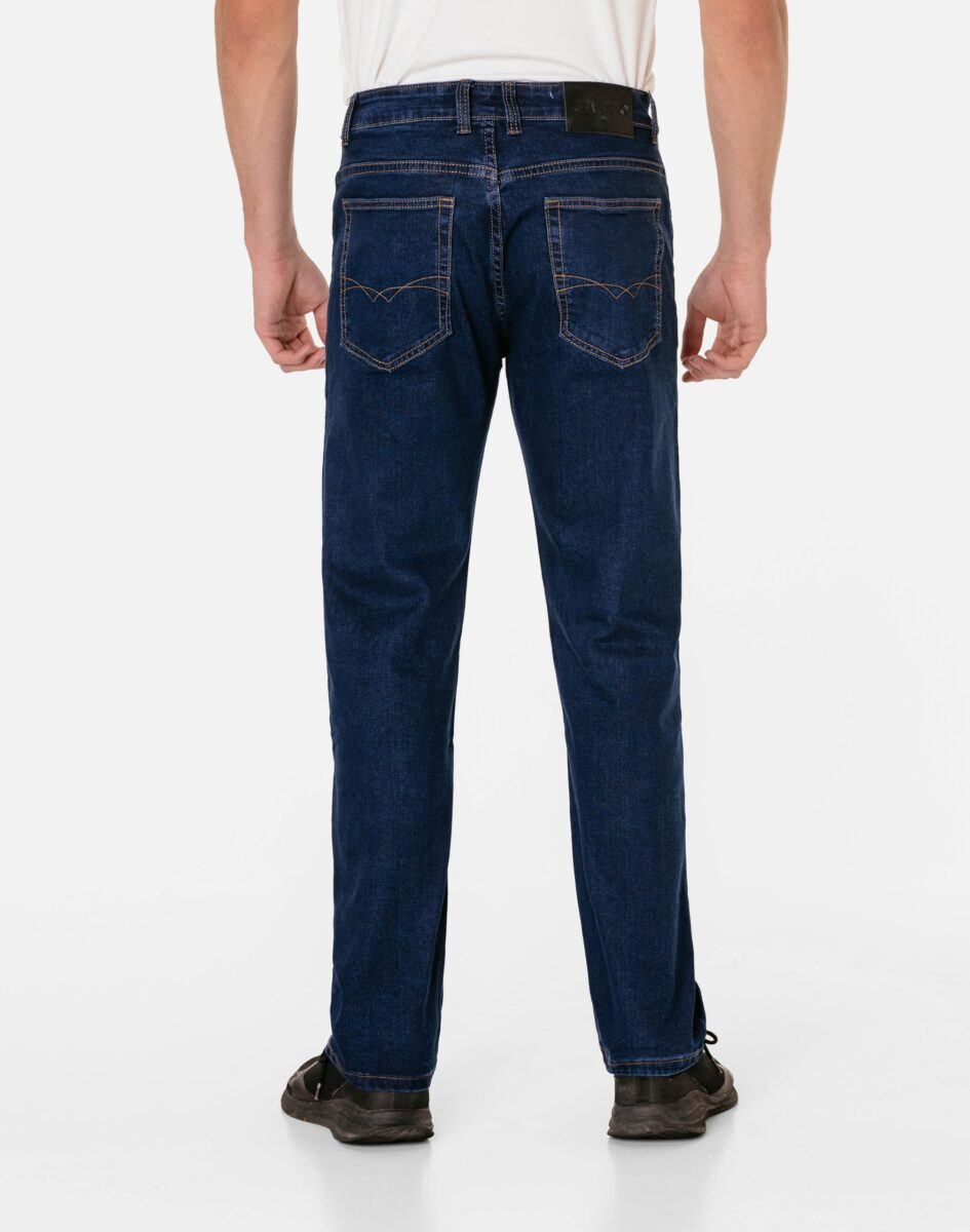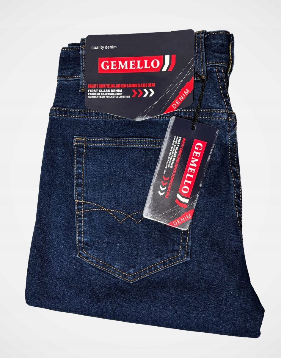 Klasyczne i ponadczasowe spodnie męskie jeansowe, umiarkowanie swobodne w biodrach, o prostych, smukłych nogawkach to jeden z najczęściej wybieranych przez mężczyzn modeli spodni. Wykonane z wysokiej jakości sprężystej, trwałej i mocnej tkaniny jeansowej w kolorze granatowym „Dark Blue” dzięki niewielkiemu dodatkowi poliestru (lycra) wyjątkowo wygodnej w użytkowaniu. Niewielki dodatek lycry sprawia że spodnie są bardziej elastyczne, dobrze dopasowują się do sylwetki, i są bardzo komfortowe w użytkowaniu. Łatwo się je zakłada i są znacznie wygodniejsze od jeansów, które lycry nie mają. Poza tym bawełna ma tendencję do kurczenia się w praniu, dlatego lycra sprawia, że spodnie są wyjątkowo praktyczne i można je bez problemu założyć po wysuszeniu. Pozwalają na pełną swobodę ruchów, co daje wygodę przy siadaniu i zapewnia ogromny komfort noszenia. Zapinane na kryty zamek błyskawiczny i metalowy guzik sygnowany logiem firmy. Z przodu mają dwie zaokrąglone kieszonki oraz jedną mniejszą tzw. bilonówkę, a na tyle klasyczne naszywane kieszenie jak w typowych spodniach jeansowych. Najbardziej podatne na uszkodzenia miejsca wzmocnione są podwójnymi przeszyciami oraz metalowymi nitami. W pasie szlufki umożliwiające stylizacje z paskiem.