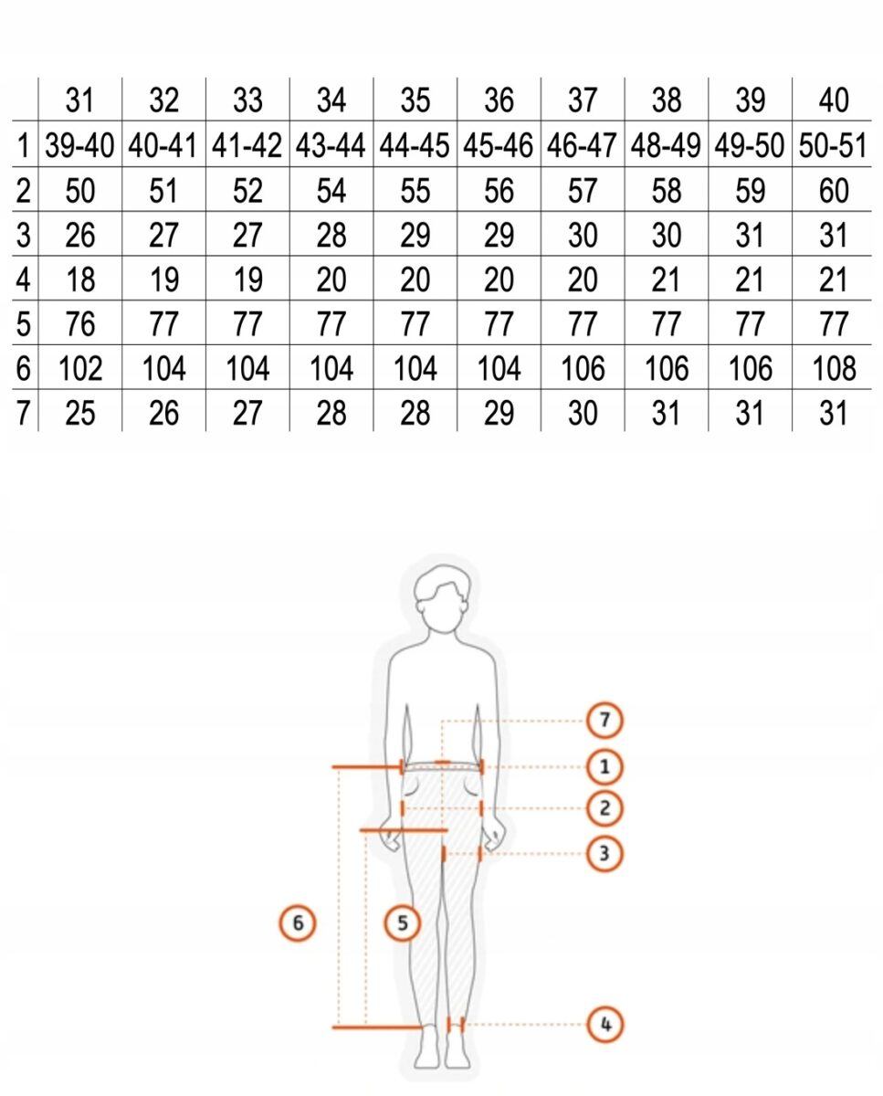 rozmiarszerokość w pasie (cm)szerokość w biodrach (cm)szerokość w udzie (cm)szerokość na dole nogawki (cm)długość nogawki od kroku (cm)długość nogawki zewnętrzna (cm)wysokość pasa (cm)