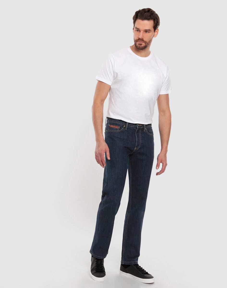 Klasyczne spodnie męskie jeansowe M3140 ze standardowym stanem i prostą nogawką to jeden z najczęściej wybieranych przez mężczyzn modeli spodni. Wykonane z wysokiej jakości, trwałej i mocnej, delikatnie elastycznej tkaniny jeansowej o jednolitym granatowym wybarwieniu „Midnight Blue”. Zapinane na kryty zamek błyskawiczny i metalowy guzik sygnowany logiem firmy. Z przodu mają dwie zaokrąglone kieszonki oraz jedną mniejszą tzw. bilonówkę, a na tyle klasyczne naszywane kieszenie jak w typowych spodniach jeansowych. Najbardziej podatne na uszkodzenia miejsca wzmocnione są dodatkowymi przeszyciami oraz metalowymi nitami. W pasie szlufki umożliwiające stylizacje z paskiem.
