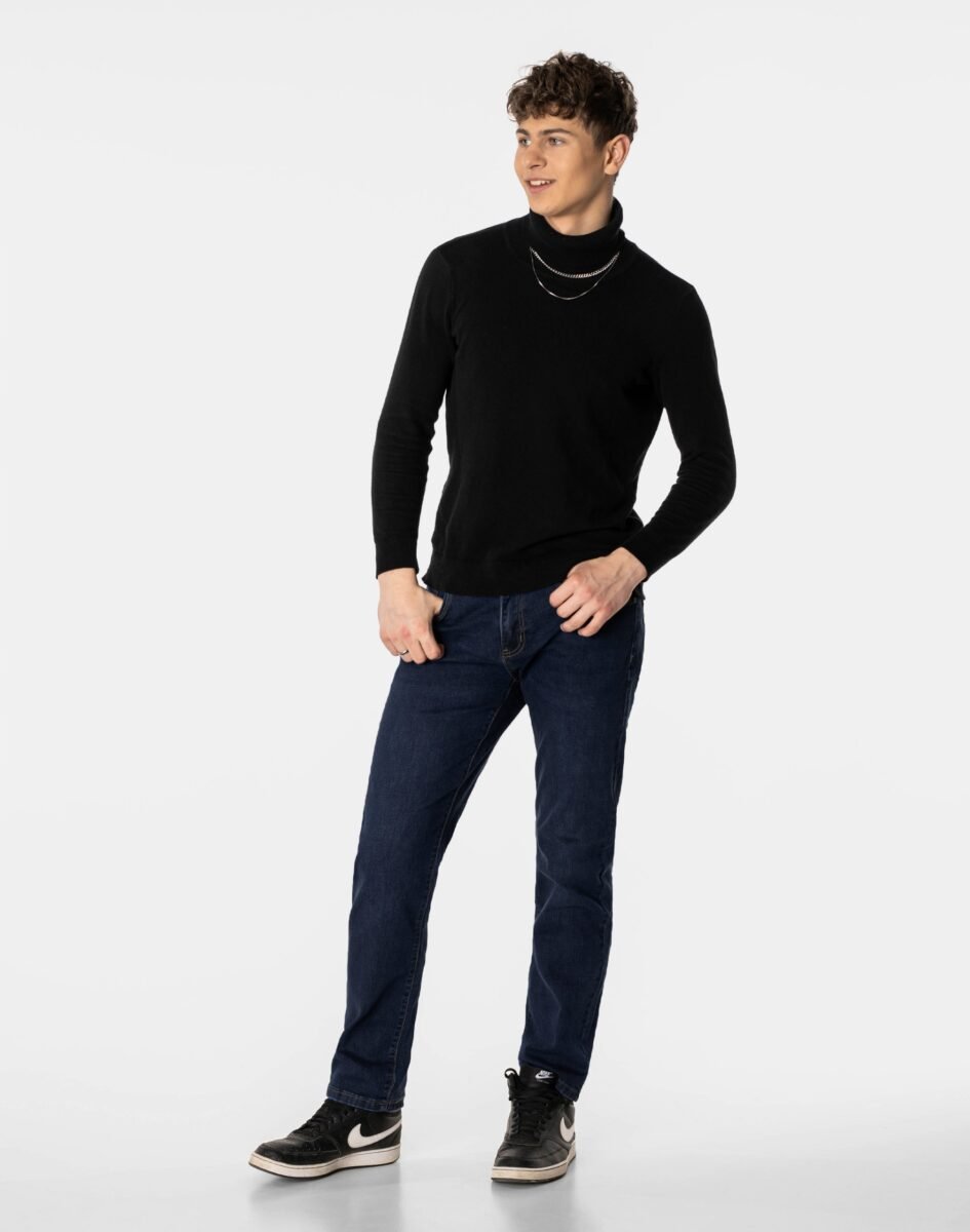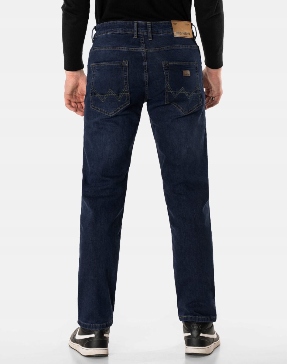 Klasyczne i ponadczasowe spodnie męskie jeansowe, umiarkowanie swobodne w biodrach, o prostych, smukłych nogawkach to jeden z najczęściej wybieranych przez mężczyzn modeli spodni. Wykonane z wysokiej jakości sprężystej, trwałej i mocnej tkaniny jeansowej w kolorze granatowym "Dark Blue" dzięki niewielkiemu dodatkowi poliestru (lycra) wyjątkowo wygodnej w użytkowaniu. Niewielki dodatek lycry sprawia że spodnie są bardziej elastyczne, dobrze dopasowują się do sylwetki, i są bardzo komfortowe w użytkowaniu. Łatwo się je zakłada i są znacznie wygodniejsze od jeansów, które lycry nie mają. Poza tym bawełna ma tendencję do kurczenia się w praniu, dlatego lycra sprawia, że spodnie są wyjątkowo praktyczne i można je bez problemu założyć po wysuszeniu. Pozwalają na pełną swobodę ruchów, co daje wygodę przy siadaniu i zapewnia ogromny komfort noszenia. Zapinane na kryty zamek błyskawiczny i metalowy guzik sygnowany logiem firmy. Z przodu mają dwie zaokrąglone kieszonki oraz jedną mniejszą tzw. bilonówkę, a na tyle klasyczne naszywane kieszenie jak w typowych spodniach jeansowych. Najbardziej podatne na uszkodzenia miejsca wzmocnione są podwójnymi przeszyciami oraz metalowymi nitami. W pasie szlufki umożliwiające stylizacje z paskiem.