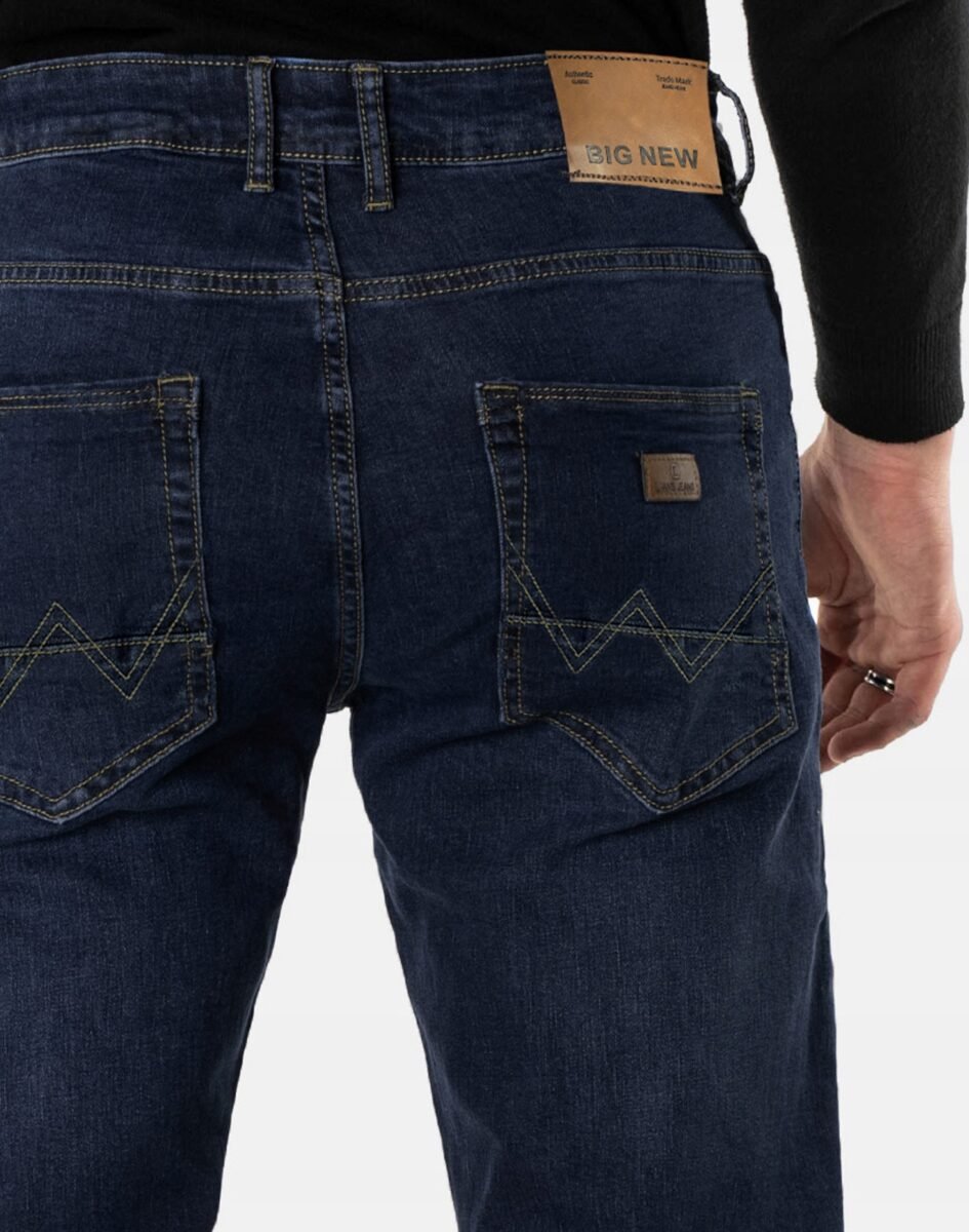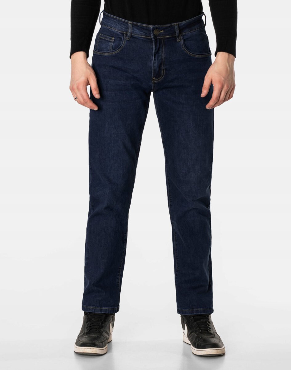 Klasyczne i ponadczasowe spodnie męskie jeansowe, umiarkowanie swobodne w biodrach, o prostych, smukłych nogawkach to jeden z najczęściej wybieranych przez mężczyzn modeli spodni. Wykonane z wysokiej jakości sprężystej, trwałej i mocnej tkaniny jeansowej w kolorze granatowym "Dark Blue" dzięki niewielkiemu dodatkowi poliestru (lycra) wyjątkowo wygodnej w użytkowaniu. Niewielki dodatek lycry sprawia że spodnie są bardziej elastyczne, dobrze dopasowują się do sylwetki, i są bardzo komfortowe w użytkowaniu. Łatwo się je zakłada i są znacznie wygodniejsze od jeansów, które lycry nie mają. Poza tym bawełna ma tendencję do kurczenia się w praniu, dlatego lycra sprawia, że spodnie są wyjątkowo praktyczne i można je bez problemu założyć po wysuszeniu. Pozwalają na pełną swobodę ruchów, co daje wygodę przy siadaniu i zapewnia ogromny komfort noszenia. Zapinane na kryty zamek błyskawiczny i metalowy guzik sygnowany logiem firmy. Z przodu mają dwie zaokrąglone kieszonki oraz jedną mniejszą tzw. bilonówkę, a na tyle klasyczne naszywane kieszenie jak w typowych spodniach jeansowych. Najbardziej podatne na uszkodzenia miejsca wzmocnione są podwójnymi przeszyciami oraz metalowymi nitami. W pasie szlufki umożliwiające stylizacje z paskiem.