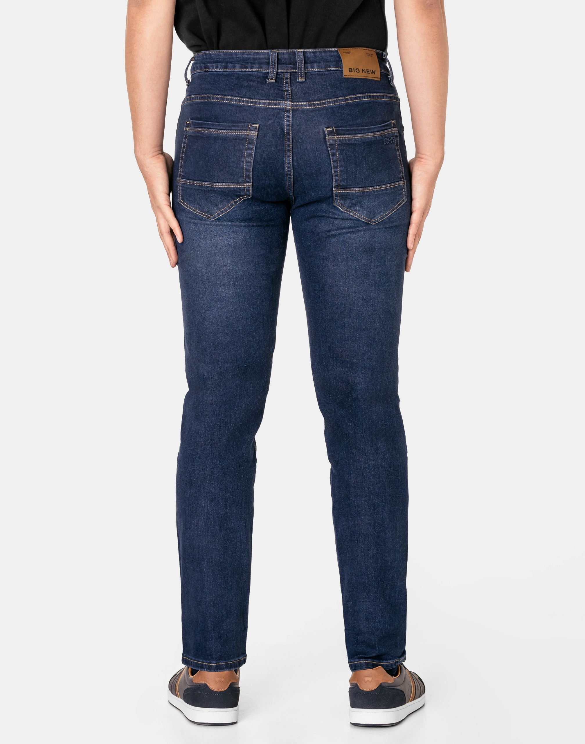 Klasyczne i ponadczasowe spodnie męskie jeansowe, umiarkowanie swobodne w biodrach, o prostych, smukłych nogawkach to jeden z najczęściej wybieranych przez mężczyzn modeli spodni. Wykonane z wysokiej jakości sprężystej, trwałej i mocnej tkaniny jeansowej w kolorze granatowym "Dark Blue" dzięki niewielkiemu dodatkowi PE (stretch) wyjątkowo wygodnej w użytkowaniu. Niewielki dodatek stretchu sprawia że spodnie są bardziej elastyczne, dobrze dopasowują się do sylwetki, i są bardzo komfortowe w użytkowaniu. Łatwo się je zakłada i są znacznie wygodniejsze od jeansów, które stretchu nie mają. Poza tym bawełna ma tendencję do kurczenia się w praniu, dlatego stretch sprawia, że spodnie są wyjątkowo praktyczne i można je bez problemu założyć po wysuszeniu. Pozwalają na pełną swobodę ruchów, co daje wygodę przy siadaniu i zapewnia ogromny komfort noszenia. Zapinane na kryty zamek błyskawiczny i metalowy guzik sygnowany logiem firmy. Z przodu mają dwie zaokrąglone kieszonki oraz jedną mniejszą tzw. bilonówkę, a na tyle klasyczne naszywane kieszenie jak w typowych spodniach jeansowych. Najbardziej podatne na uszkodzenia miejsca wzmocnione są podwójnymi przeszyciami oraz metalowymi nitami. W pasie szlufki umożliwiające stylizacje z paskiem.