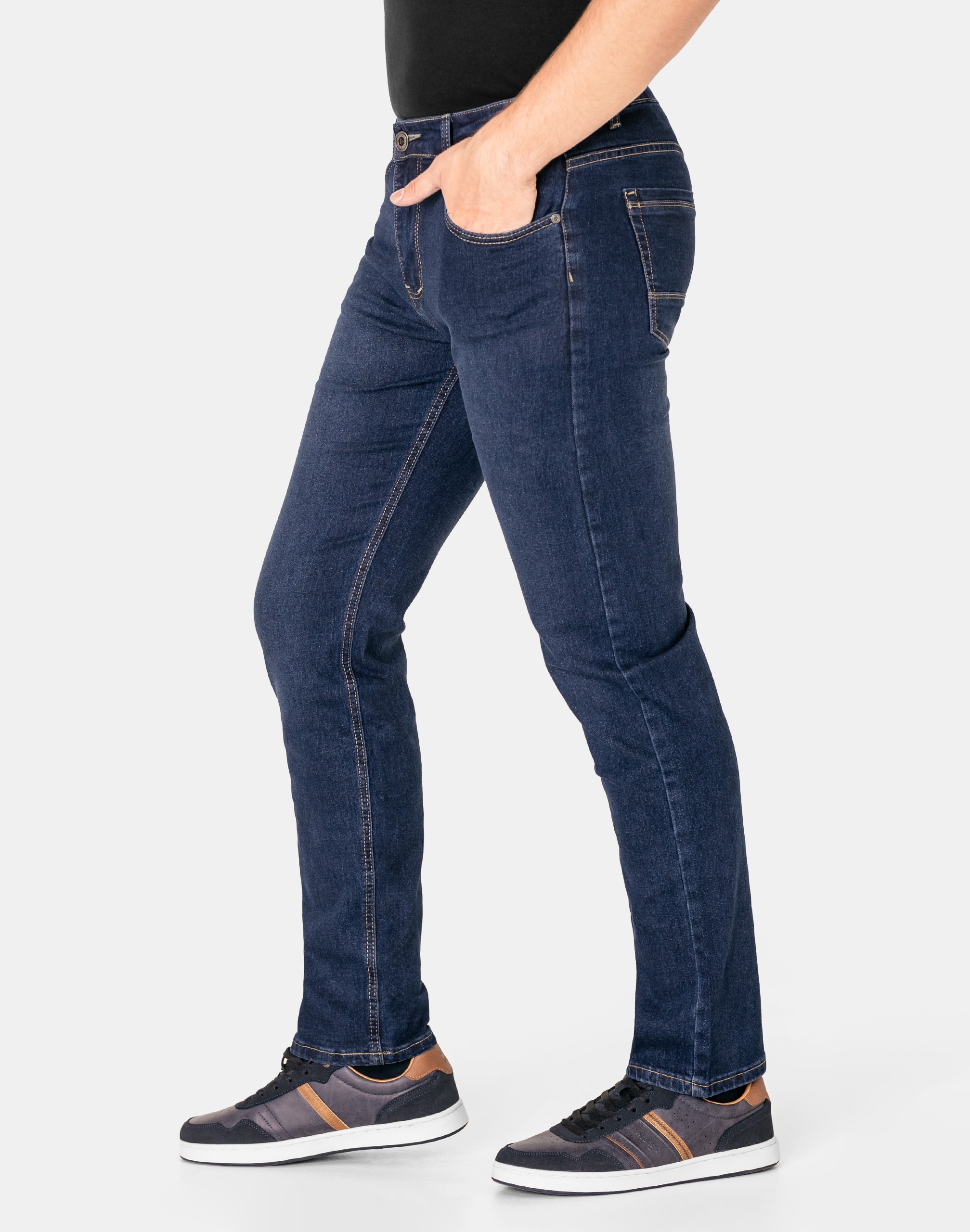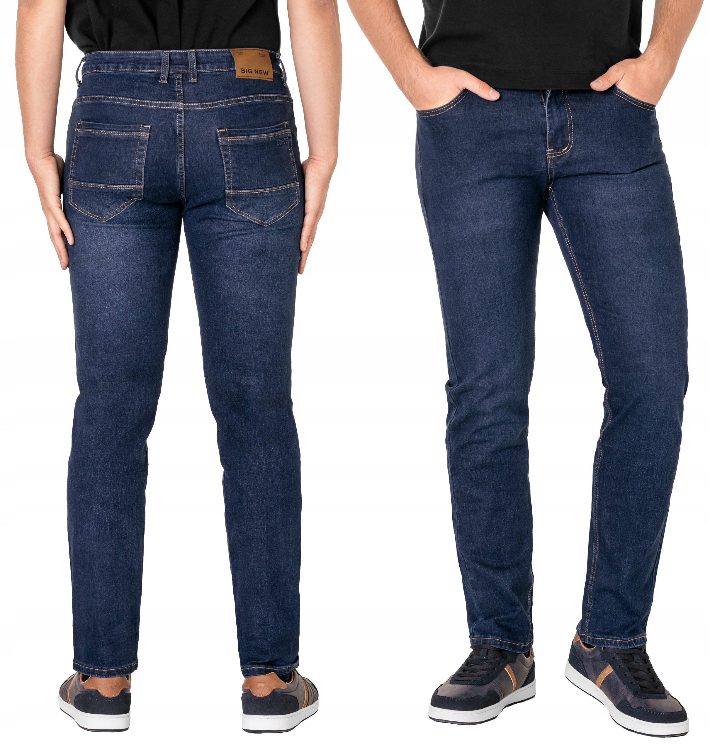 Klasyczne i ponadczasowe spodnie męskie jeansowe, umiarkowanie swobodne w biodrach, o prostych, smukłych nogawkach to jeden z najczęściej wybieranych przez mężczyzn modeli spodni. Wykonane z wysokiej jakości sprężystej, trwałej i mocnej tkaniny jeansowej w kolorze granatowym "Dark Blue" dzięki niewielkiemu dodatkowi PE (stretch) wyjątkowo wygodnej w użytkowaniu. Niewielki dodatek stretchu sprawia że spodnie są bardziej elastyczne, dobrze dopasowują się do sylwetki, i są bardzo komfortowe w użytkowaniu. Łatwo się je zakłada i są znacznie wygodniejsze od jeansów, które stretchu nie mają. Poza tym bawełna ma tendencję do kurczenia się w praniu, dlatego stretch sprawia, że spodnie są wyjątkowo praktyczne i można je bez problemu założyć po wysuszeniu. Pozwalają na pełną swobodę ruchów, co daje wygodę przy siadaniu i zapewnia ogromny komfort noszenia. Zapinane na kryty zamek błyskawiczny i metalowy guzik sygnowany logiem firmy. Z przodu mają dwie zaokrąglone kieszonki oraz jedną  mniejszą  tzw. bilonówkę, a na tyle klasyczne naszywane kieszenie jak w typowych spodniach jeansowych. Najbardziej podatne na uszkodzenia miejsca wzmocnione są podwójnymi przeszyciami oraz metalowymi nitami. W pasie szlufki umożliwiające stylizacje z paskiem.