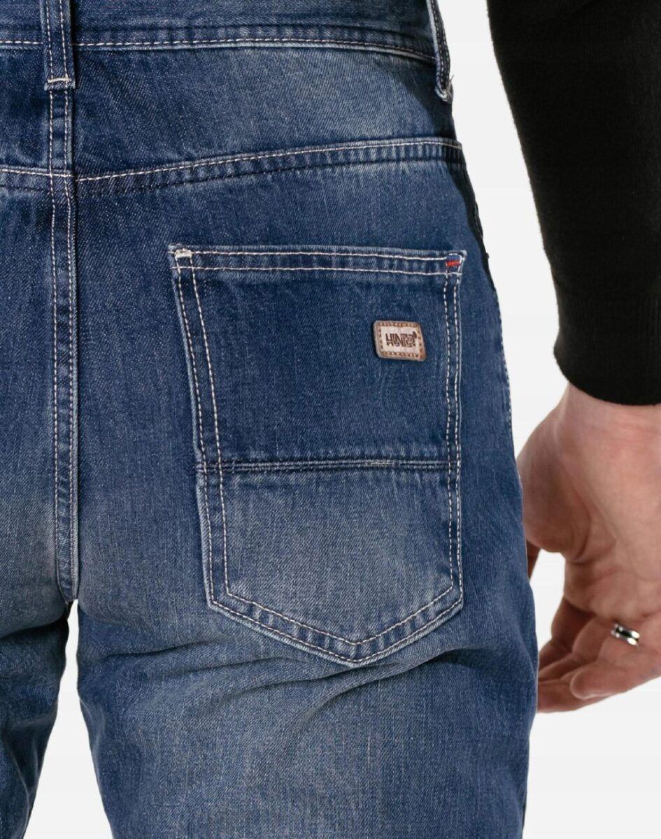 Jeansy męskie polskiej firmy HUNTER z fabrycznym efektem znoszonego, zniszczonego jeansu „used-look”, w procesie produkcji poddane zostały specjalnym zabiegom postarzającym materiał polegającym to na wycieraniu, wielokrotnym wypieraniu barwnika i tworzeniu efektownych pomięć i przetarć. Uzyskane w ten sposób designerskie rozjaśnienia i wytarcia mają na celu wywołanie tak modnego efektu starych, długo noszonych jeansów. Wykonane z wysokiej jakości gęstej, trwałej i mocnej tkaniny jeansowej „Denim Super Blue” z niewielkim dodatkiem streczu (elastan). Niewielki dodatek elastanu sprawia, że spodnie są bardziej elastyczne co pozwala na pełną swobodę ruchów, daje komfort przy siadaniu i zapewnia ogromny komfort noszenia. Zapinane są na kryty zamek błyskawiczny i metalowy guzik sygnowany logiem firmy. Z przodu mają dwie kieszonki zaokrąglone oraz mniejszą kieszonkę tzw. bilonówkę, a na tyle klasyczne kieszenie naszywane jak w typowych spodniach jeansowych. W pasie szlufki umożliwiające stylizacje z paskiem. Najbardziej podatne na uszkodzenia miejsca wzmocnione są dodatkowymi przeszyciami oraz firmowymi nitami.