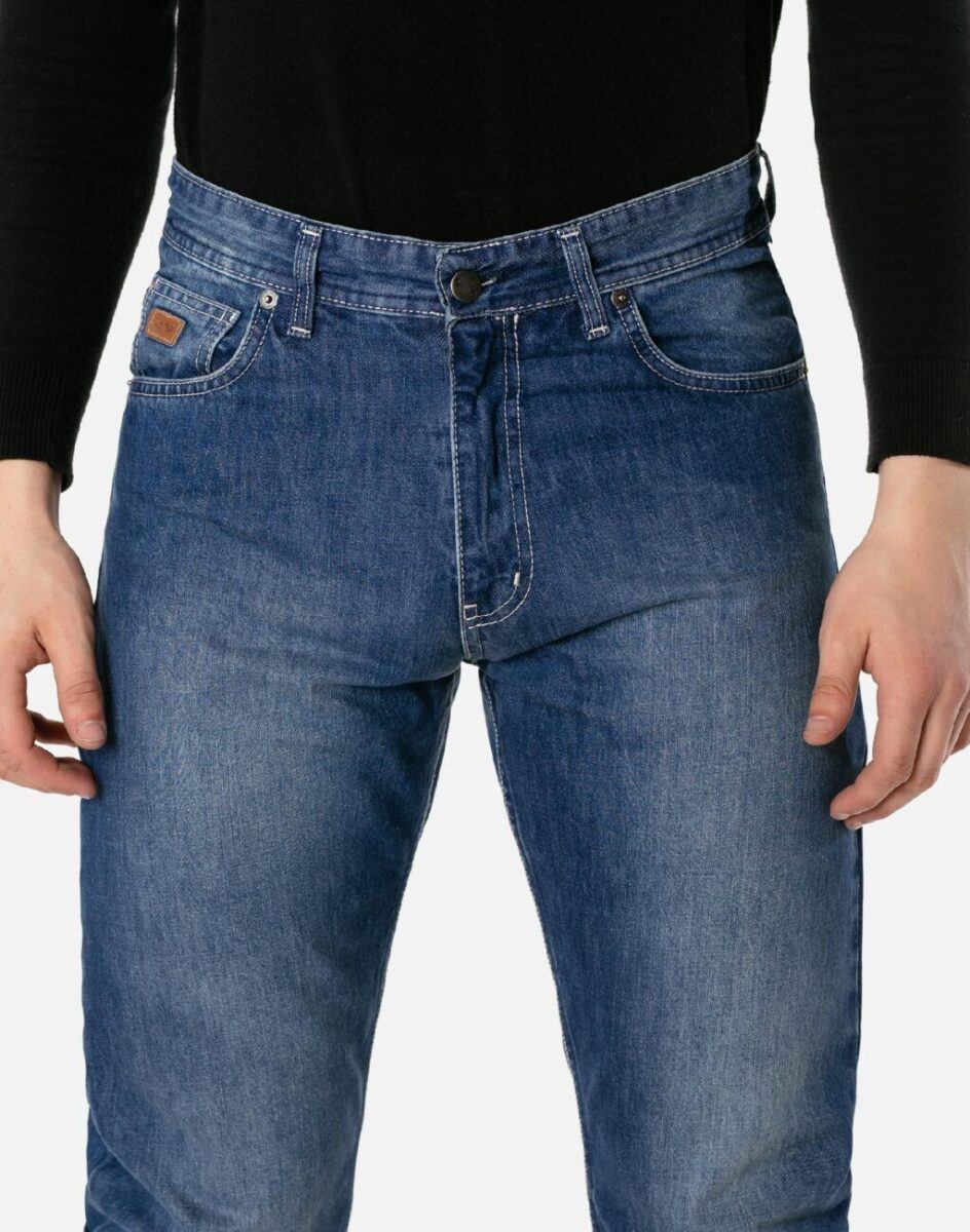 Jeansy męskie polskiej firmy HUNTER z fabrycznym efektem znoszonego, zniszczonego jeansu „used-look”, w procesie produkcji poddane zostały specjalnym zabiegom postarzającym materiał polegającym to na wycieraniu, wielokrotnym wypieraniu barwnika i tworzeniu efektownych pomięć i przetarć. Uzyskane w ten sposób designerskie rozjaśnienia i wytarcia mają na celu wywołanie tak modnego efektu starych, długo noszonych jeansów. Wykonane z wysokiej jakości gęstej, trwałej i mocnej tkaniny jeansowej „Denim Super Blue” z niewielkim dodatkiem streczu (elastan). Niewielki dodatek elastanu sprawia, że spodnie są bardziej elastyczne co pozwala na pełną swobodę ruchów, daje komfort przy siadaniu i zapewnia ogromny komfort noszenia. Zapinane są na kryty zamek błyskawiczny i metalowy guzik sygnowany logiem firmy. Z przodu mają dwie kieszonki zaokrąglone oraz mniejszą kieszonkę tzw. bilonówkę, a na tyle klasyczne kieszenie naszywane jak w typowych spodniach jeansowych. W pasie szlufki umożliwiające stylizacje z paskiem. Najbardziej podatne na uszkodzenia miejsca wzmocnione są dodatkowymi przeszyciami oraz firmowymi nitami.