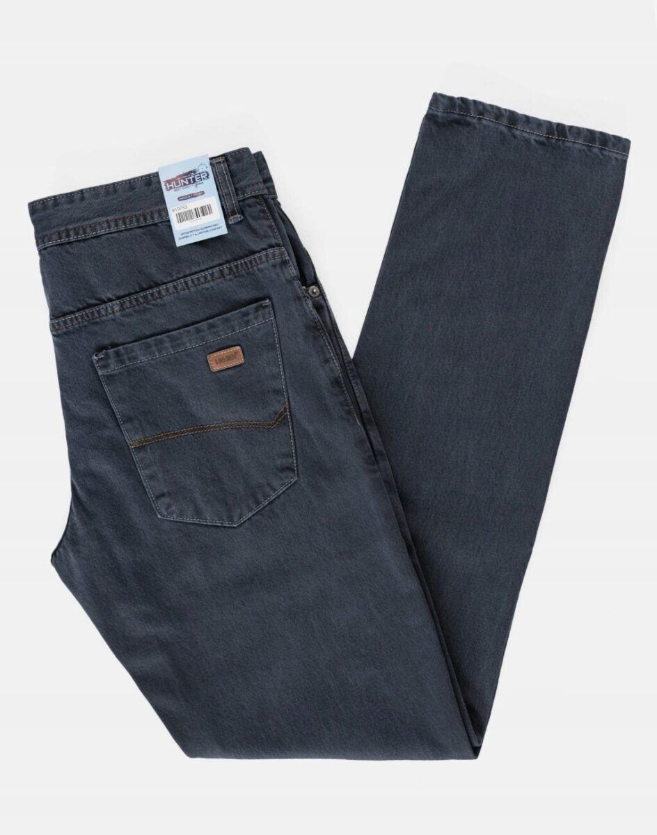 Niesłychanie wygodne i praktyczne podczas użytkowania jeansy męskie polskiej firmy HUNTER ze standardowym stanem i klasyczną lekko zwężaną nogawką to jeden z najczęściej wybieranych modeli spodni. Wykonane z wysokiej jakości trwałej i mocnej tkaniny bawełnianej z niewielkim dodatkiem elastanu (strecz) o gęstym, drobnym splocie i jednolitym grafitowo-szarym wybarwieniu „Blue Grey”. Niewielki dodatek elastanu sprawia, że spodnie są bardziej elastyczne co pozwala na pełną swobodę ruchów, daje komfort przy siadaniu i zapewnia ogromny komfort noszenia. Zapinane są na kryty zamek błyskawiczny i metalowy guzik sygnowany logiem firmy. Z przodu mają dwie kieszonki zaokrąglone oraz mniejszą kieszonkę tzw. bilonówkę, a na tyle klasyczne kieszenie naszywane jak w typowych spodniach jeansowych. W pasie szlufki umożliwiające stylizacje z paskiem. Najbardziej podatne na uszkodzenia miejsca wzmocnione są dodatkowymi przeszyciami oraz nitami.