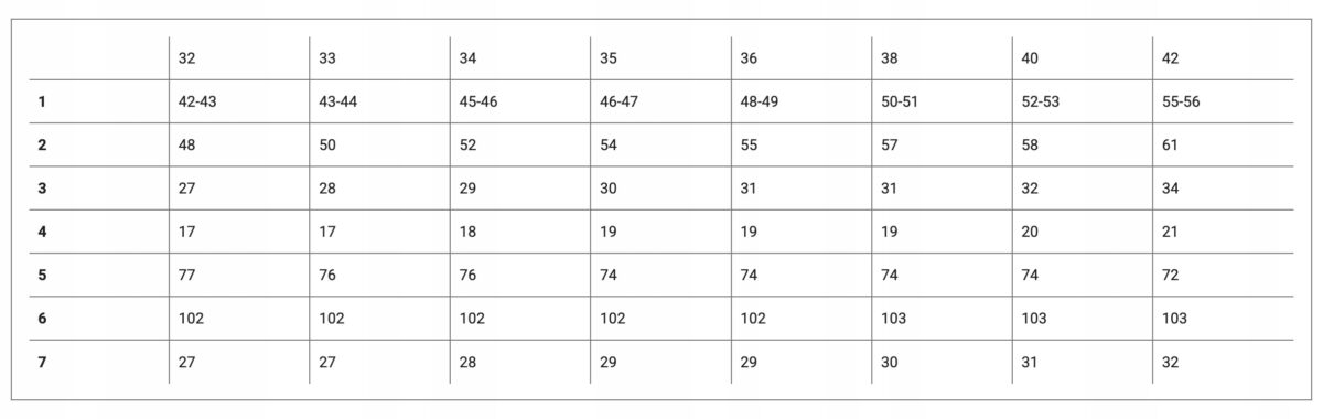 rozmiarszerokość w pasie (cm)szerokość w biodrach (cm)szerokość w udzie (cm)szerokość na dole nogawki (cm)długość nogawki od kroku (cm)długość nogawki zewnętrzna (cm)wysokość pasa (cm)