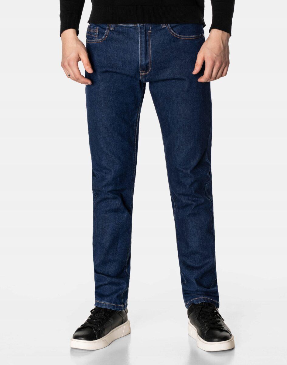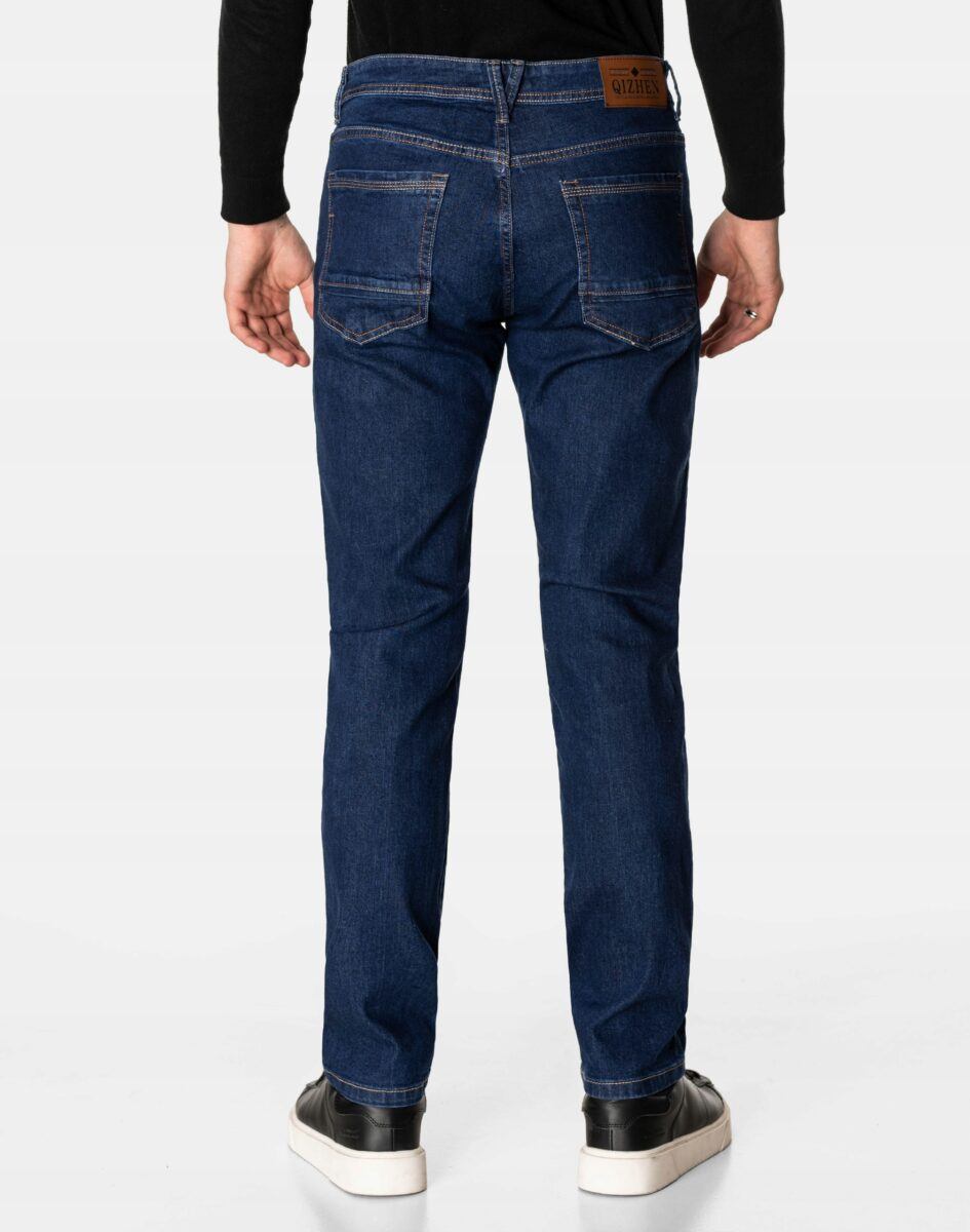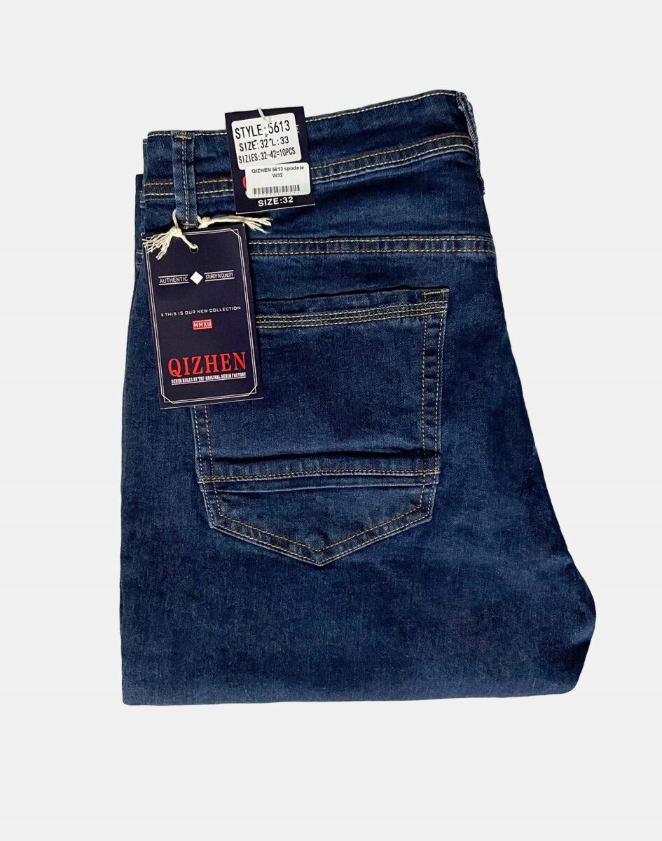 Klasyczne i ponadczasowe spodnie męskie jeansowe model 5613#, umiarkowanie swobodne w biodrach, o prostych, smukłych nogawkach to jeden z najczęściej wybieranych przez mężczyzn modeli spodni. Wykonane z wysokiej jakości sprężystej, trwałej i mocnej tkaniny jeansowej w kolorze granatowym „Dark Blue”, dzięki niewielkiemu dodatkowi spandexu (lycra) wyjątkowo wygodnej w użytkowaniu. Niewielki dodatek lycry sprawia że spodnie są bardziej elastyczne, dobrze dopasowują się do sylwetki, i są bardzo komfortowe w użytkowaniu. Łatwo się je zakłada i są znacznie wygodniejsze od jeansów, które lycry nie mają. Poza tym bawełna ma tendencję do kurczenia się w praniu, dlatego lycra sprawia, że spodnie są wyjątkowo praktyczne i można je bez problemu założyć po wysuszeniu. Pozwalają na pełną swobodę ruchów, co daje wygodę przy siadaniu i zapewnia ogromny komfort noszenia. Zapinane na kryty zamek błyskawiczny i metalowy guzik sygnowany logiem firmy. Z przodu mają dwie zaokrąglone kieszonki oraz jedną mniejszą tzw. bilonówkę, a na tyle klasyczne naszywane kieszenie jak w typowych spodniach jeansowych. Najbardziej podatne na uszkodzenia miejsca wzmocnione są podwójnymi przeszyciami oraz metalowymi nitami. W pasie szlufki umożliwiające stylizacje z paskiem.