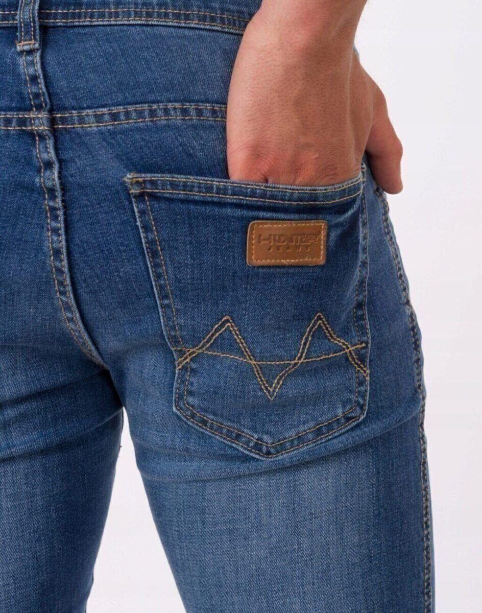 Niesłychanie wygodne i praktyczne podczas użytkowania jeansy polskiej firmy HUNTER z modnym efektem sprania i przetarciami w nieśmiertelnym stylu „used-look”, w procesie produkcji poddane zostały specjalnym zabiegom postarzającym materiał polegającym na wycieraniu, wypieraniu barwnika i tworzeniu efektownych przetarć. Efektowne rozjaśnienia, pomięcia i wytarcia mają na celu wywołanie tak modnego efektu starych, długo noszonych jeansów. Wykonane z wysokiej jakości gęstej, trwałej i mocnej tkaniny bawełnianej „Denim Dark Blue” z dodatkiem elastanu (stretch). Niewielki dodatek elastanu sprawia, że spodnie są bardziej elastyczne co pozwala na pełną swobodę ruchów, daje komfort przy siadaniu i zapewnia ogromny komfort noszenia. Zapinane są na kryty zamek błyskawiczny i metalowy guzik sygnowany logiem firmy. Z przodu mają dwie kieszonki zaokrąglone oraz mniejszą kieszonkę tzw. bilonówkę, a na tyle klasyczne kieszenie naszywane jak w typowych spodniach jeansowych. W pasie szlufki umożliwiające stylizacje z paskiem. Najbardziej podatne na uszkodzenia miejsca wzmocnione są dodatkowymi przeszyciami oraz firmowymi nitami.