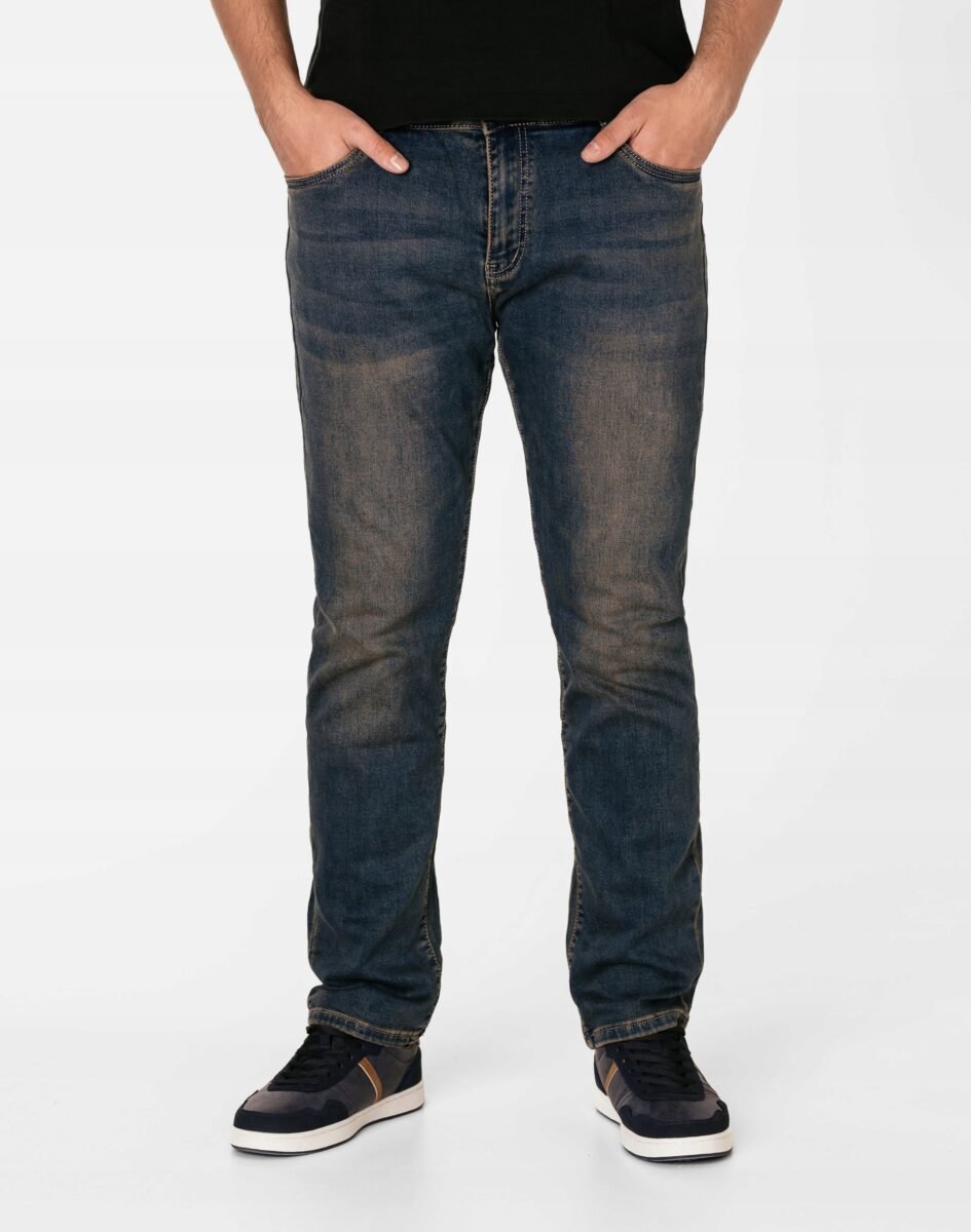Granatowe jeansy męskie model #24051 z klasyczną prostą nogawką to klasyka wśród klasyki i jeden z najczęściej wybieranych modeli spodni. Wykonane z wysokiej jakości delikatnie elastycznej tkaniny jeansowej typu "Dark Blue Denim" średniej grubości z dodatkiem lycry (elastan) oraz modnymi efektami sprania, przetarciami i przebarwieniami w nieśmiertelnym stylu "used-look" (zużyty wygląd). Dzięki dodatkowi elastanu łatwo się je zakłada i są znacznie wygodniejsze od spodni które lycry nie mają. Poza tym bawełna ma tendencję do kurczenia się w praniu, dlatego lycra sprawia, że spodnie są wyjątkowo praktyczne i można je bez problemu założyć po wysuszeniu. Zapinane na kryty zamek błyskawiczny i metalowy guzik sygnowany logiem firmy. Z przodu mają 2 zaokrąglone kieszonki oraz mniejszą tzw. bilonówkę, a na tyle klasyczne kieszenie naszywane jak w typowych spodniach jeansowych. W pasie szlufki umożliwiające stylizacje z paskiem. Najbardziej podatne na uszkodzenia miejsca wzmocnione są dodatkowymi przeszyciami oraz małymi ozdobnymi nitami.