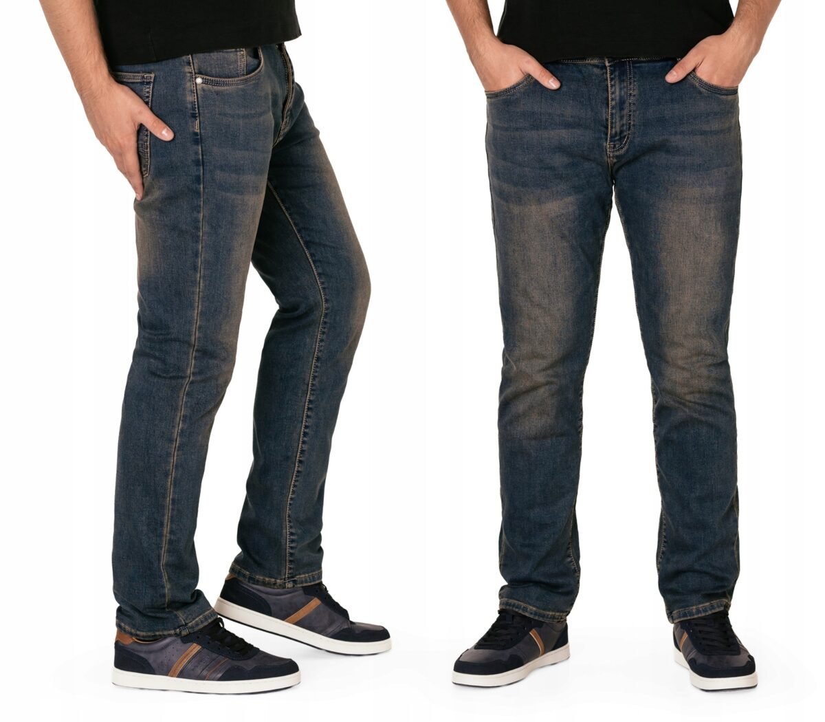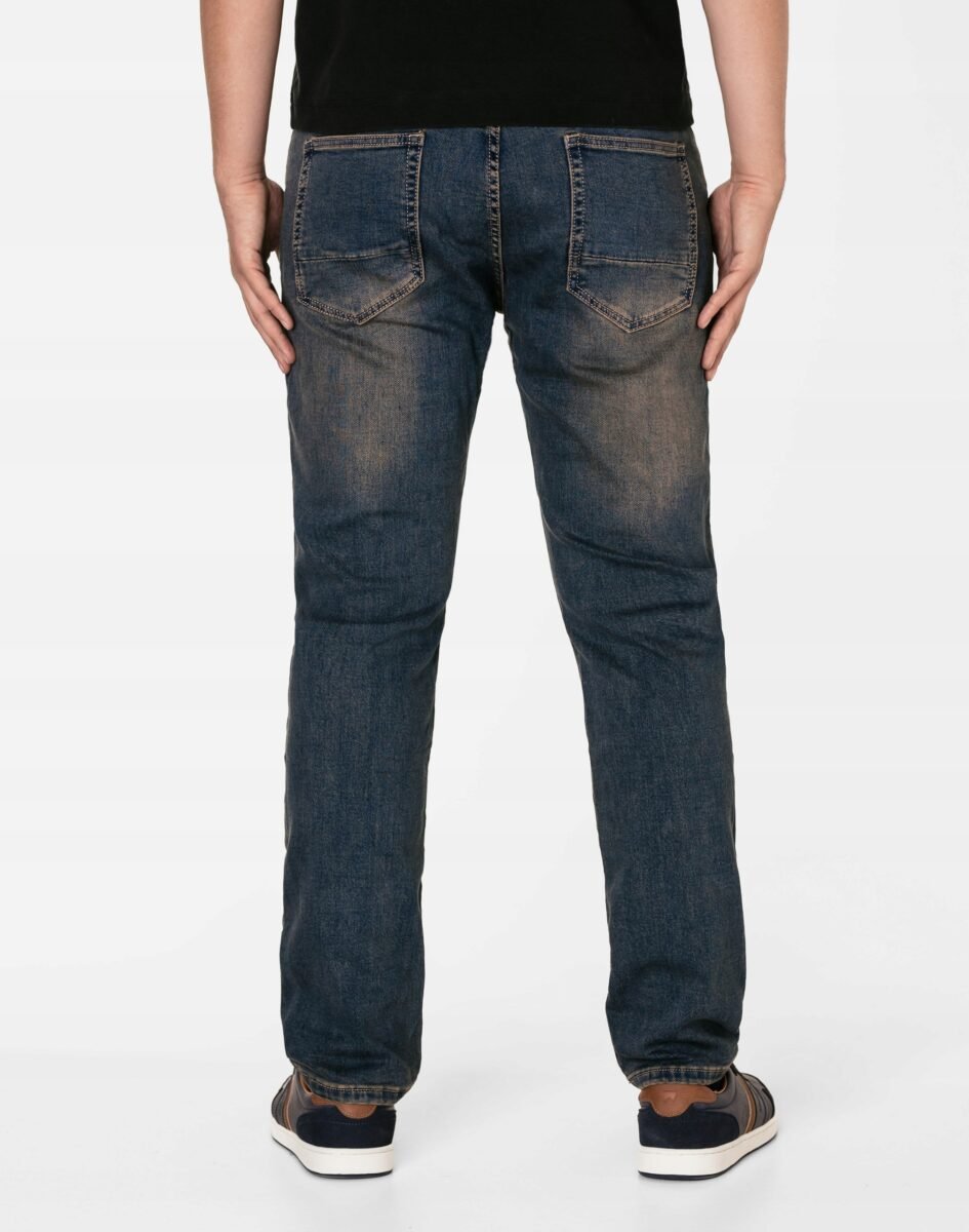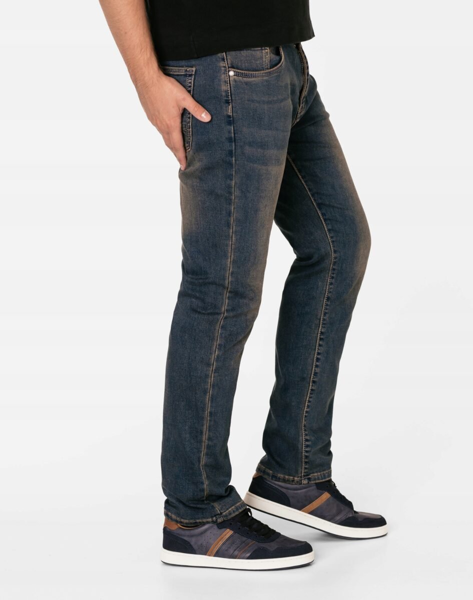 Granatowe jeansy męskie model #24051 z klasyczną prostą nogawką to klasyka wśród klasyki i jeden z najczęściej wybieranych modeli spodni. Wykonane z wysokiej jakości delikatnie elastycznej tkaniny jeansowej typu "Dark Blue Denim" średniej grubości z dodatkiem lycry (elastan) oraz modnymi efektami sprania, przetarciami i przebarwieniami w nieśmiertelnym stylu "used-look" (zużyty wygląd). Dzięki dodatkowi elastanu łatwo się je zakłada i są znacznie wygodniejsze od spodni które lycry nie mają. Poza tym bawełna ma tendencję do kurczenia się w praniu, dlatego lycra sprawia, że spodnie są wyjątkowo praktyczne i można je bez problemu założyć po wysuszeniu. Zapinane na kryty zamek błyskawiczny i metalowy guzik sygnowany logiem firmy. Z przodu mają 2 zaokrąglone kieszonki oraz mniejszą tzw. bilonówkę, a na tyle klasyczne kieszenie naszywane jak w typowych spodniach jeansowych. W pasie szlufki umożliwiające stylizacje z paskiem. Najbardziej podatne na uszkodzenia miejsca wzmocnione są dodatkowymi przeszyciami oraz małymi ozdobnymi nitami.