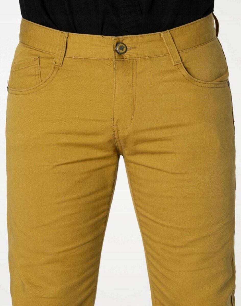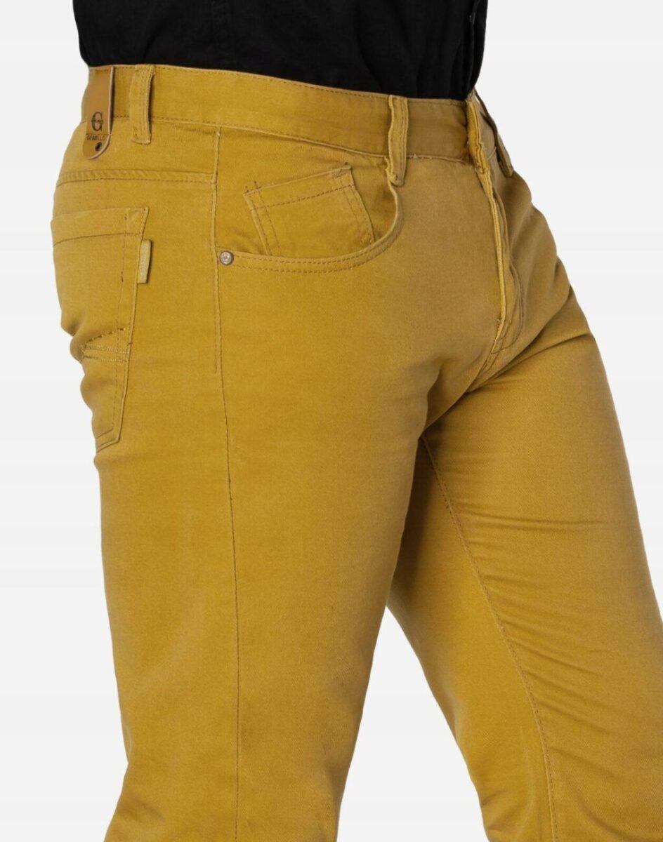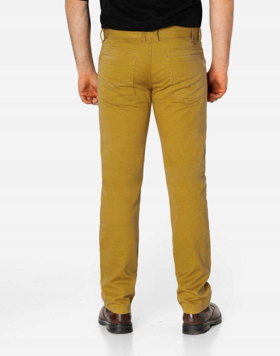 Wygodne i praktyczne podczas użytkowania spodnie męskie ze standardowym stanem i klasyczną lekko zwężaną nogawką to jeden z najczęściej wybieranych modeli spodni. Wykonane z wysokiej jakości trwałej i mocnej tkaniny 100% bawełnianej średniej grubości o gęstym, drobnym splocie i jednolitym wiosenno/letnim wybarwieniu. Zapinane są na kryty zamek błyskawiczny i metalowy guzik sygnowany logiem firmy. Z przodu mają dwie kieszonki zaokrąglone oraz mniejszą kieszonkę tzw. bilonówkę, a na tyle klasyczne kieszenie naszywane jak w typowych spodniach jeansowych. W pasie szlufki umożliwiające stylizacje z paskiem. Najbardziej podatne na uszkodzenia miejsca wzmocnione są dodatkowymi przeszyciami oraz nitami.