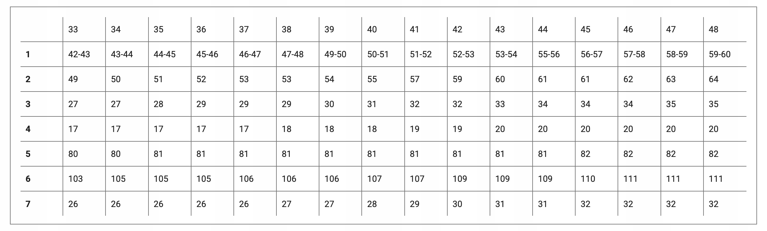 rozmiarszerokość w pasie (cm)szerokość w biodrach (cm)szerokość w udzie (cm)szerokość na dole nogawki (cm)długość nogawki od kroku (cm)długość nogawki zewnętrzna (cm)wysokość pasa (cm)
