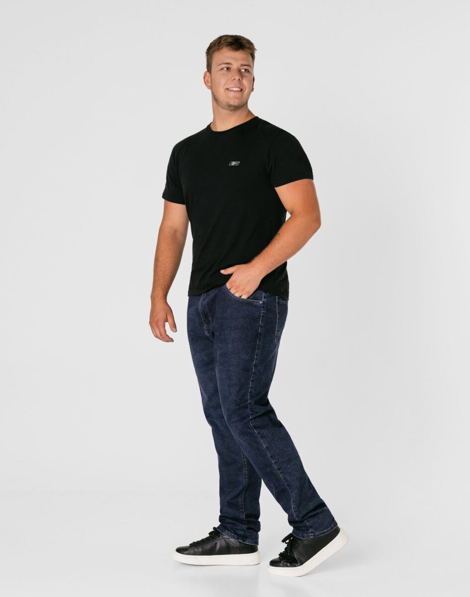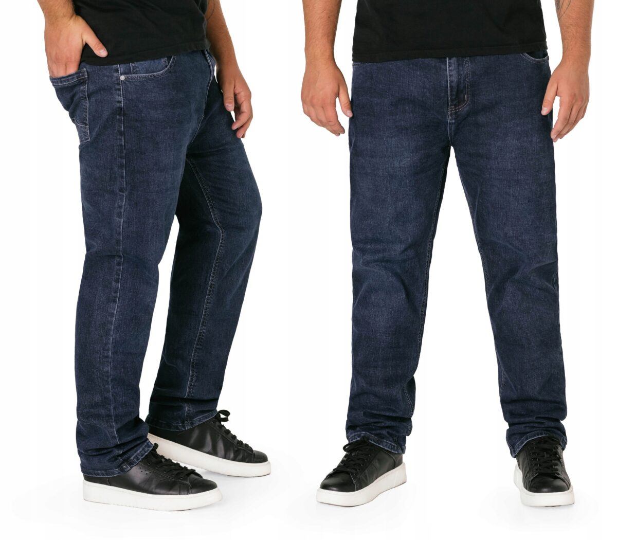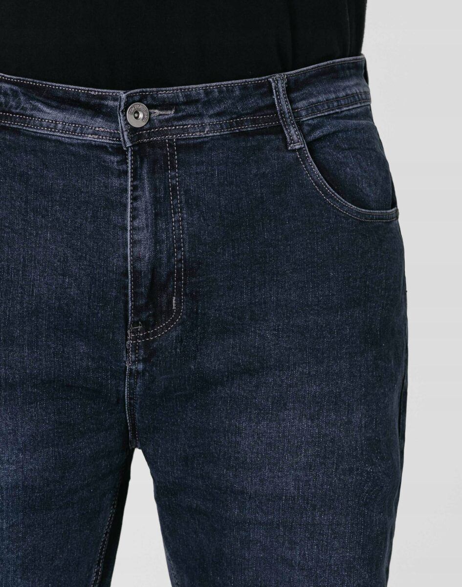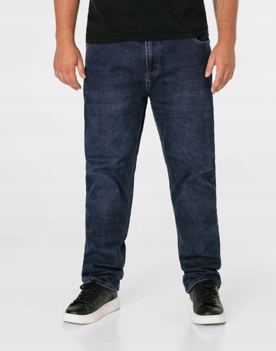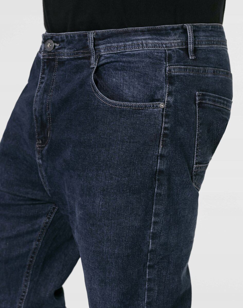 Klasyczne i ponadczasowe spodnie męskie jeansowe, umiarkowanie swobodne w biodrach, o lekko zwężanych nogawkach to jeden z najczęściej wybieranych przez mężczyzn modeli spodni. Wykonane z wysokiej jakości sprężystej, trwałej i mocnej tkaniny jeansowej w kolorze granatowym „Dark Blue” dzięki niewielkiemu dodatkowi poliestru (lycra) wyjątkowo wygodnej w użytkowaniu. Niewielki dodatek lycry sprawia, że spodnie są bardziej elastyczne, dobrze dopasowują się do sylwetki, i są bardzo komfortowe w użytkowaniu. Łatwo się je zakłada i są znacznie wygodniejsze od jeansów, które lycry nie mają. Poza tym bawełna ma tendencję do kurczenia się w praniu, dlatego lycra sprawia, że spodnie są wyjątkowo praktyczne i można je bez problemu założyć po wysuszeniu. Pozwalają na pełną swobodę ruchów, co daje wygodę przy siadaniu i zapewnia ogromny komfort noszenia. Zapinane na kryty zamek błyskawiczny i metalowy guzik sygnowany logiem firmy. Z przodu mają dwie zaokrąglone kieszonki oraz jedną mniejszą tzw. bilonówkę, a na tyle klasyczne naszywane kieszenie jak w typowych spodniach jeansowych. Najbardziej podatne na uszkodzenia miejsca wzmocnione są podwójnymi przeszyciami oraz metalowymi nitami. W pasie szlufki umożliwiające stylizacje z paskiem.