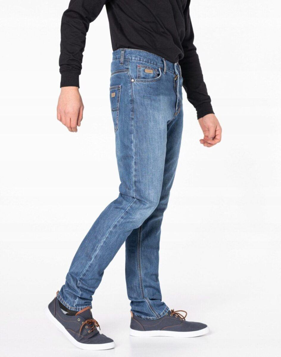 Jeansy męskie polskiej firmy HUNTER z modnym efektem sprania i przetarciami w nieśmiertelnym stylu „used-look”, w procesie produkcji poddane zostały specjalnym zabiegom postarzającym materiał, polegającym na wycieraniu, wypieraniu barwnika i tworzeniu efektownych przetarć. Uzyskane w ten sposób efektowne rozjaśnienia i wytarcia mają na celu wywołanie tak modnego efektu starych, długo noszonych jeansów. Wykonane z wysokiej jakości gęstej, trwałej i mocnej tkaniny jeansowej „Light Blue” z dodatkiem elastanu (streczu). Niewielki dodatek streczu sprawia, że spodnie są bardziej elastyczne co pozwala na pełną swobodę ruchów, daje komfort przy siadaniu i zapewnia ogromny komfort noszenia. Zapinane są na kryty zamek błyskawiczny i metalowy guzik sygnowany logiem firmy. Z przodu mają dwie kieszonki zaokrąglone oraz mniejszą kieszonkę tzw. bilonówkę, a na tyle klasyczne kieszenie naszywane jak w typowych spodniach jeansowych. W pasie szlufki umożliwiające stylizacje z paskiem. Najbardziej podatne na uszkodzenia miejsca wzmocnione są dodatkowymi przeszyciami oraz firmowymi nitami.