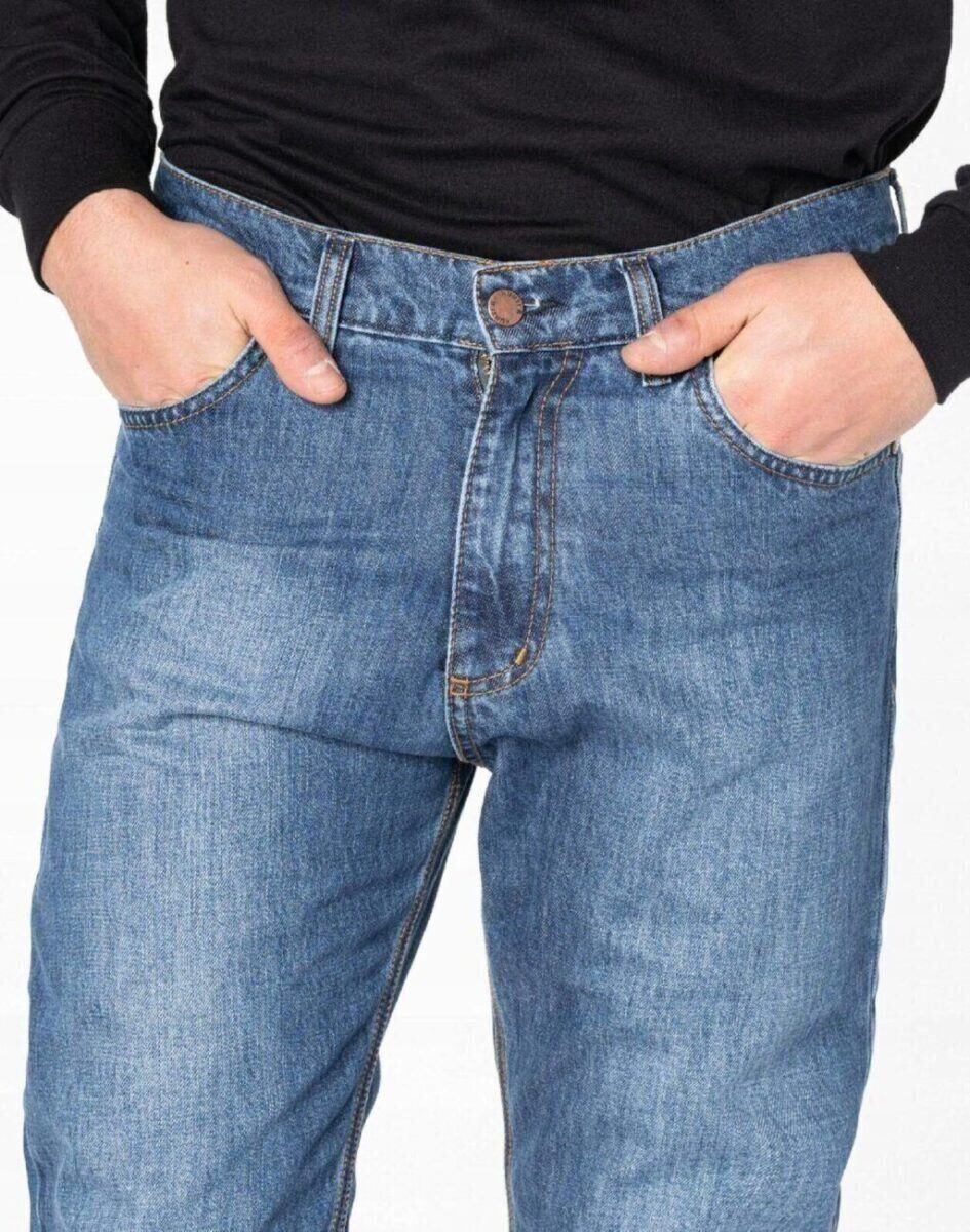 Jeansy męskie polskiej firmy HUNTER z modnym efektem sprania i przetarciami w nieśmiertelnym stylu „used-look”, w procesie produkcji poddane zostały specjalnym zabiegom postarzającym materiał, polegającym na wycieraniu, wypieraniu barwnika i tworzeniu efektownych przetarć. Uzyskane w ten sposób efektowne rozjaśnienia i wytarcia mają na celu wywołanie tak modnego efektu starych, długo noszonych jeansów. Wykonane z wysokiej jakości gęstej, trwałej i mocnej tkaniny jeansowej „Light Blue” z dodatkiem elastanu (streczu). Niewielki dodatek streczu sprawia, że spodnie są bardziej elastyczne co pozwala na pełną swobodę ruchów, daje komfort przy siadaniu i zapewnia ogromny komfort noszenia. Zapinane są na kryty zamek błyskawiczny i metalowy guzik sygnowany logiem firmy. Z przodu mają dwie kieszonki zaokrąglone oraz mniejszą kieszonkę tzw. bilonówkę, a na tyle klasyczne kieszenie naszywane jak w typowych spodniach jeansowych. W pasie szlufki umożliwiające stylizacje z paskiem. Najbardziej podatne na uszkodzenia miejsca wzmocnione są dodatkowymi przeszyciami oraz firmowymi nitami.
