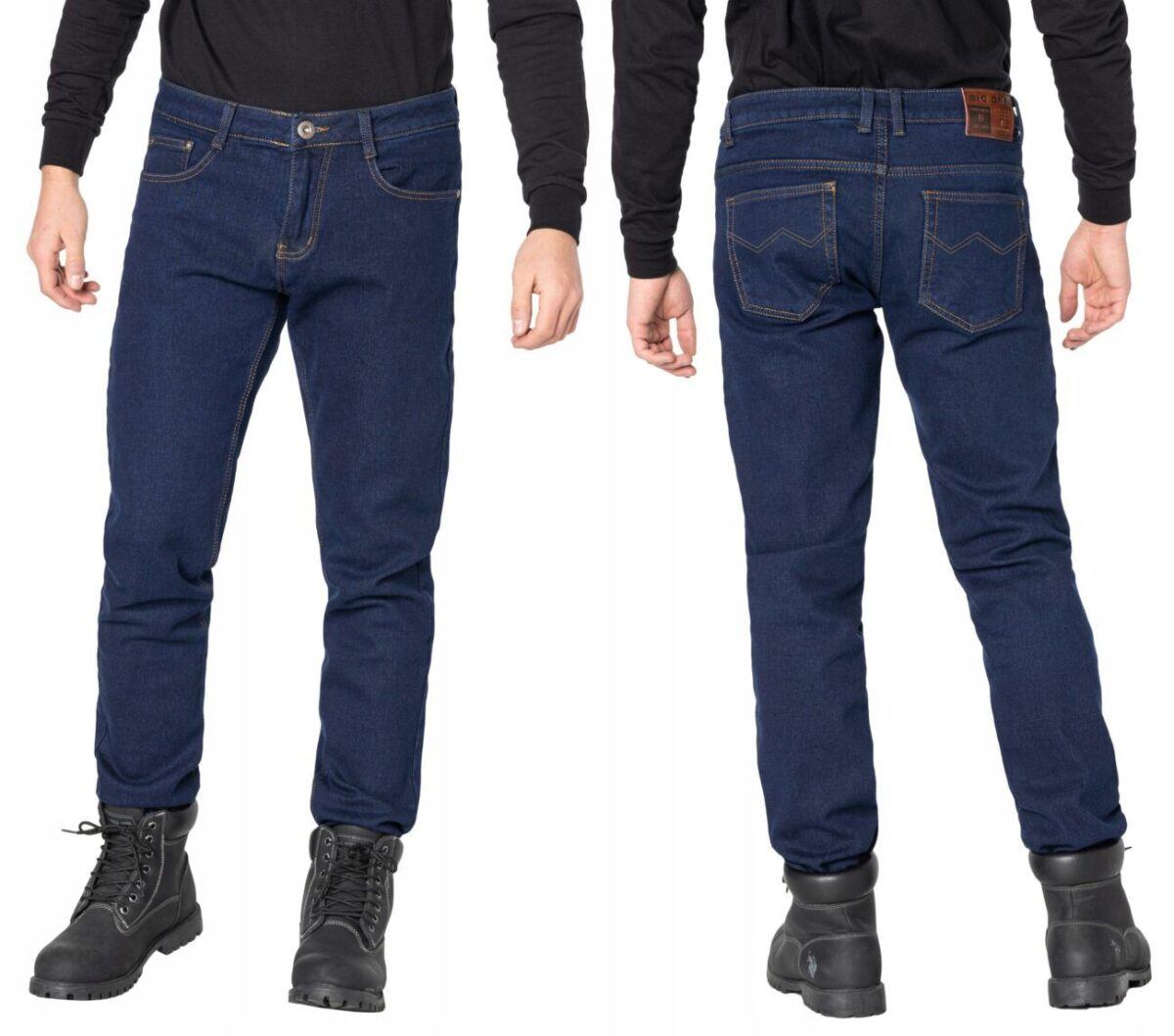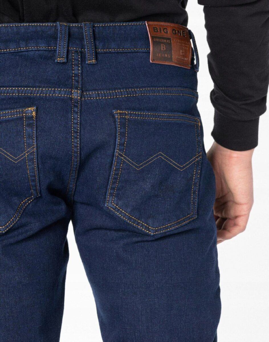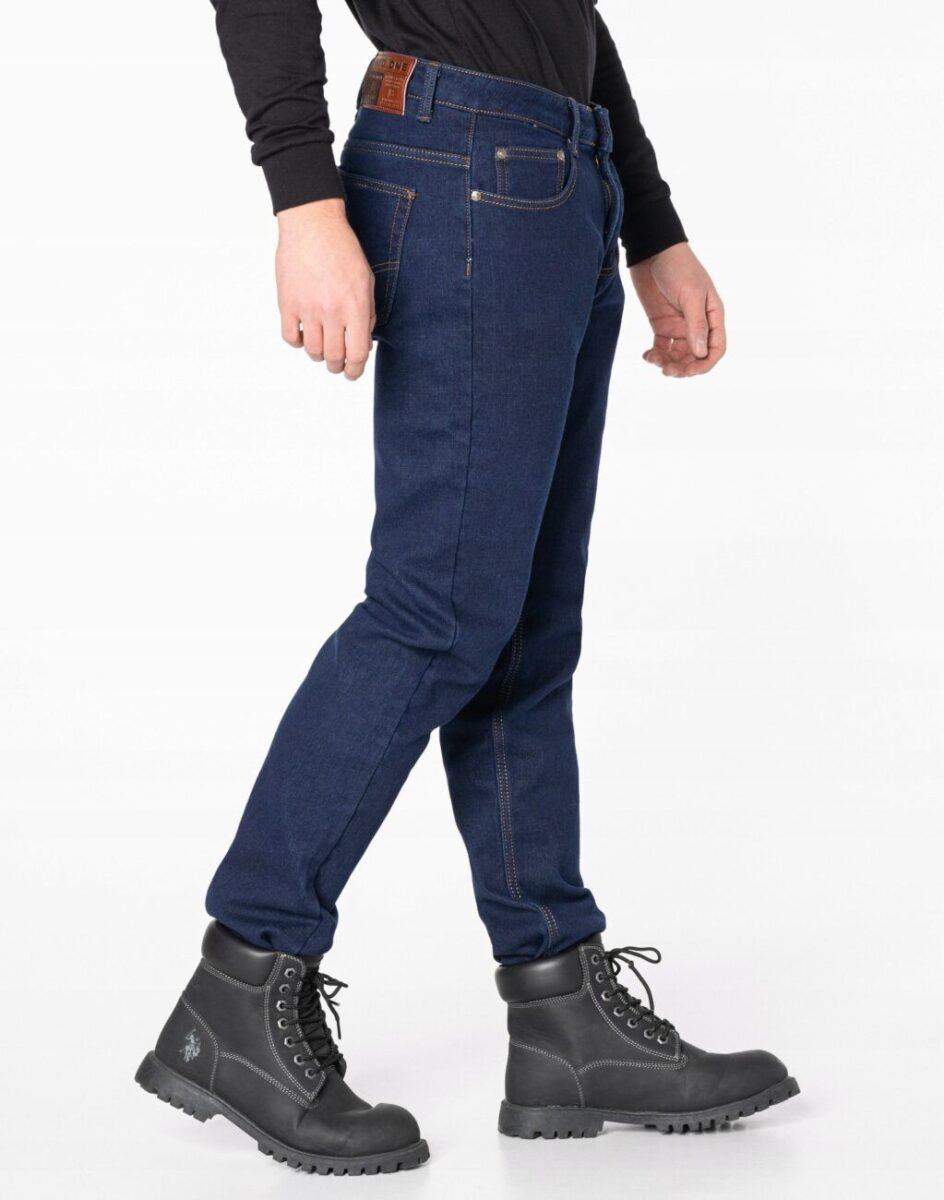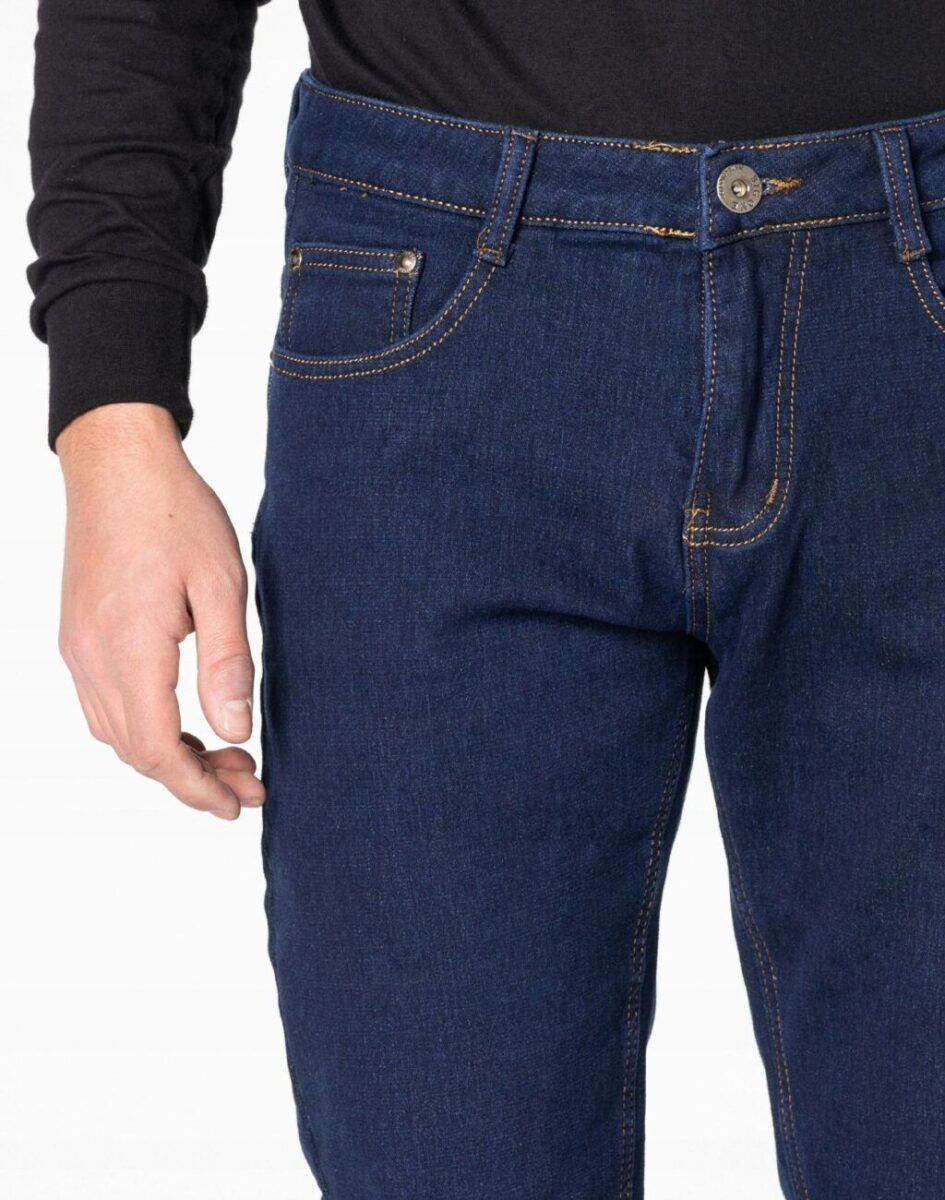 Klasyczne spodnie męskie jeansowe 088 ze standardowym stanem i prostą nogawką to jeden z najczęściej wybieranych przez mężczyzn modeli spodni. Wykonane z wysokiej jakości gęstej, trwałej i mocnej tkaniny bawełnianej o jednolitym granatowym wybarwieniu „Dark Blue”. Zapinane są na kryty zamek błyskawiczny i metalowy guzik sygnowany logiem firmy. Z przodu mają dwie zaokrąglone kieszonki oraz jedną mniejszą tzw. bilonówkę, a na tyle klasyczne naszywane kieszenie jak w typowych spodniach jeansowych. Najbardziej podatne na uszkodzenia miejsca wzmocnione są dodatkowymi przeszyciami oraz metalowymi nitami. W pasie szlufki umożliwiające stylizacje z paskiem.