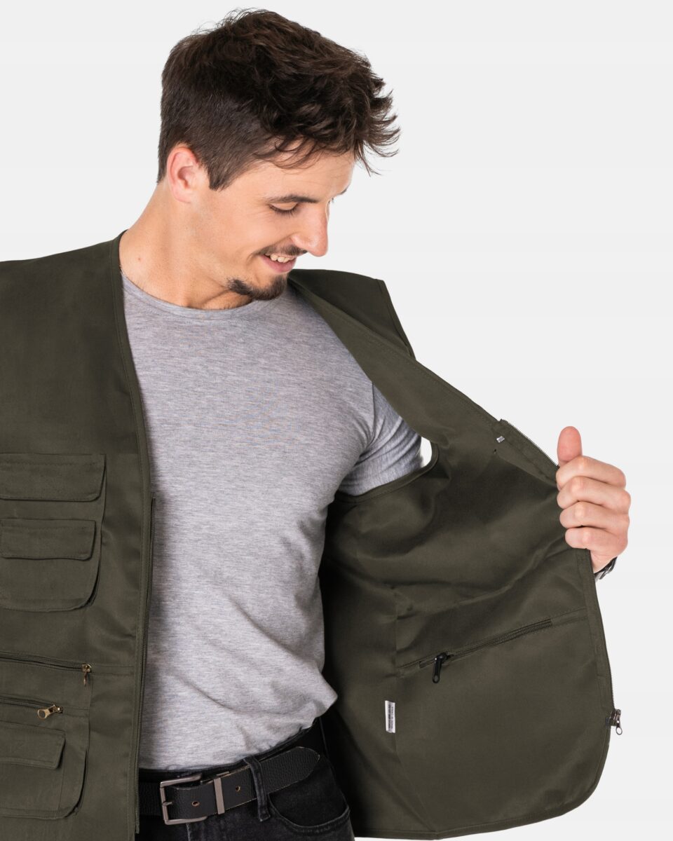 Sportowa kamizelka męska typu SAFARI o wszechstronnym przeznaczeniu to ulubione okrycie wierzchnie prawdziwych mężczyzn, bo jest wyjątkowo wygodna a dzięki zastosowaniu wielu kieszeni także bardzo praktyczna. Z przodu kieszenie zasuwane są na zamki błyskawiczne i zapinane na rzepy a dwie wewnętrzne kieszenie zasuwane są na zamki błyskawiczne. Uszyta z mocnej i sprężystej tkaniny o drobnym i gęstym, zapewniającym dużą wytrzymałość splocie, co zwiększa odporność na uszkodzenia mechaniczne oraz to że jest wyjątkowo odporna na plamy. To również gwarancja zwiększonej wytrzymałości tkaniny oraz stabilności rozmiarów i koloru nawet po wielokrotnym praniu. Zapinana na skrócony zamek błyskawiczny a jej szerokość można regulować metalowymi klamerkami na bokach. Krawędzie kamizelki obszyto lamówką zabezpieczającą materiał przed ewentualnym strzępieniem. Ergonomiczny krój kamizelki nie ogranicza swobody ruchów a właściwa dla odzieży sportowej gramatura wpływają pozytywnie na wygodę użytkowania.