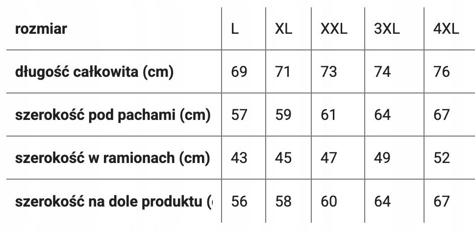 Rozmiar podany na metce przez producenta: 3XL (Sprawdź pozostałe wymiary w tabeli)