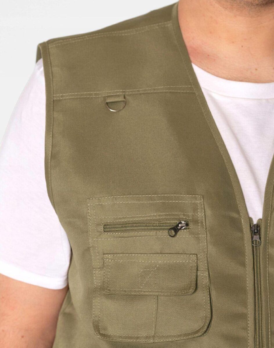 Sportowa kamizelka męska typu SAFARI o wszechstronnym przeznaczeniu to ulubione okrycie wierzchnie prawdziwych mężczyzn, bo jest wyjątkowo wygodna a dzięki zastosowaniu wielu kieszeni także bardzo praktyczna. Z przodu kieszenie zasuwane są na zamki i zapinane na rzepy a cztery wewnętrzne kieszenie zasuwane są na zamki błyskawiczne. Uszyta z mocnej tkaniny poliestrowej o gęstym, zapewniającym dużą wytrzymałość splocie, co zwiększa odporność na uszkodzenia mechaniczne oraz szybkość transportu wilgoci z powierzchni ciała na zewnątrz. Tkanina gwarantuje świetną przepuszczalność powietrza, wchłanianie potu i oddychanie skóry. To również gwarancja szybkiego schnięcia, zwiększonej wytrzymałości tkaniny oraz stabilności rozmiarów i koloru po wielokrotnym praniu. Zapinana na skrócony zamek błyskawiczny a jej szerokość można regulować metalowymi klamerkami na bokach. Krawędzie kamizelki obszyto lamówką zabezpieczającą materiał przed ewentualnym strzępieniem. Ergonomiczny krój kamizelki nie ogranicza swobody ruchów a właściwa dla odzieży sportowe gramatura wpływają pozytywnie na wygodę użytkowania.