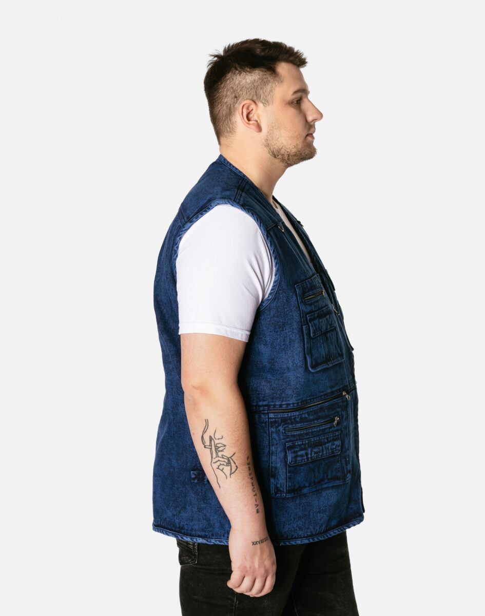 Jeansowa kamizelka męska typu SAFARI o wszechstronnym przeznaczeniu to ulubione okrycie wierzchnie prawdziwych mężczyzn, bo jest wyjątkowo wygodna a dzięki zastosowaniu wielu kieszeni także bardzo praktyczna. Z przodu kieszenie zasuwane są na zamki błyskawiczne i zapinane na rzepy a cztery wewnętrzne kieszenie zasuwane są na zamki błyskawiczne. Uszyta z mocnej tkaniny jeansowej o gęstym, zapewniającym dużą wytrzymałość splocie, co zwiększa odporność na uszkodzenia mechaniczne oraz szybkość transportu wilgoci z powierzchni ciała na zewnątrz. Tkanina jeansowa gwarantuje świetną przepuszczalność powietrza, wchłanianie potu i oddychanie skóry. To również gwarancja zwiększonej wytrzymałości tkaniny oraz stabilności rozmiarów i koloru po wielokrotnym praniu. Zapinana na skrócony zamek błyskawiczny a jej szerokość można regulować metalowymi klamerkami na bokach. Krawędzie kamizelki obszyto lamówką zabezpieczającą materiał przed ewentualnym strzępieniem. Ergonomiczny krój kamizelki nie ogranicza swobody ruchów a właściwa dla odzieży sportowej gramatura wpływają pozytywnie na wygodę użytkowania.