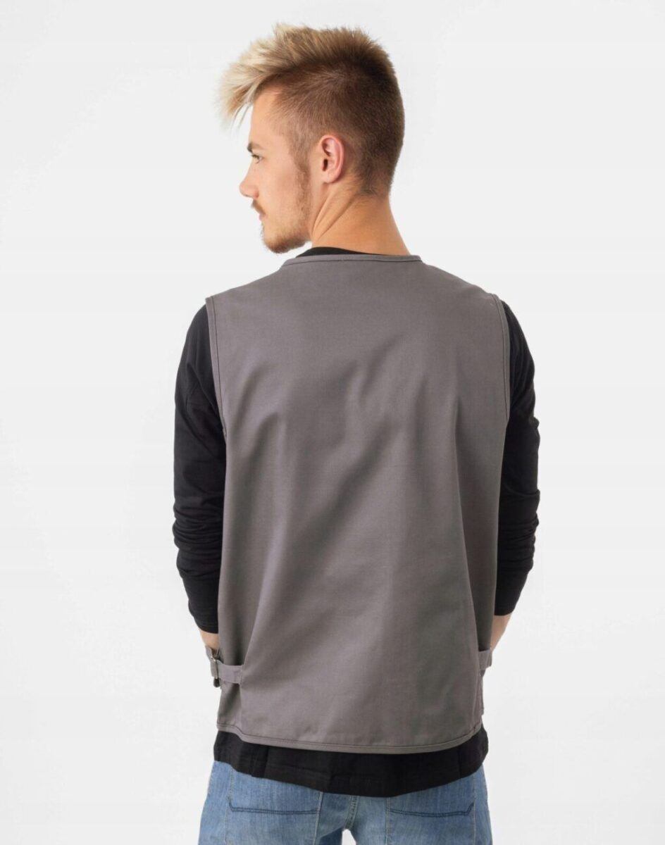 Sportowa kamizelka męska typu SAFARI o wszechstronnym przeznaczeniu to ulubione okrycie wierzchnie prawdziwych mężczyzn, bo jest wyjątkowo wygodna a dzięki zastosowaniu wielu kieszeni także bardzo praktyczna. Z przodu kieszenie zasuwane są na zamki i zapinane na rzepy a dwie duże wewnętrzne kieszenie zasuwane są na zamki błyskawiczne. Uszyta z mocnej tkaniny będącej mieszanką bawełny i poliestru o gęstym, zapewniającym dużą wytrzymałość splocie, co zwiększa odporność na uszkodzenia mechaniczne oraz szybkość transportu wilgoci z powierzchni ciała na zewnątrz. Naturalna bawełna gwarantuje świetną przepuszczalność powietrza, wchłanianie potu i oddychanie skóry. Dodatek poliestru to gwarancja szybkiego schnięcia, zwiększonej wytrzymałości tkaniny oraz stabilności rozmiarów i koloru po wielokrotnym praniu. Zapinana na skrócony zamek błyskawiczny a jej szerokość można regulować metalowymi klamerkami na bokach. Krawędzie kamizelki obszyto lamówką zabezpieczającą materiał przed ewentualnym strzępieniem. Ergonomiczny krój kamizelki nie ogranicza swobody ruchów a właściwe dla odzieży sportowej proporcje surowcowe i niewielka gramatura wpływają pozytywnie na wygodę użytkowania.