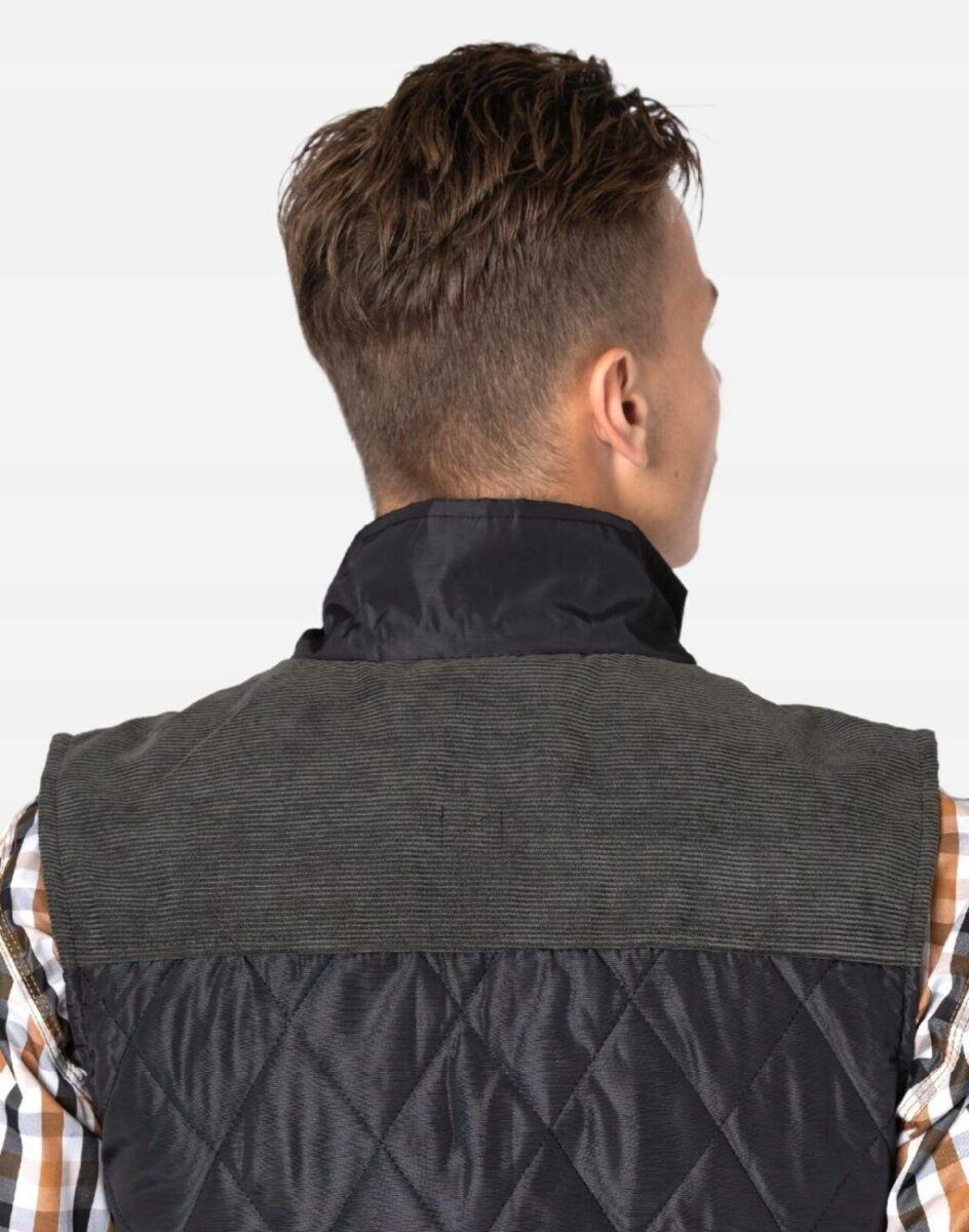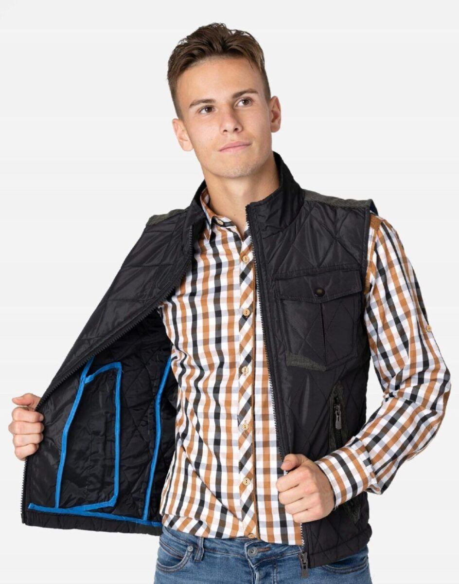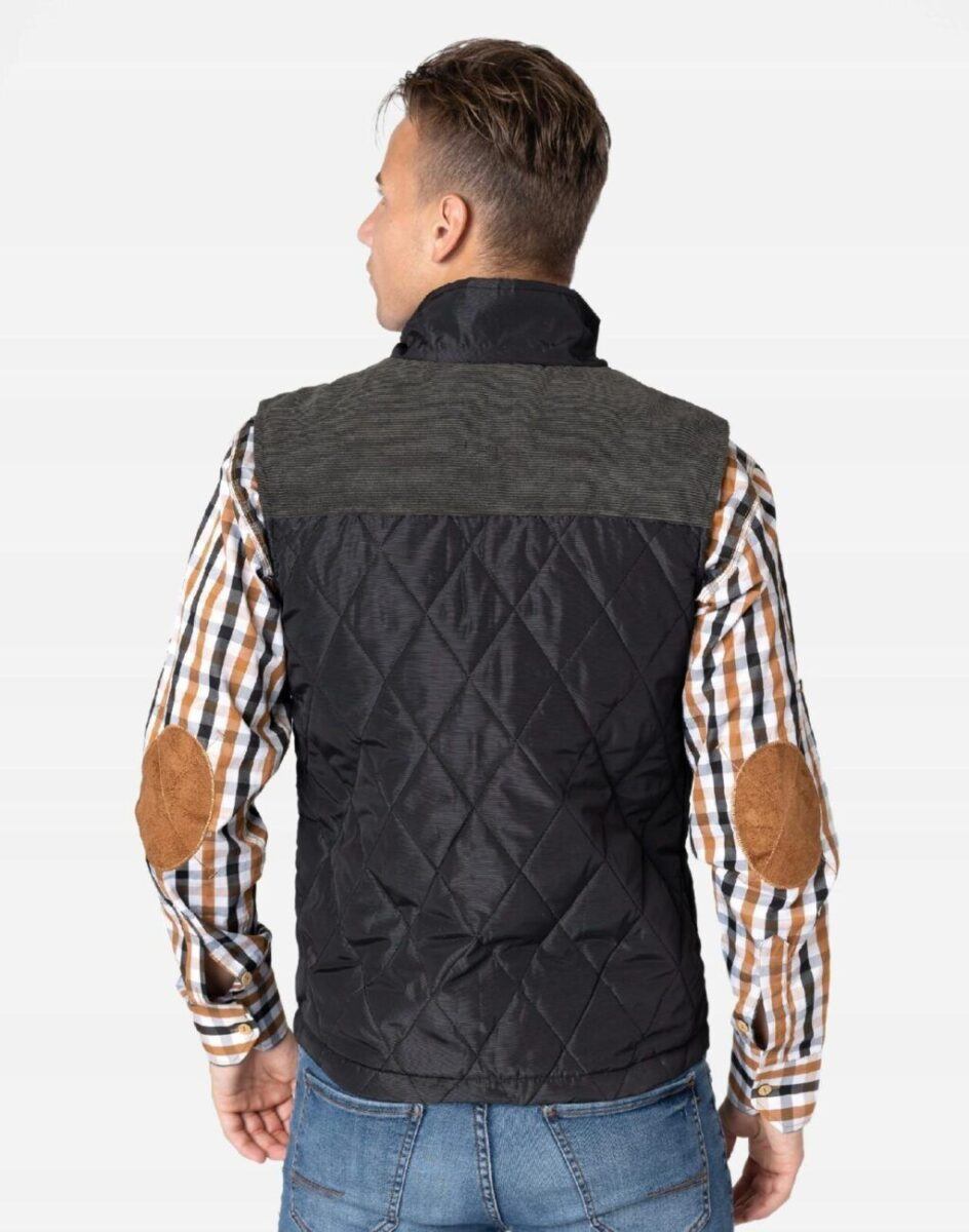 Kamizelka jest efektownie pikowana, zasuwana na zamek błyskawiczny i lekko ocieplona w całości puchem syntetycznym. Wysoki kołnierz/stójka zasłania szyję i chroni gardło, a często zastępuje nawet szalik co jest bardzo wygodne i skutecznie chroni przed zimnem i wiatrem. Z przodu kamizelki dwie wpuszczane kieszenie na dłonie zasuwane na zamki błyskawiczne. Na lewej piersi kieszeń naszywana kryta patką zapinana na napę. Długość do bioder, która z powodzeniem zakrywa części ciała wrażliwe na chłód jak plecy na wysokości nerek. Materiał zewnętrzny jest wiatroszczelny i posiada właściwości odpychające wodę. Kamizelka pikowana jest w najmodniejsze obecnie charakterystyczne skośne romby tworzące przestrzenny układ paneli prezentowany szeroko na modowych blogach. Wewnętrzna strona kamizelki wykończona jest pikowaną materiałową podszewką i przeszywana kontrastowymi pomarańczowymi lamówkami. Efektowne sztruksowe wstawki dodają jej niepowtarzanego sportowo-casualowego charakteru.