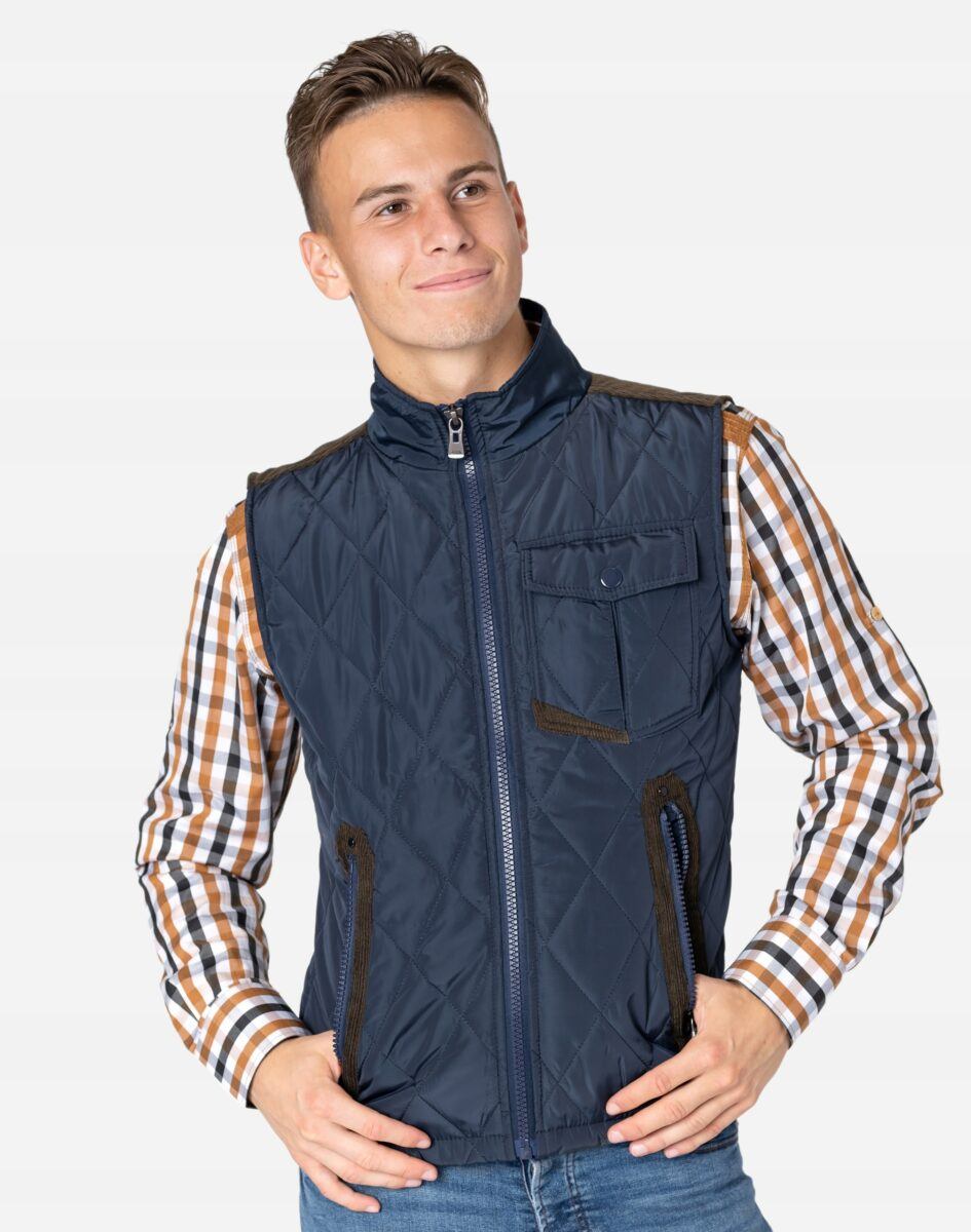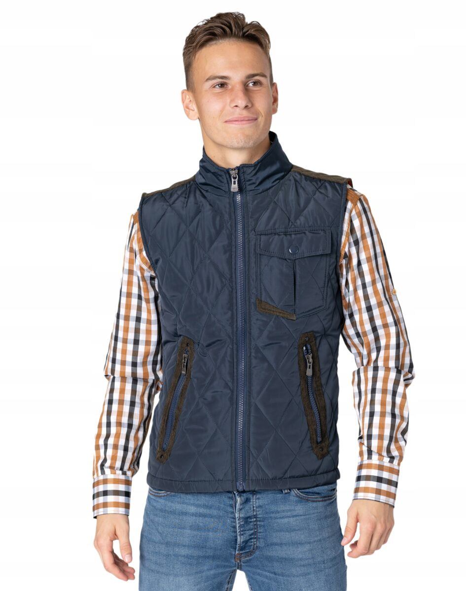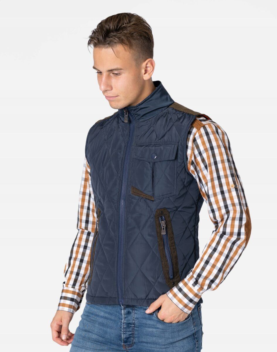 Kamizelka jest efektownie pikowana, zasuwana na zamek błyskawiczny i lekko ocieplona w całości puchem syntetycznym. Wysoki kołnierz/stójka zasłania szyję i chroni gardło, a często zastępuje nawet szalik co jest bardzo wygodne i skutecznie chroni przed zimnem i wiatrem. Z przodu kamizelki dwie wpuszczane kieszenie na dłonie zasuwane na zamki błyskawiczne. Na lewej piersi kieszeń naszywana kryta patką zapinana na napę. Długość do bioder która z powodzeniem zakrywa części ciała wrażliwe na chłód jak plecy na wysokości nerek. Materiał zewnętrzny jest wiatroszczelny i posiada właściwości odpychające wodę. Kamizelka pikowana jest w najmodniejsze obecnie charakterystyczne skośne romby tworzące przestrzenny układ paneli prezentowany szeroko na modowych blogach. Wewnętrzna strona kamizelki wykończona jest pikowaną materiałową podszewką i przeszywana kontrastowymi pomarańczowymi lamówkami. Efektowne sztruksowe wstawki dodają jej niepowtarzanego sportowo-casualowego charakteru.