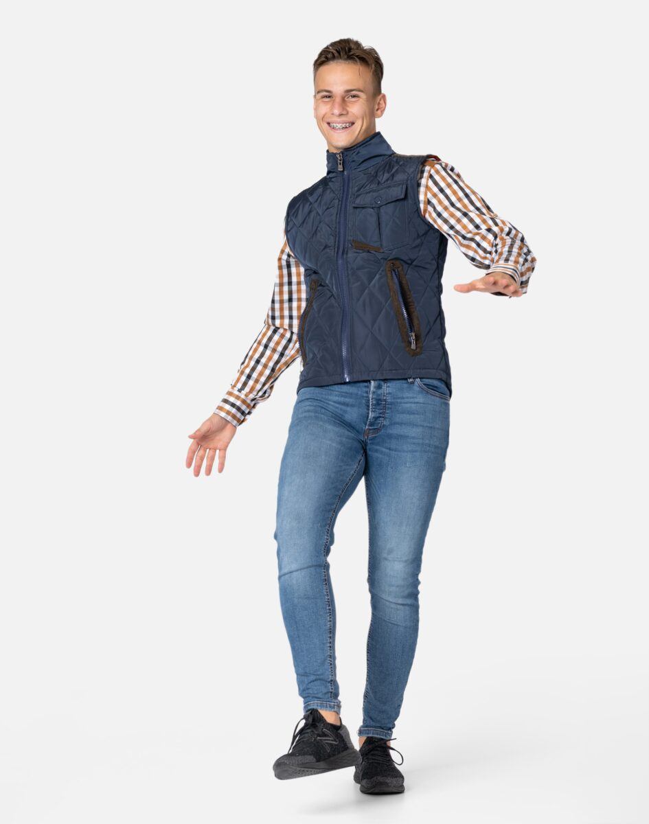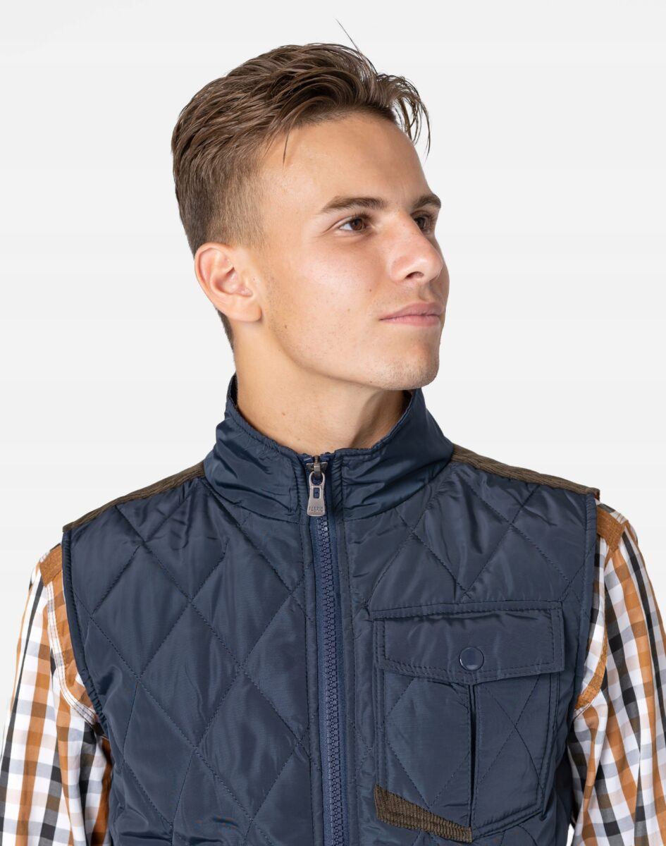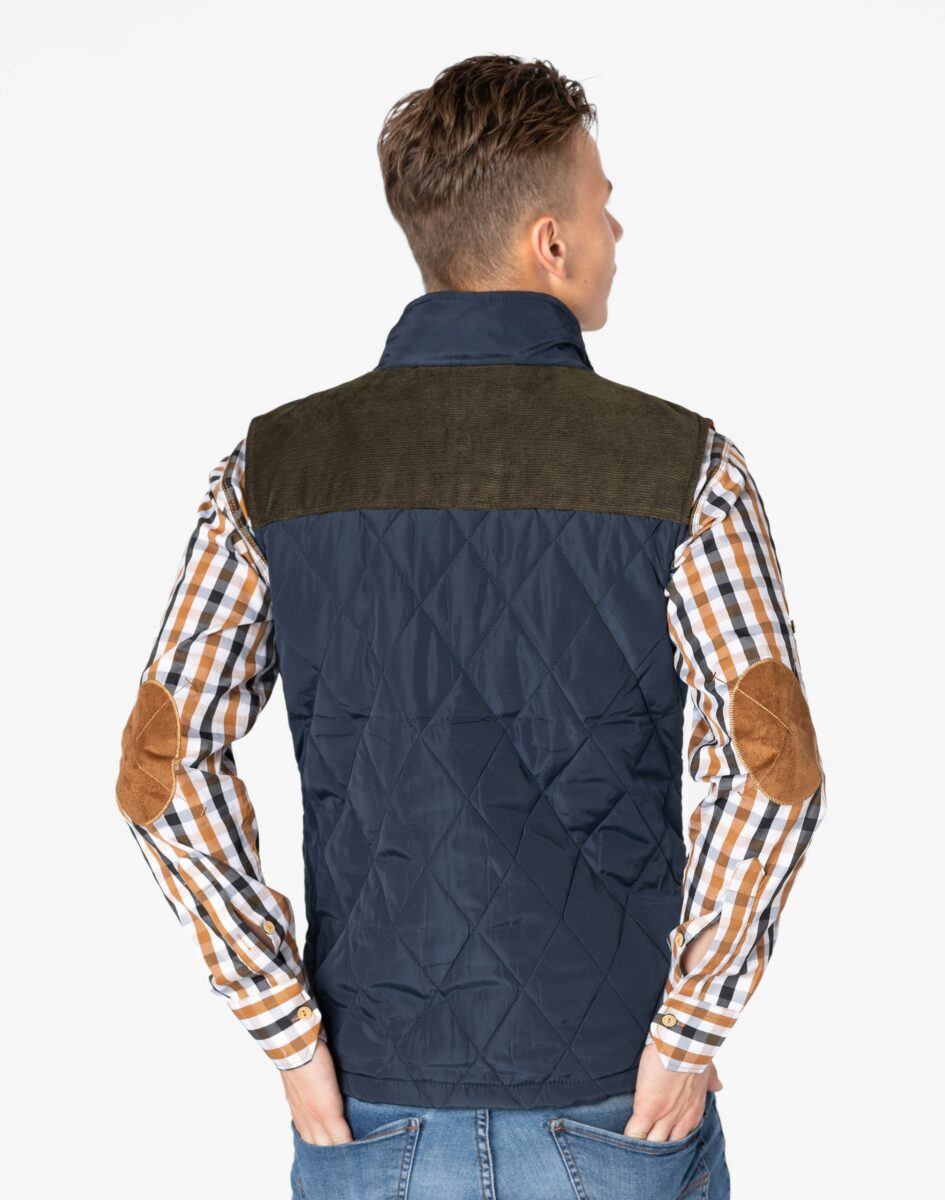 Kamizelka jest efektownie pikowana, zasuwana na zamek błyskawiczny i lekko ocieplona w całości puchem syntetycznym. Wysoki kołnierz/stójka zasłania szyję i chroni gardło, a często zastępuje nawet szalik co jest bardzo wygodne i skutecznie chroni przed zimnem i wiatrem. Z przodu kamizelki dwie wpuszczane kieszenie na dłonie zasuwane na zamki błyskawiczne. Na lewej piersi kieszeń naszywana kryta patką zapinana na napę. Długość do bioder która z powodzeniem zakrywa części ciała wrażliwe na chłód jak plecy na wysokości nerek. Materiał zewnętrzny jest wiatroszczelny i posiada właściwości odpychające wodę. Kamizelka pikowana jest w najmodniejsze obecnie charakterystyczne skośne romby tworzące przestrzenny układ paneli prezentowany szeroko na modowych blogach. Wewnętrzna strona kamizelki wykończona jest pikowaną materiałową podszewką i przeszywana kontrastowymi pomarańczowymi lamówkami. Efektowne sztruksowe wstawki dodają jej niepowtarzanego sportowo-casualowego charakteru.