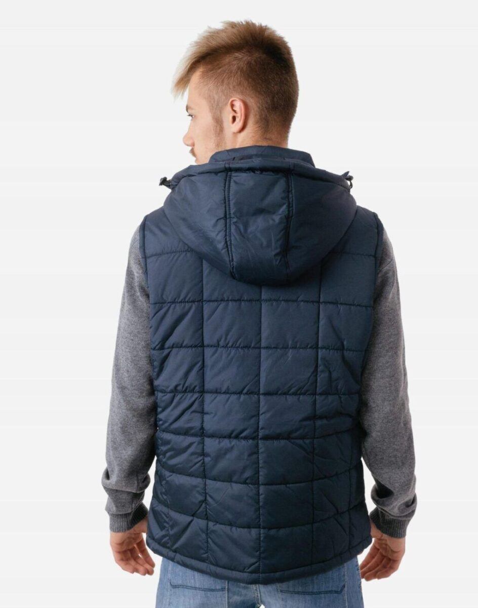 Kamizelka jest efektownie pikowana, zasuwana na zamek błyskawiczny i ocieplona w całości puchem syntetycznym. Posiada dwie zewnętrzne wpuszczane kieszenie na dłonie zasuwane na wodoodporne zamki błyskawiczne oraz wewnętrzną wpuszczaną kieszonkę na lewej piersi na portfel, telefon kom. dokumenty itp. Odpinany, ocieplony kaptur z możliwością połączenia go za pomocą rzepów z kołnierzem osłoni Twoją szyję i głowę przed deszczem, chłodem i wiatrem. Wysoki kołnierz/stójka skutecznie dodatkowo chroni podbródek i szyję a często zastępuje nawet szalik co jest bardzo wygodne. Długość do bioder, która z powodzeniem zakrywa części ciała wrażliwe na chłód jak plecy na wysokości nerek. Wewnętrzna strona kamizelki wykończona jest materiałową podszewką.